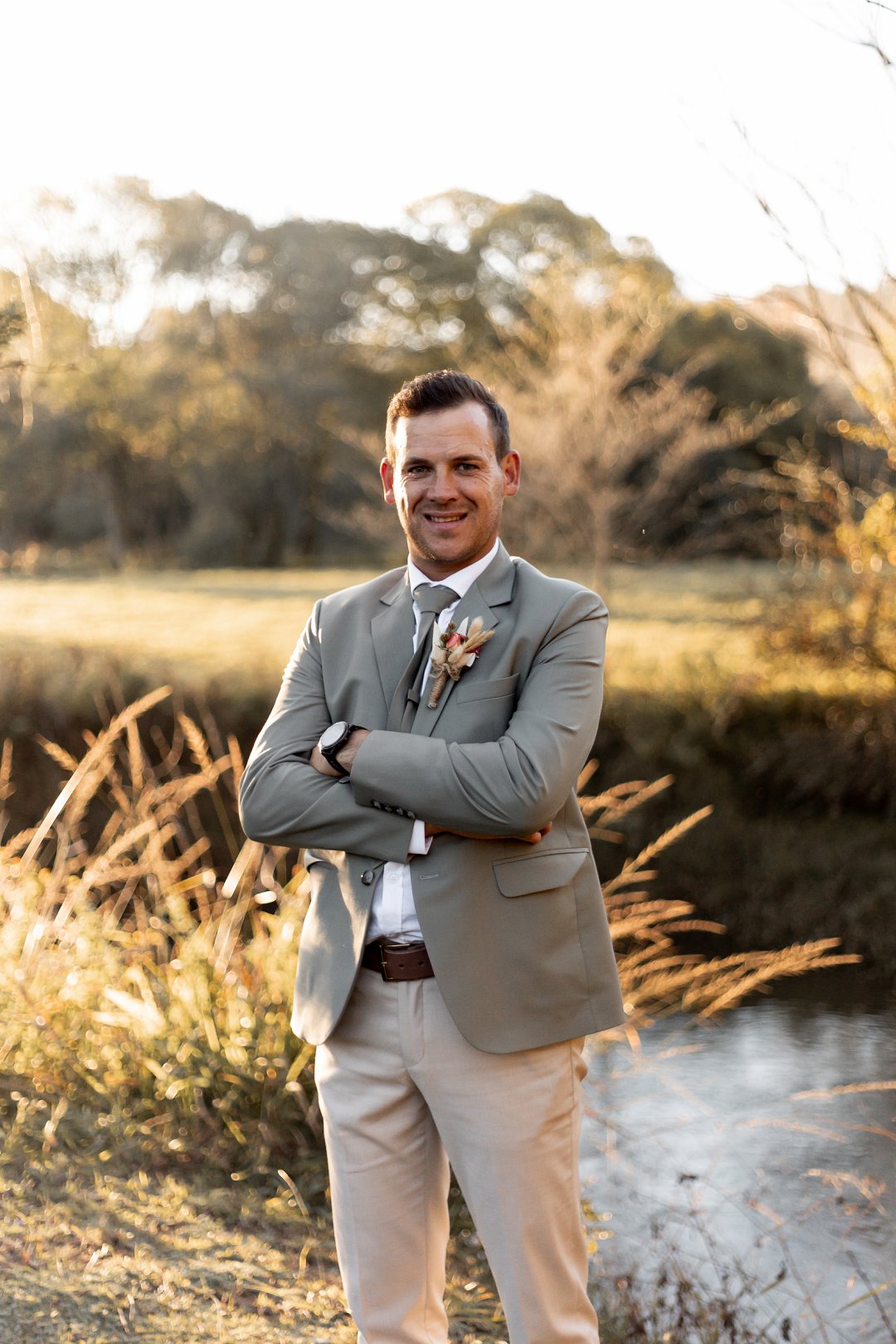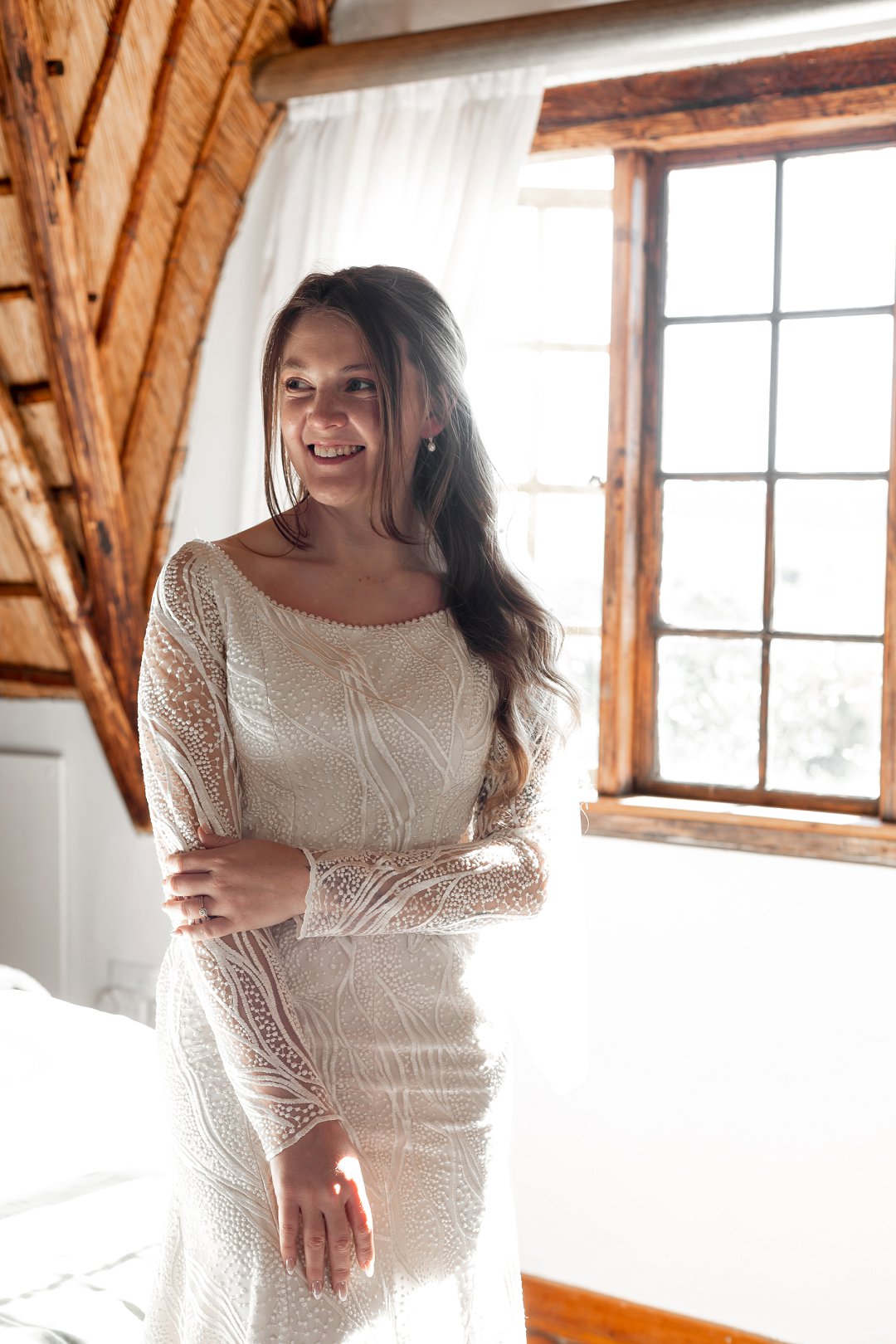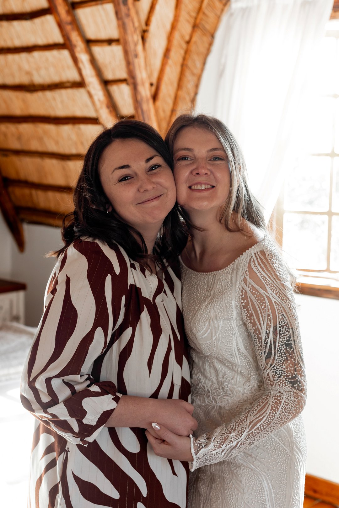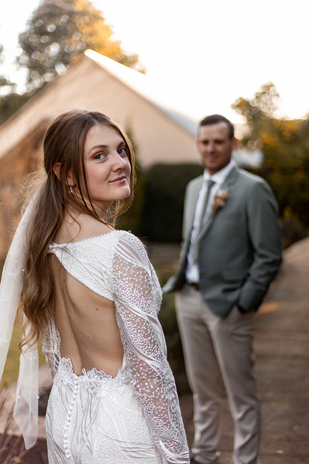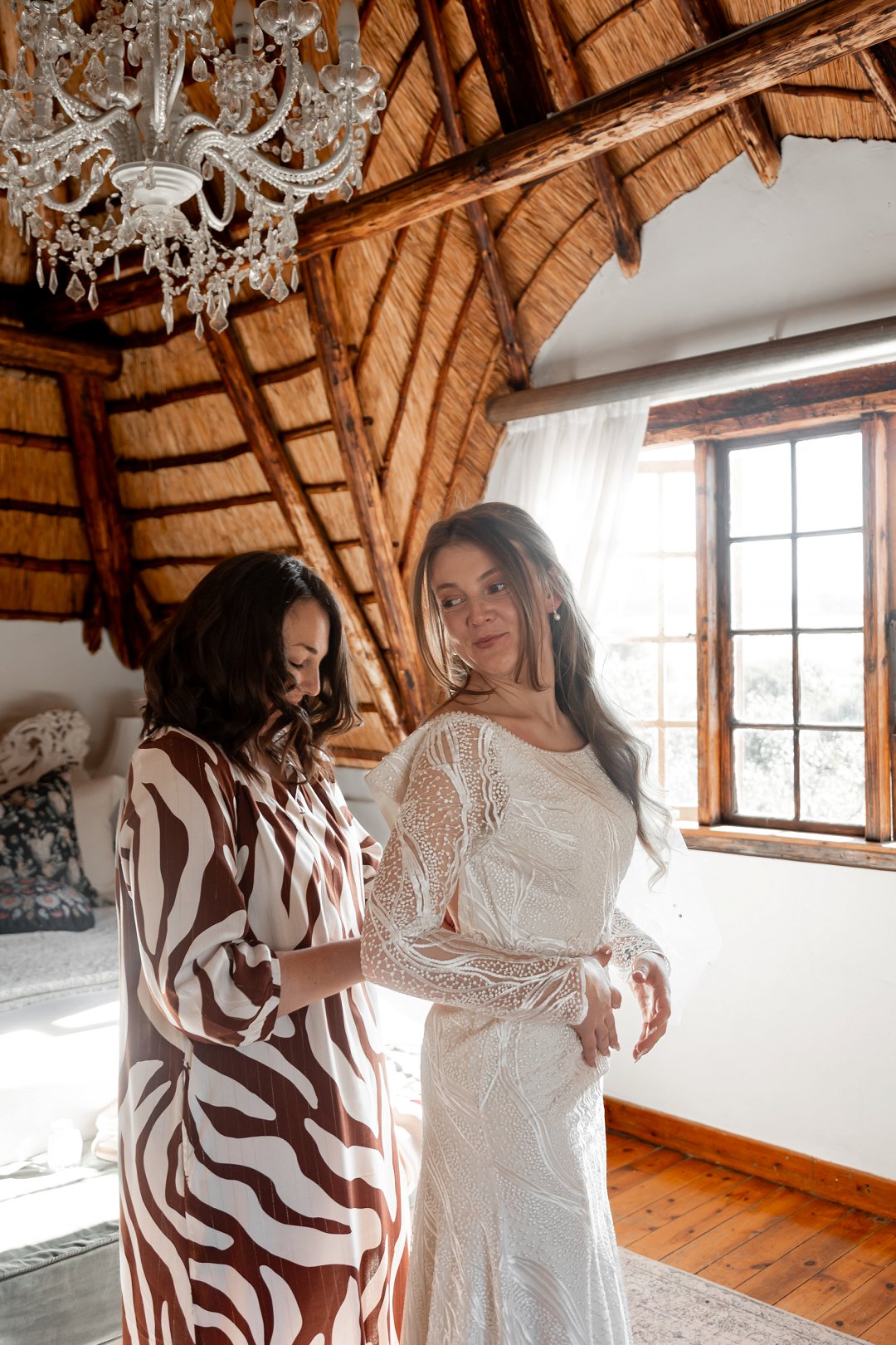 Chanell het almal se asem weggeslaan in haar pragtige trourok, versier met fyn kralewerk en elegante lang moue. Die toonbeeld van styl en romanse vir ’n wintertroue. Pierre het ewe sjarmant gelyk in sy stylvolle ligte broek, sagte groen baadjie en bypassende das, ’n kleurkombinasie wat perfek by die atmosfeer van hul betowerende dag gepas het.