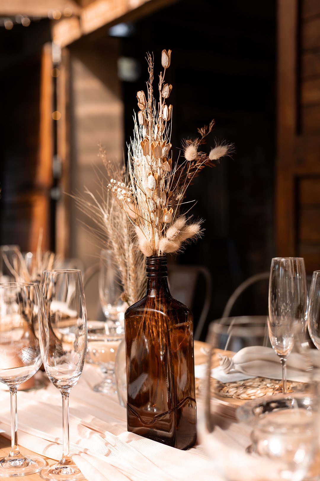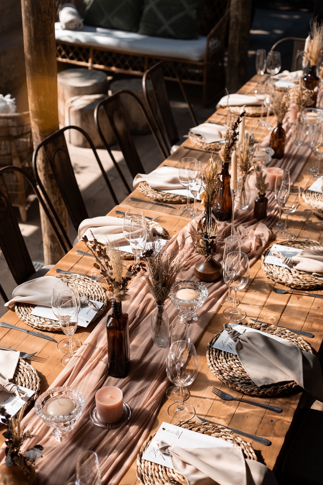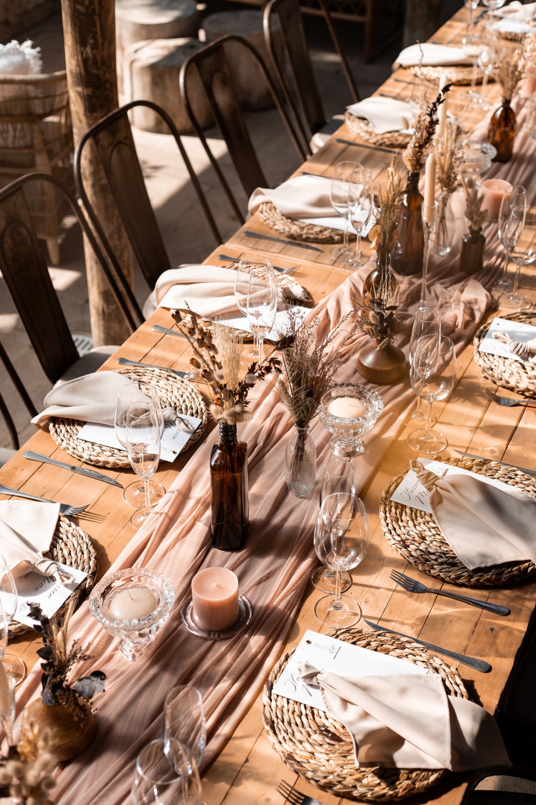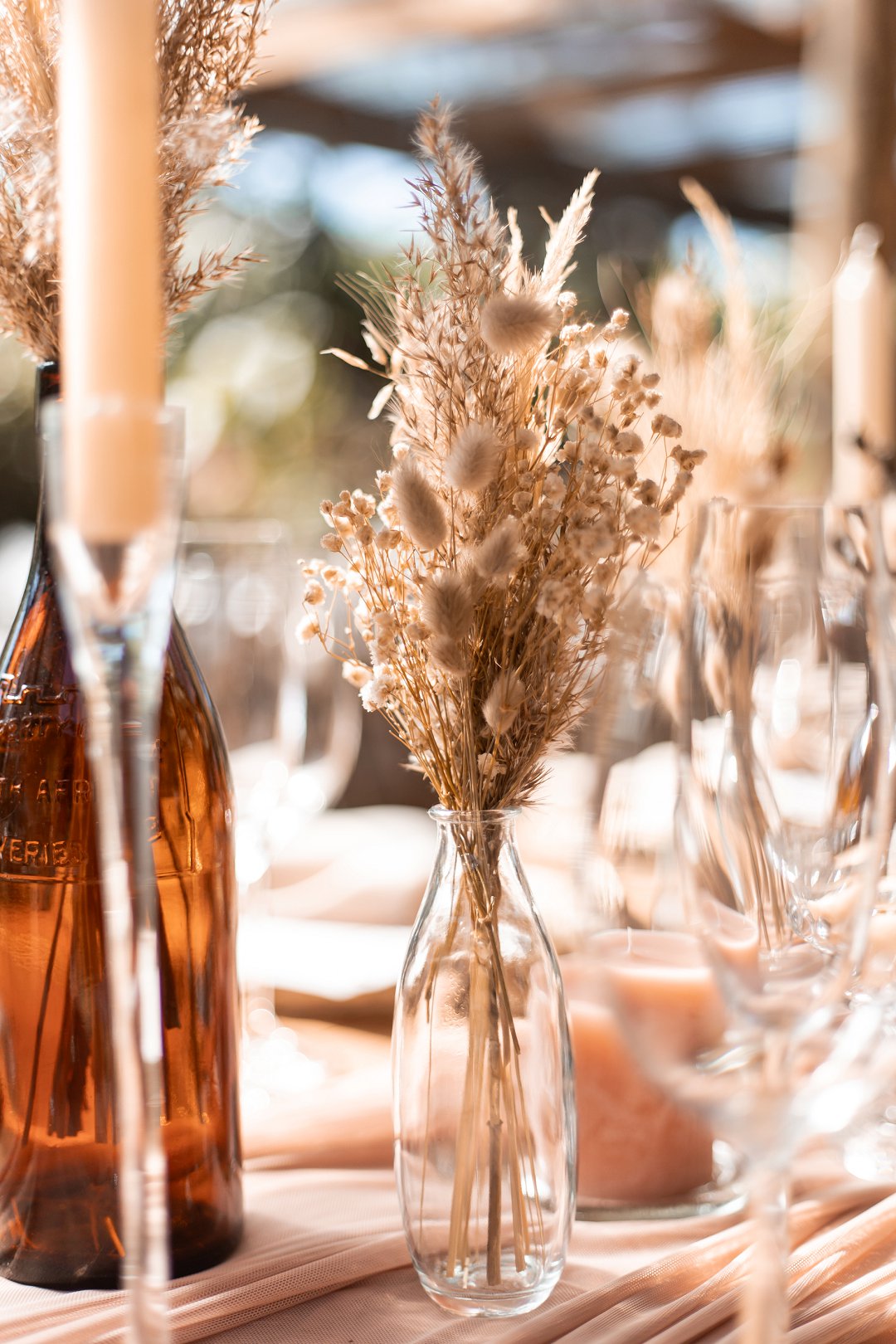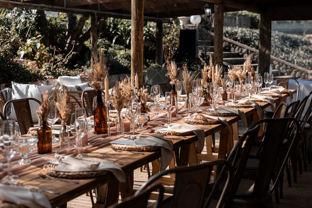 Die onthaal was intiem en gesellig, met familie en vriende wat om ’n lang houttafel saamgekuier het. ’n Ligpienk tafelloper, rottang plekmatjies en bruinerige potjies vol blomme het die dekor ’n knus winter gevoel gegee. Die gedroogde elemente het pragtig ingepas en ’n balans geskep tussen natuurlik en elegant.