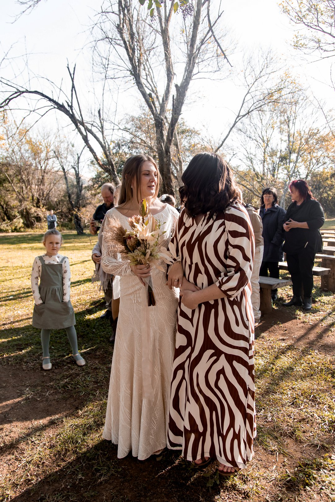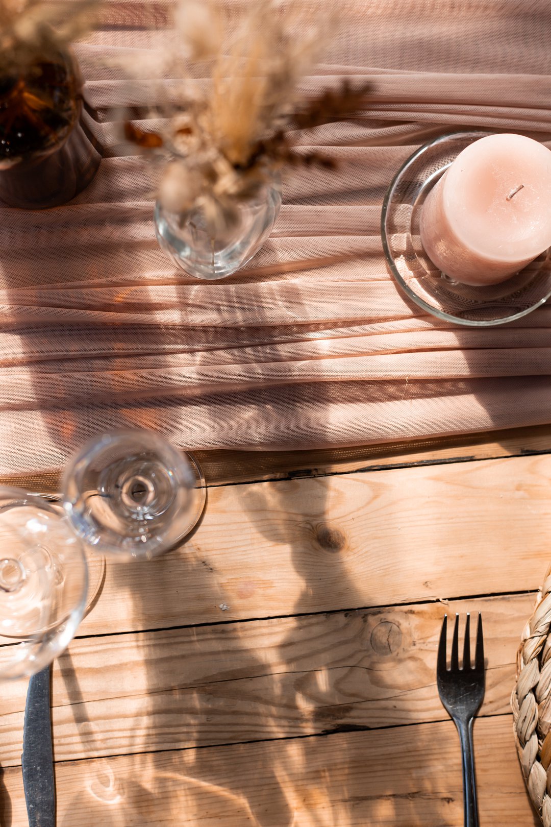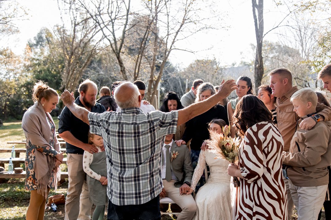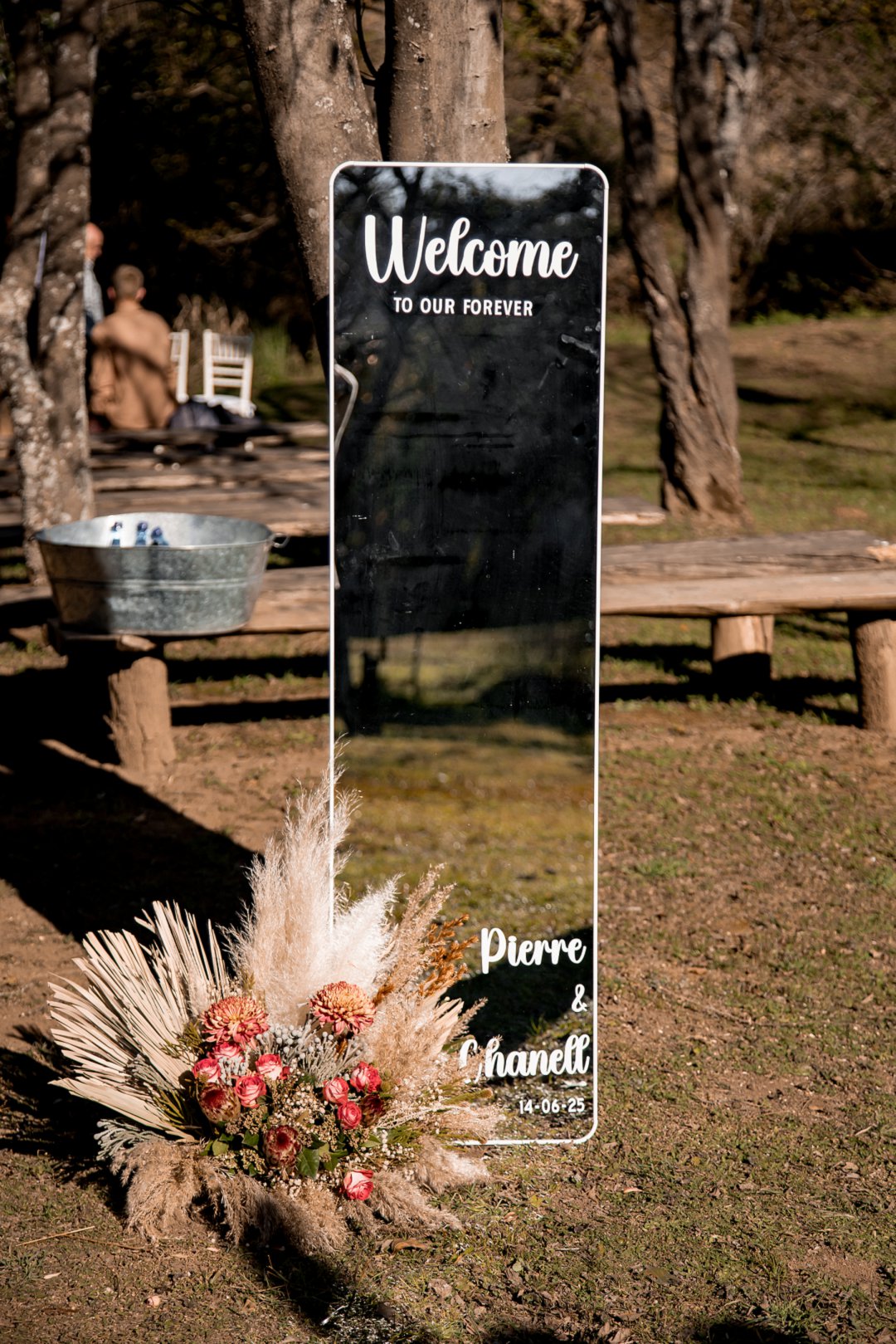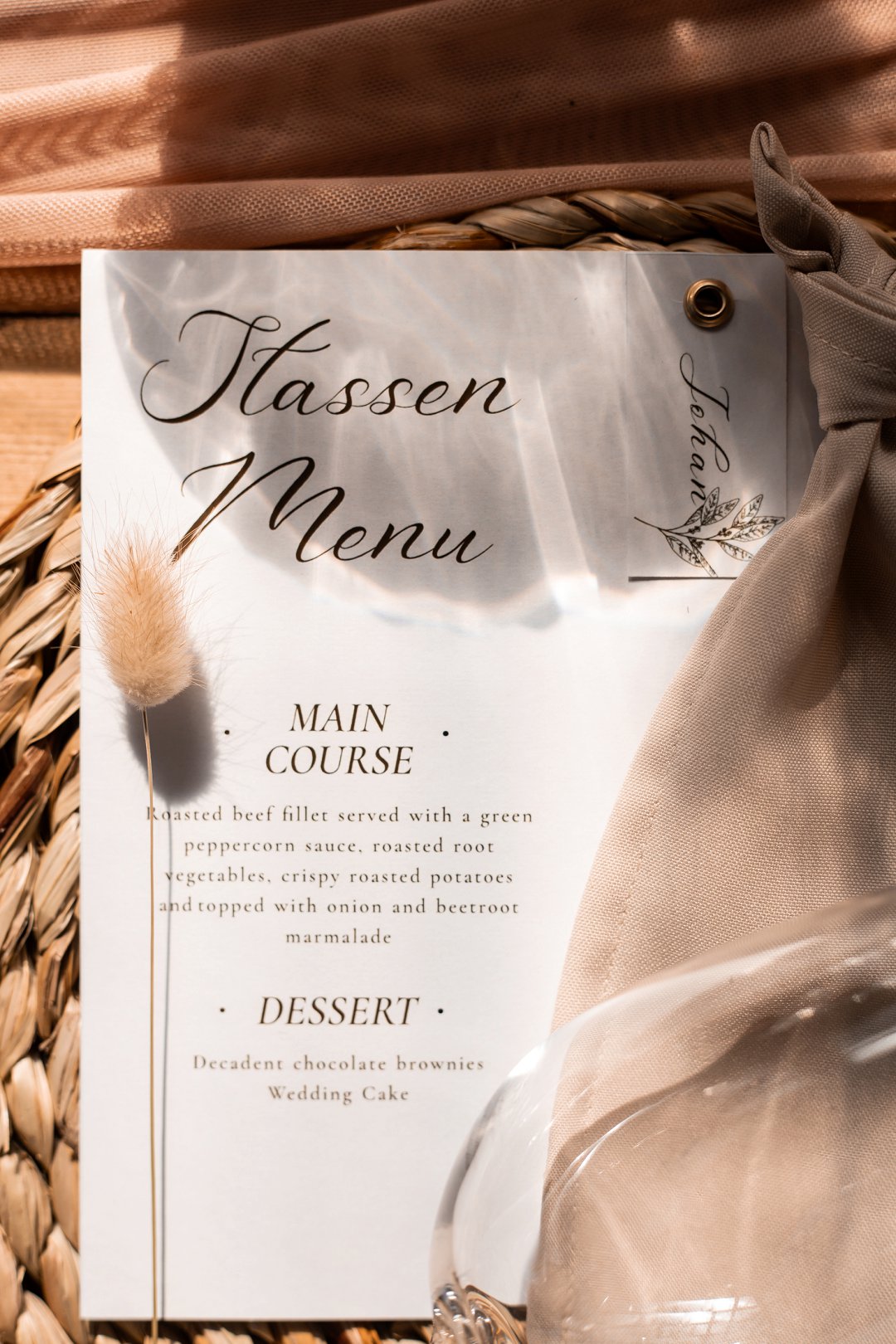 Die onthaal was intiem en gesellig, met familie en vriende wat om ’n lang houttafel saamgekuier het. ’n Ligpienk tafelloper, rottang plekmatjies en bruinerige potjies vol blomme het die dekor ’n knus winter gevoel gegee. Die gedroogde elemente het pragtig ingepas en ’n balans geskep tussen natuurlik en elegant.