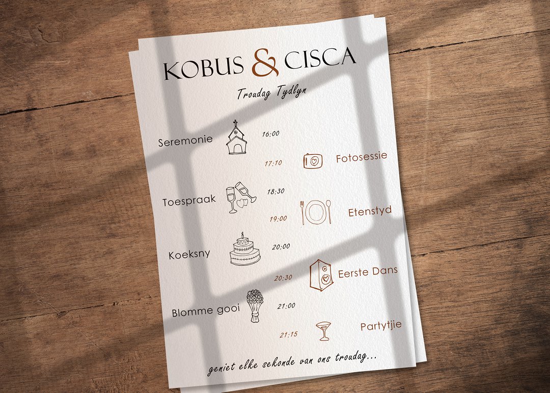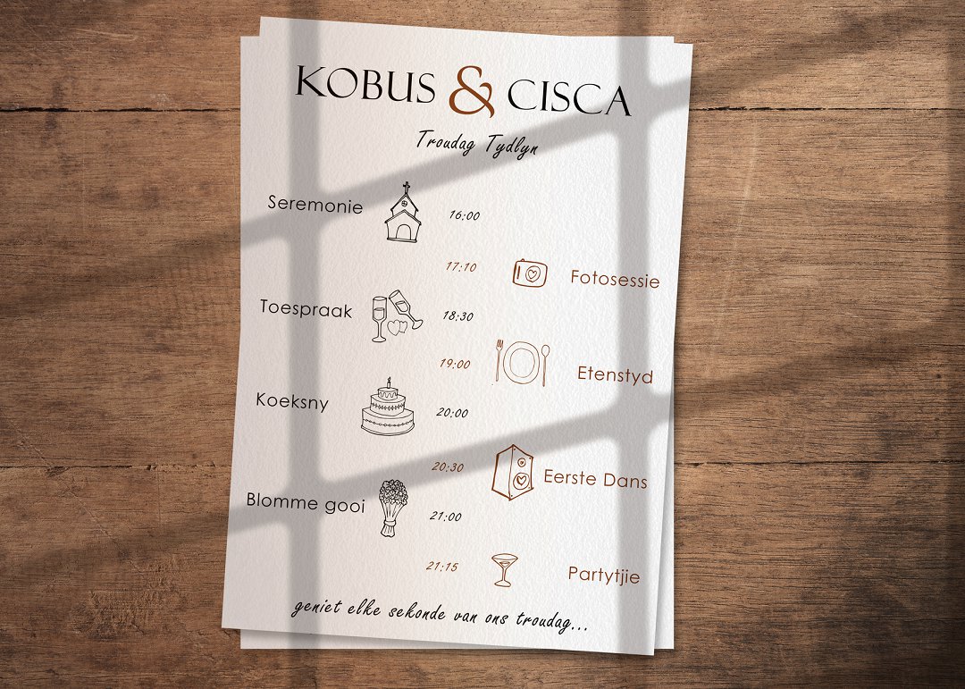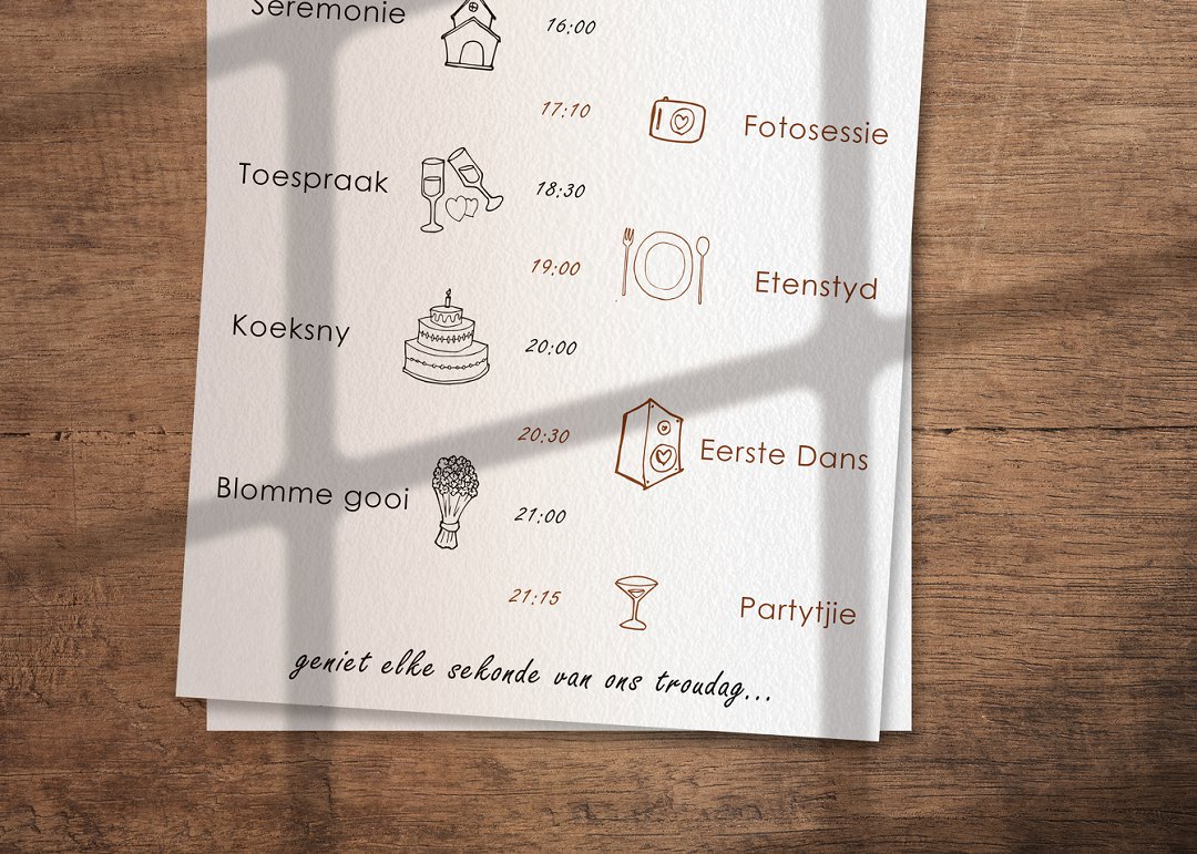 Op die dag van julle troue kan julle vir elke gas of paartjie hul eie tydlyn gee, sodat hulle presies weet wanneer wat gebeur. Dit verwyder die raaiskoot van âwat gebeur volgendeâ en help gaste om meer ontspanne en ingelig te voel.