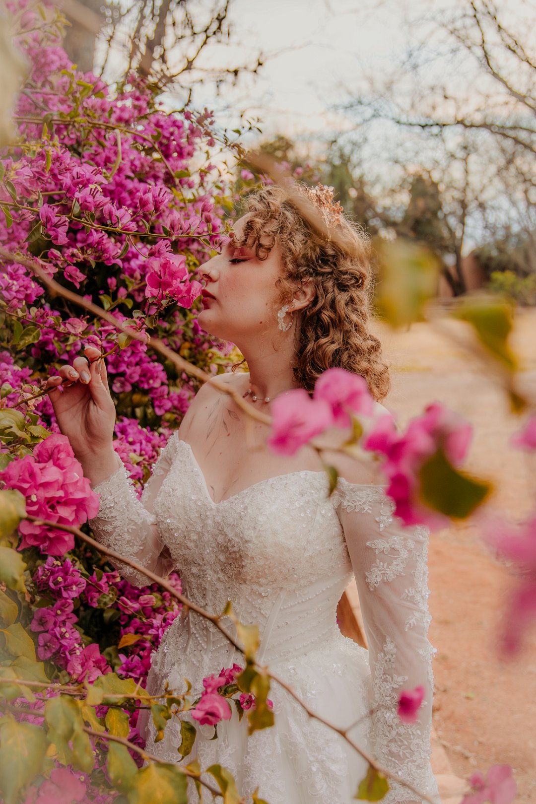 Die rok het ʼn romantiese en sprokie-geïnspireerde kwaliteit, dit balanseer moderne elegansie met klassieke bruidselemente, ʼn gestruktureerde korset, veter rug en vloeiende kant versiering sleep. Die kant is blom- en blaarryk, delikaat maar opvallend, met geborduurde teksture wat in die lig uitstaan. Subtiele kralewerk en sequins is in die kant geïntegreer en vang die lig vir ʼn sagte glans sonder om die rok te oorweldig.