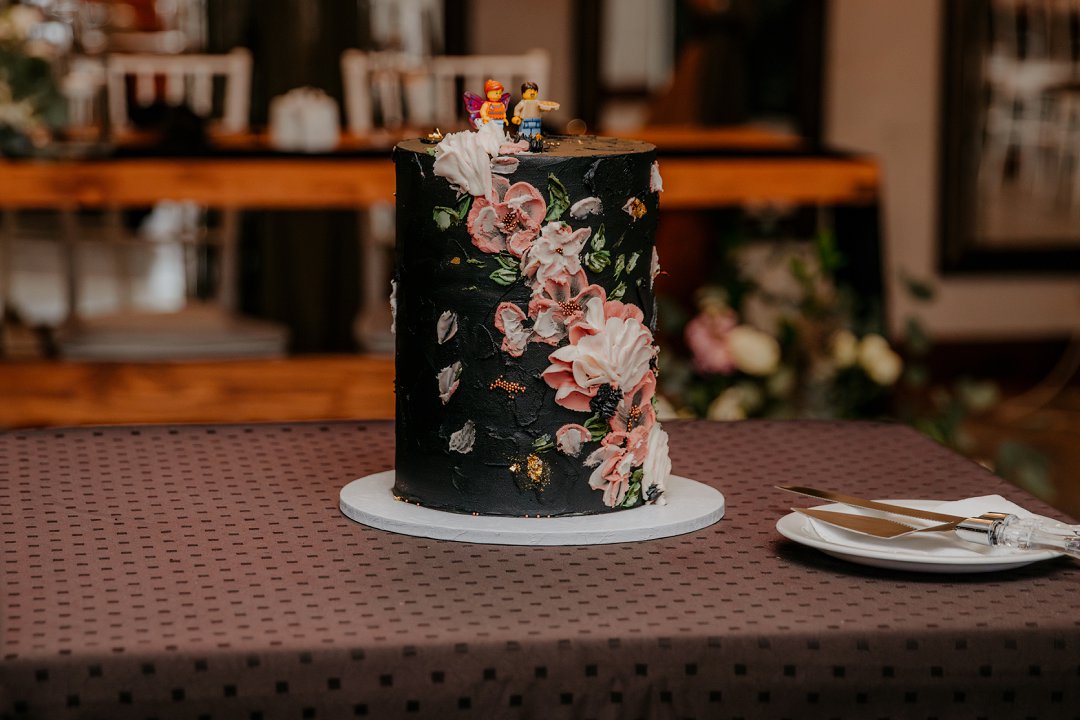 Die onthaal lokaal het ’n sagte natuurlike gevoel gehad met houttafels en ’n aardse kleurpalet. Moderne elemente het ’n treffende kontras geskep en die perfekte balans gebring tussen stylvol en natuurlik. Swart tafel lopers, swart dekor-elemente en helder blospienk blomme wat deur die groenigheid verweef is, het onmiddellik die oog gevang. Ons is mal oor hoe die swart aksente perfek saamwerk met die ligte pienke en die warm elemente.