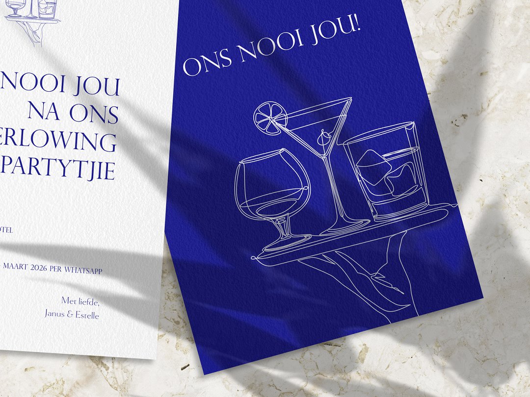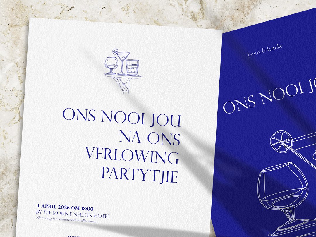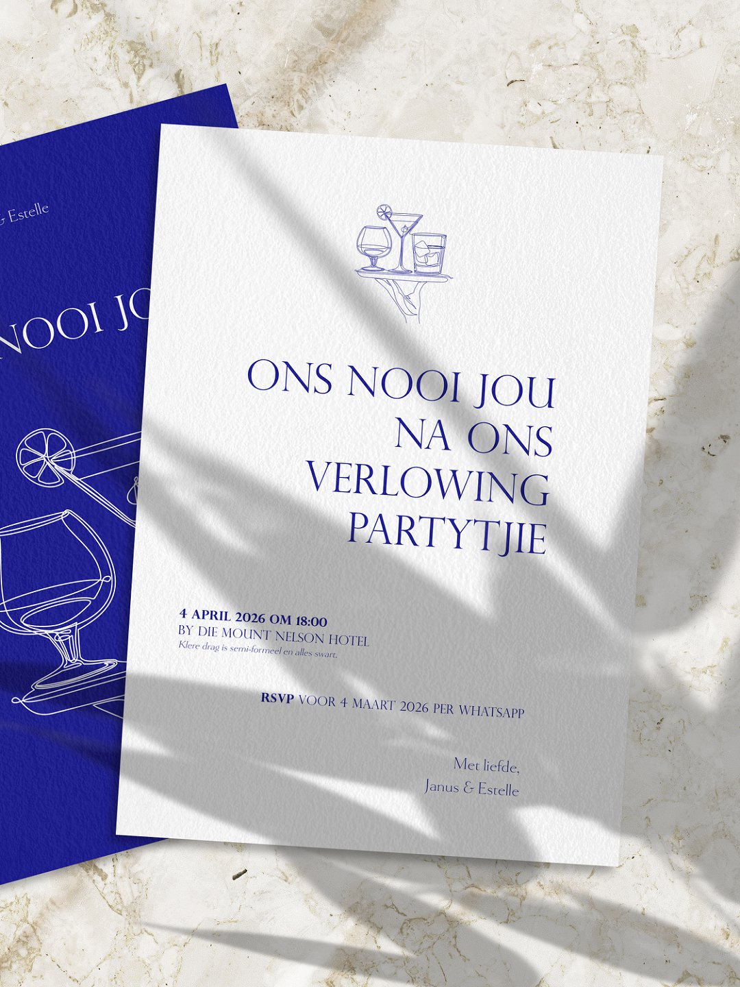 Die doel van ’n verlowing partytjie is dat almal saam die paartjie se verlowing vier en saam in die opgewondenheid deel oor hul liefdesreis vorentoe. Hierdie pragtige donkerblou en wit uitnodiging is perfek om julle familie en vriende na ’n deftige skemerkelkie verlowing partytjie te nooi. ’n Uitnodiging vir ’n verlowing partytjie hoef ook nie baie inligting te bevat nie en kan lekker informeel wees. Julle kan dit laat druk en fisies oorhandig, of sommer per e-pos of WhatsApp na julle gaste stuur.