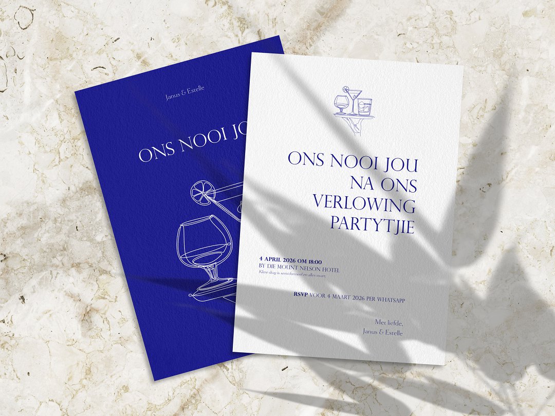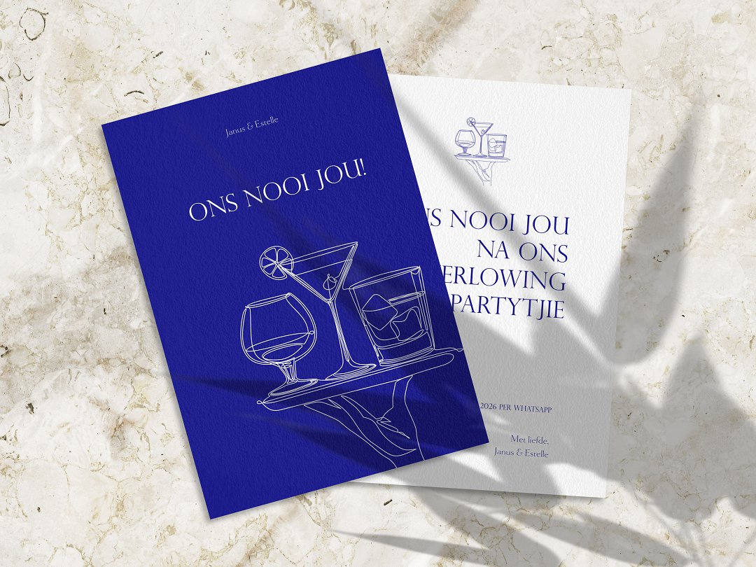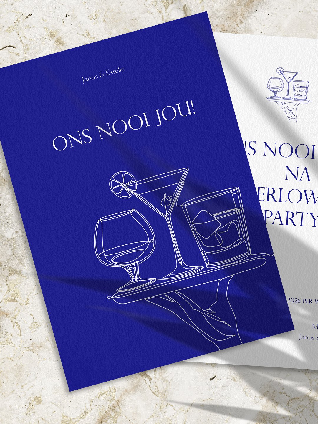 Die doel van ’n verlowing partytjie is dat almal saam die paartjie se verlowing vier en saam in die opgewondenheid deel oor hul liefdesreis vorentoe. Hierdie pragtige donkerblou en wit uitnodiging is perfek om julle familie en vriende na ’n deftige skemerkelkie verlowing partytjie te nooi. ’n Uitnodiging vir ’n verlowing partytjie hoef ook nie baie inligting te bevat nie en kan lekker informeel wees. Julle kan dit laat druk en fisies oorhandig, of sommer per e-pos of WhatsApp na julle gaste stuur.