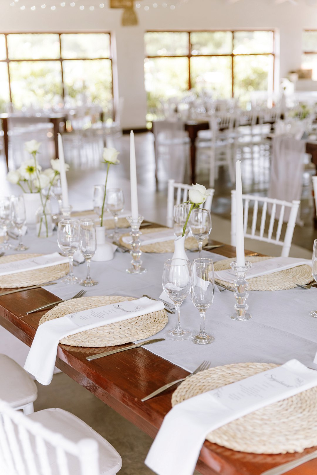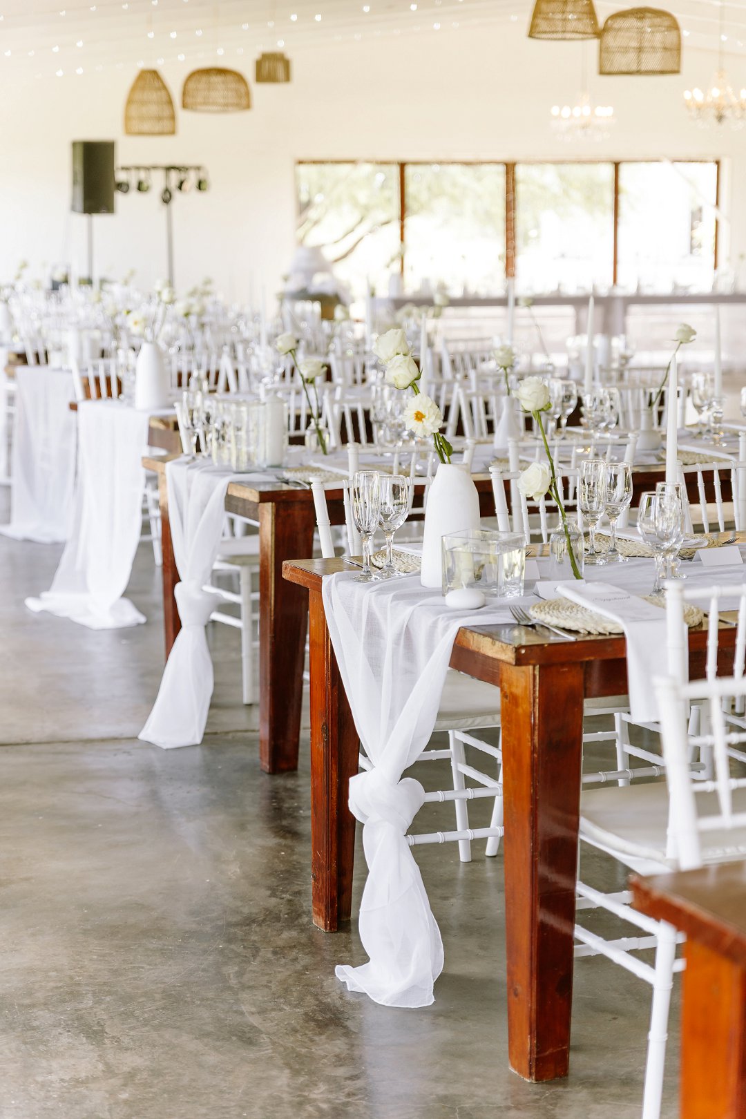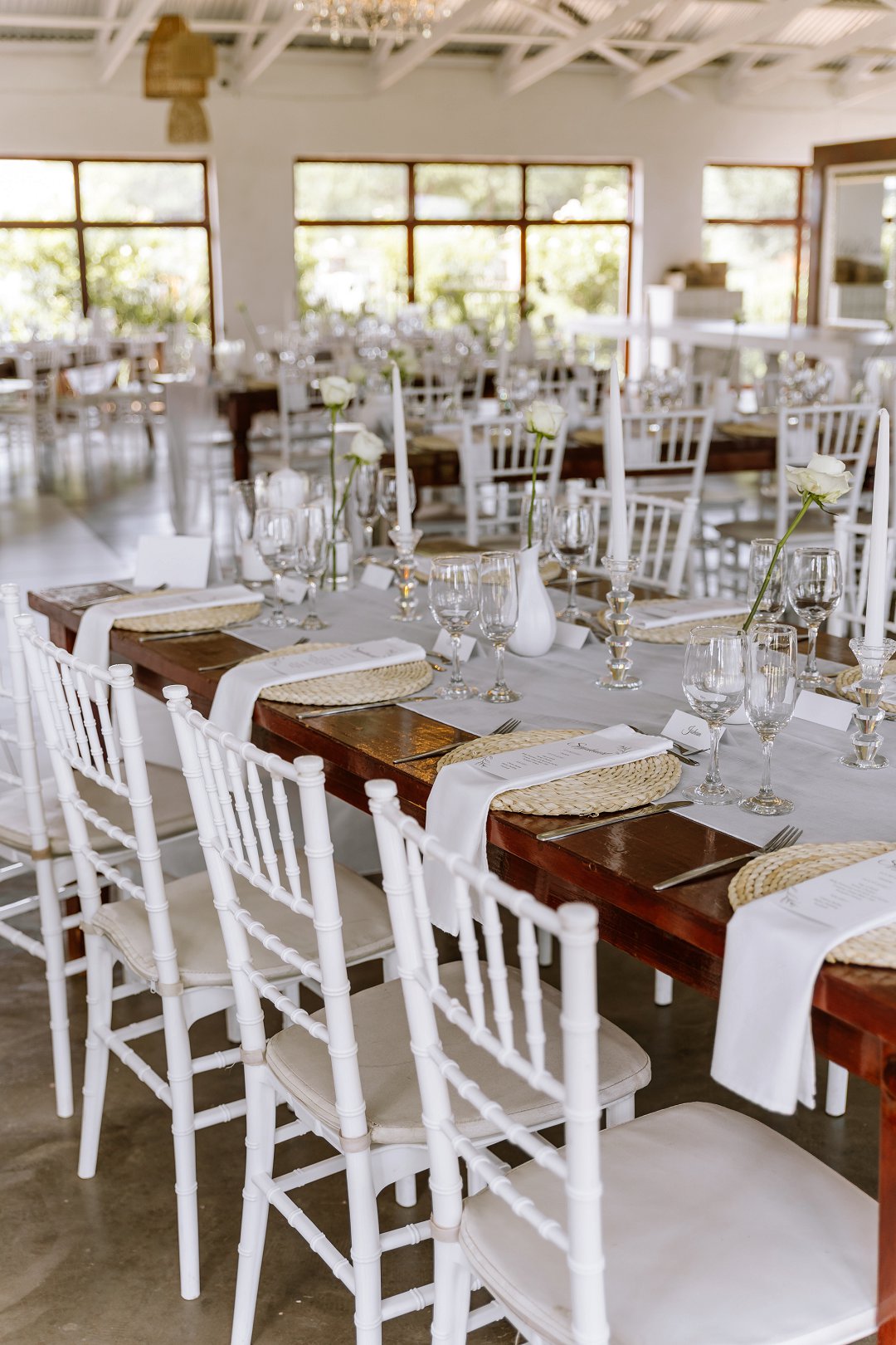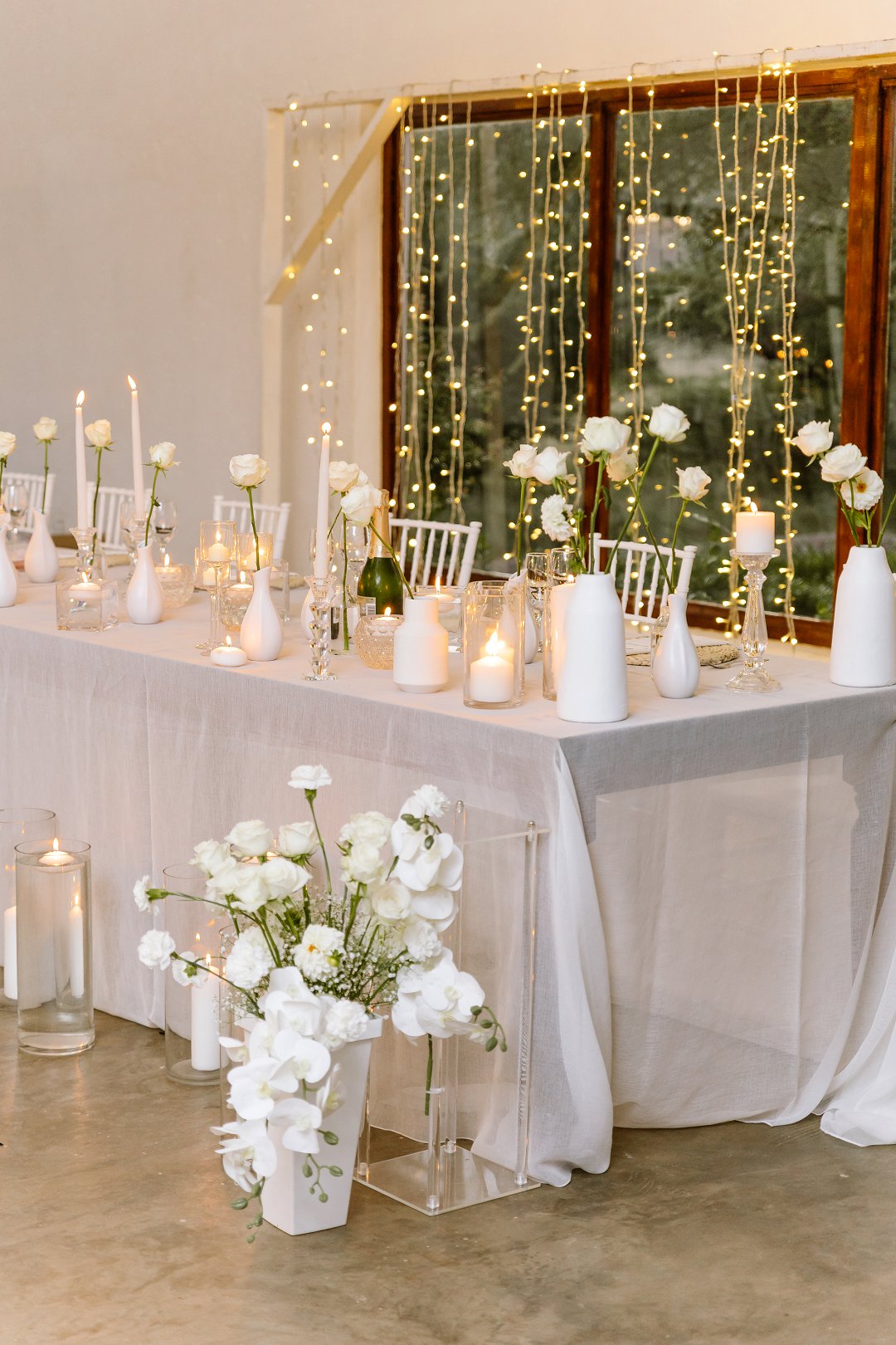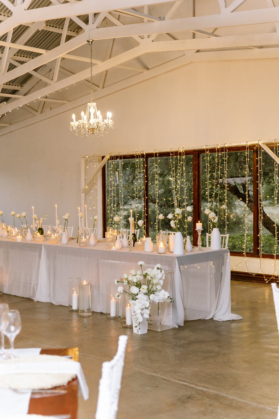 Die kleurskema was ’n huldeblyk aan die natuur, met skoon wit en vars groen as fokuspunte. Elné se visie was om ’n ruimte te skep wat vreedsaam, tydloos en onmiskenbaar hulle voel. Wit tafel linne en sagte wit kerse wat deur die aand geflikker het, het die toon vir ’n romantiese atmosfeer geskep. Agter die bruidstafel het feetjie liggies soos sterre geskitter, terwyl geweefde rottang lanterns wat van die plafon af gehang het, ’n subtiele natuurlike tekstuur bygevoeg het. In harmonie met die dekor het gaste in aardse kleure geklee gekom, wat verseker het dat die hele geselskap naatloos by die omgewing ingepas het.