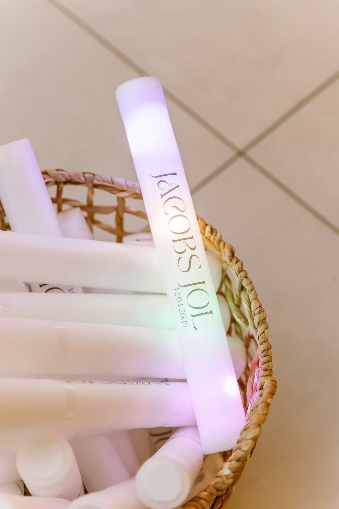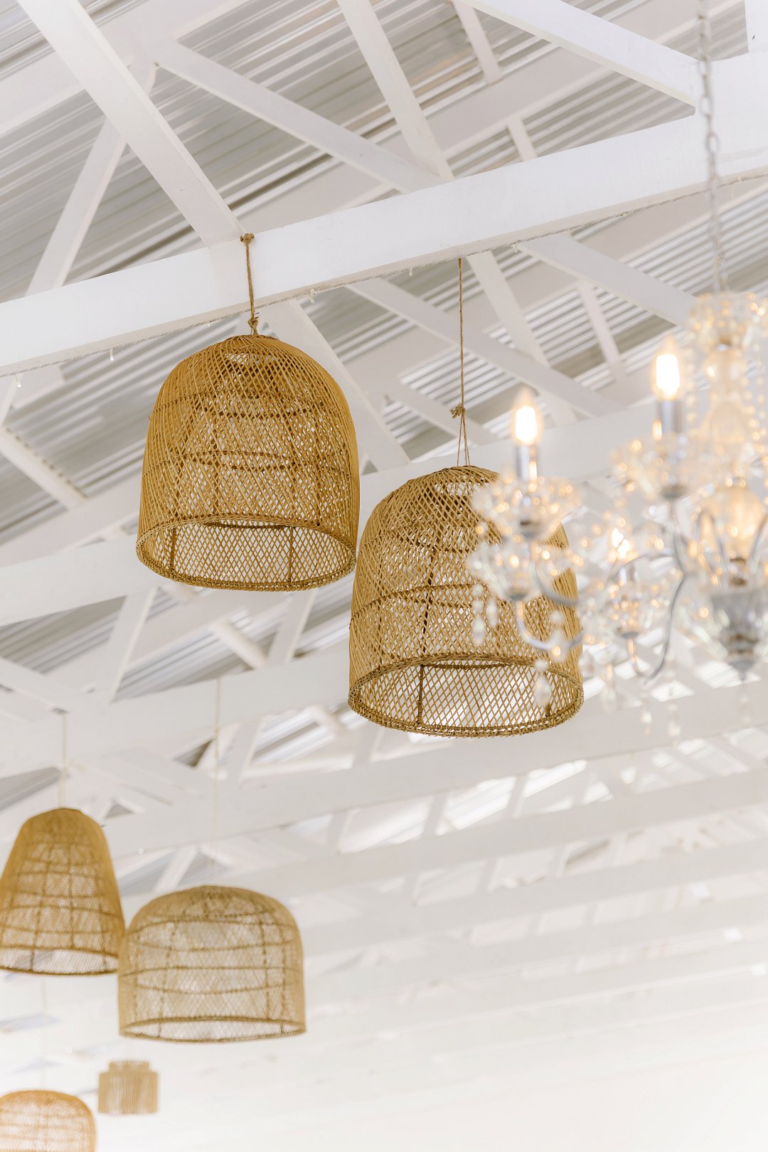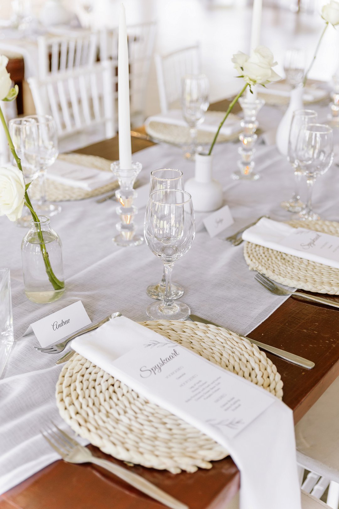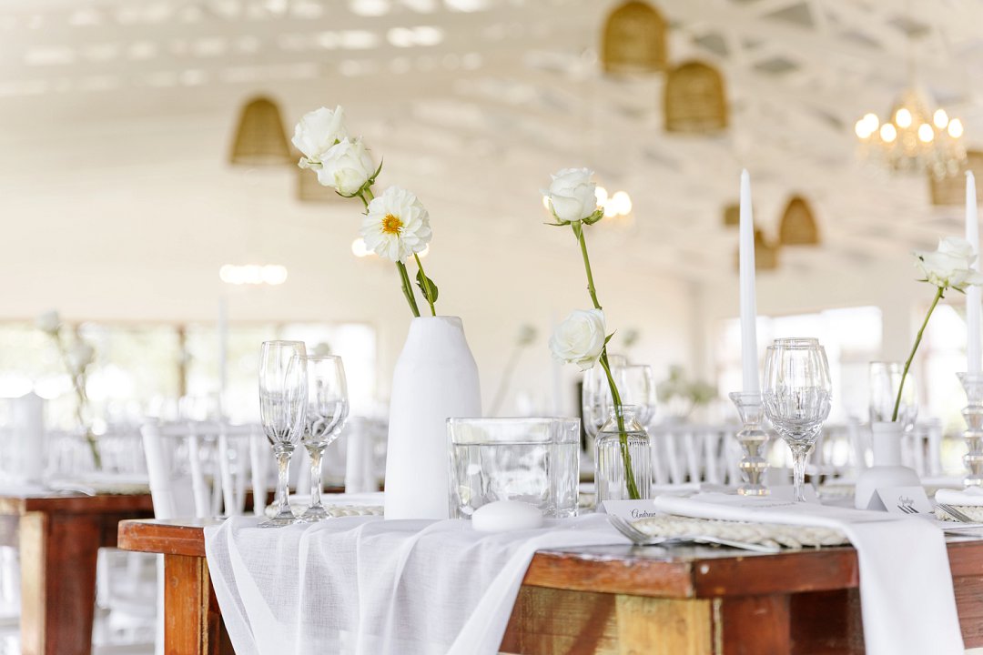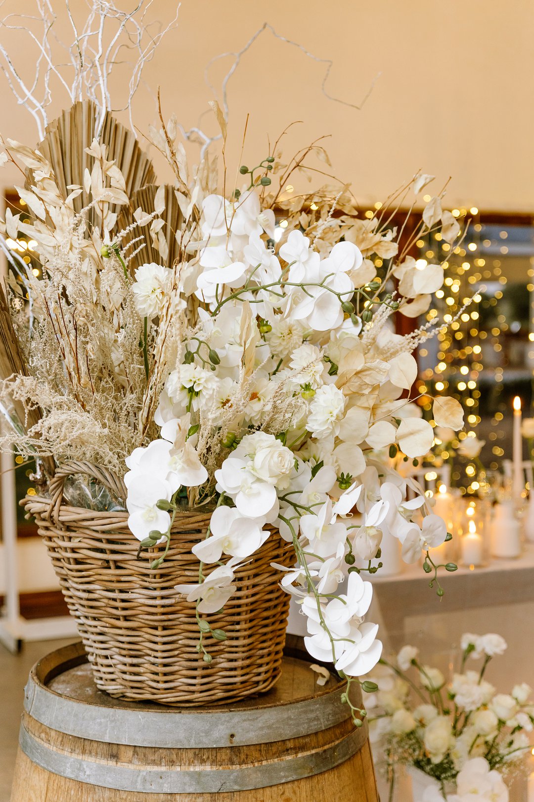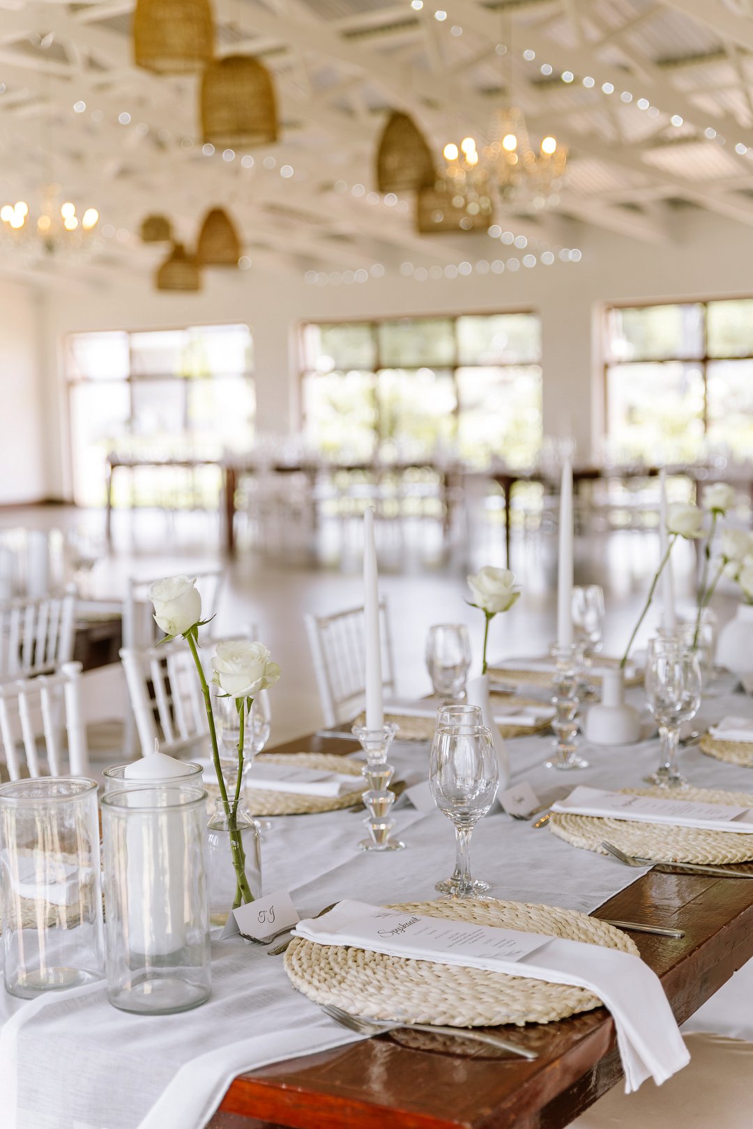 Die kleurskema was ’n huldeblyk aan die natuur, met skoon wit en vars groen as fokuspunte. Elné se visie was om ’n ruimte te skep wat vreedsaam, tydloos en onmiskenbaar hulle voel. Wit tafel linne en sagte wit kerse wat deur die aand geflikker het, het die toon vir ’n romantiese atmosfeer geskep. Agter die bruidstafel het feetjie liggies soos sterre geskitter, terwyl geweefde rottang lanterns wat van die plafon af gehang het, ’n subtiele natuurlike tekstuur bygevoeg het. In harmonie met die dekor het gaste in aardse kleure geklee gekom, wat verseker het dat die hele geselskap naatloos by die omgewing ingepas het.