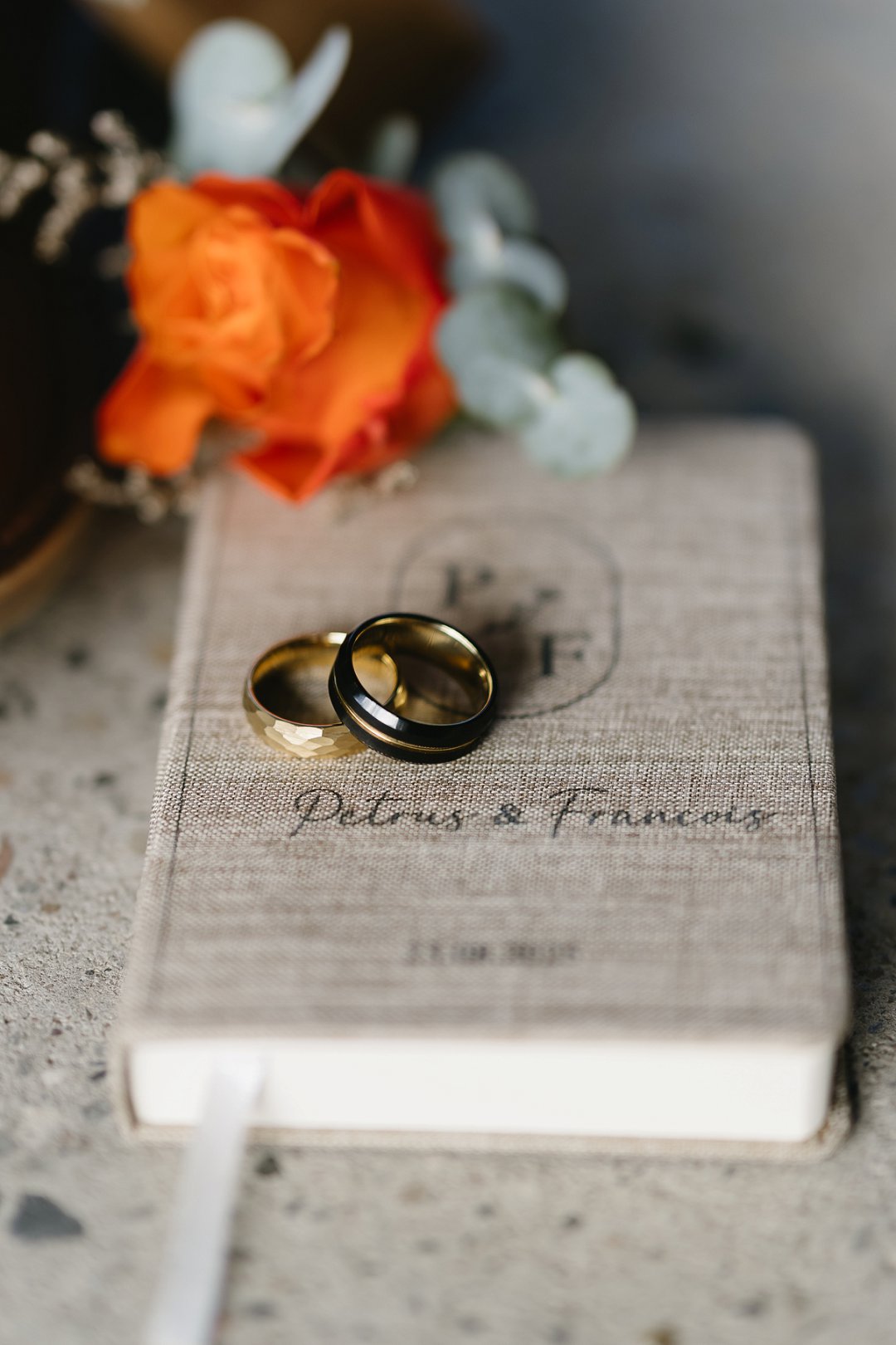 Met die troupante het ons geweet dat ons ook wou hê dat dit ons saamwees as paartjie moes simboliseer. Francois wou graag iets uniek hê en het toe besluit op die goue pant met die kenmerkende “hammered look”. Om die eenheid en saamwees van ons te behou, het ek toe ’n pant gekies wat swart en goud was. So het ons getrou gebly aan wie ons is as individue, maar ook as ’n paartjie. Die gravering in die ringe was ook persoonlik.