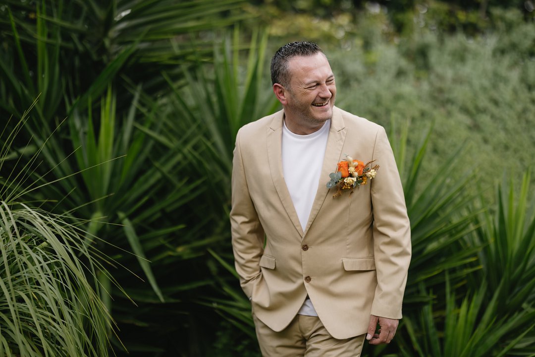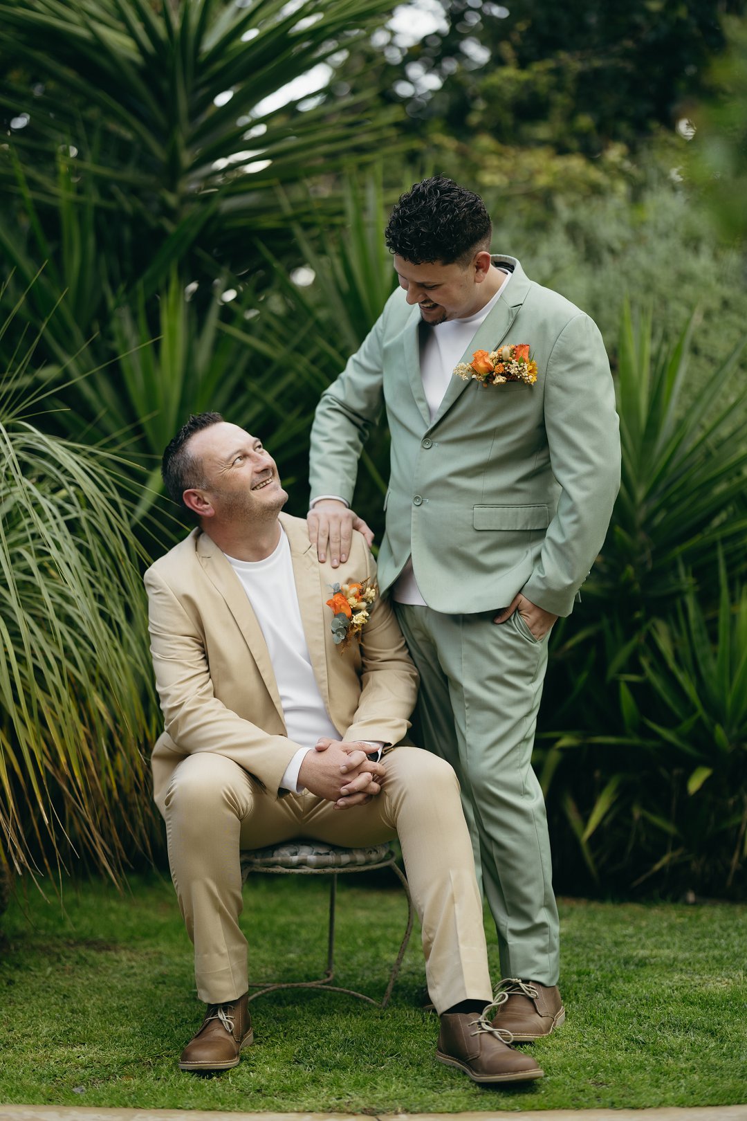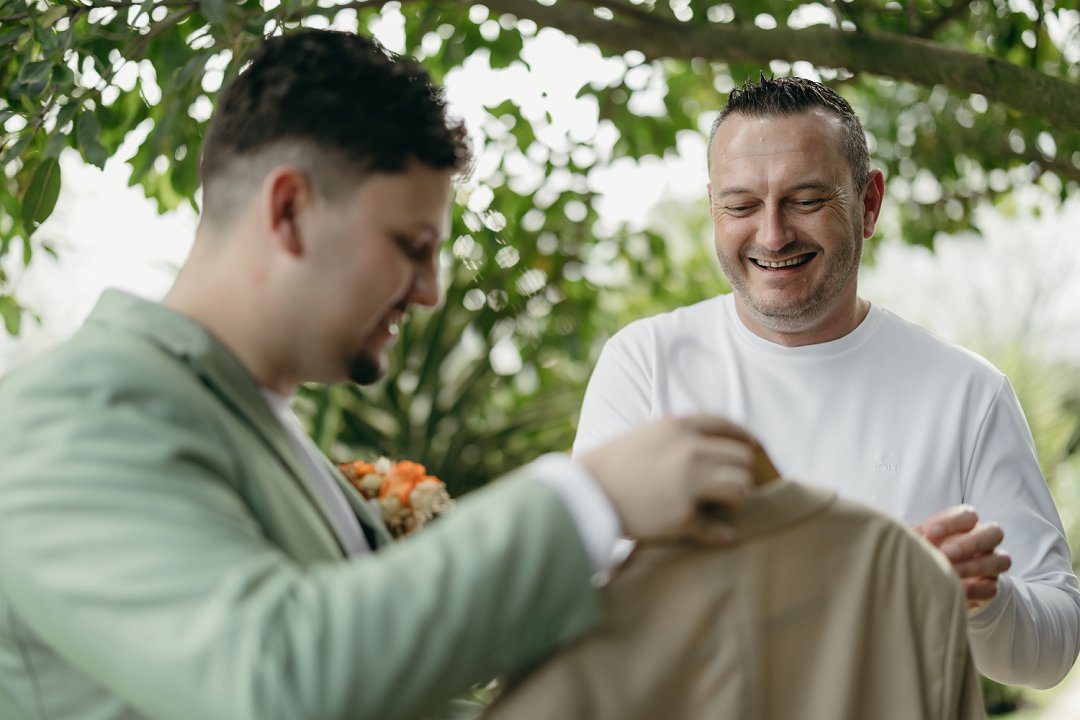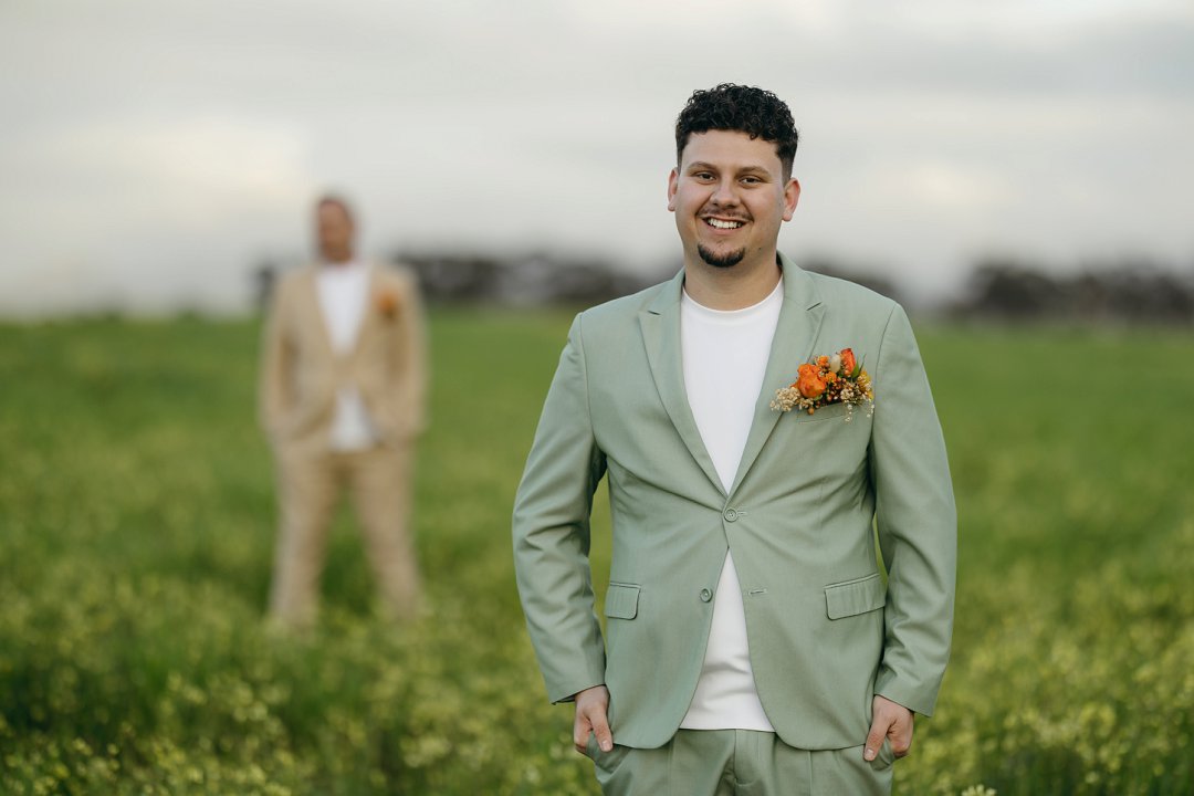 Ons seremonie pakke het ons gehuur en was in Sage Green en Stone. Die tema vir die troue was “Out-do The Grooms”. Om seker te maak ons word nie te veel out-do nie, het ons besluit om net ná ons eerste dans ’n suit change te doen. Die pakke was skakerings van blou en is gemaak deur The Tailorman in Groen Punt. Dit het perfek saam gepas het met die tema en die kleure van die troue.
