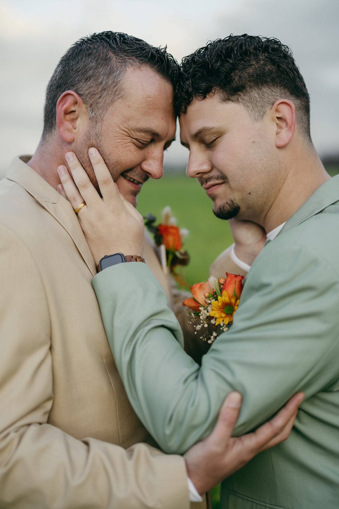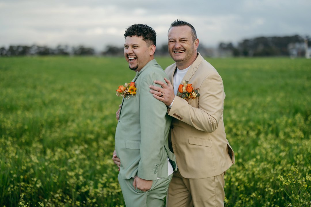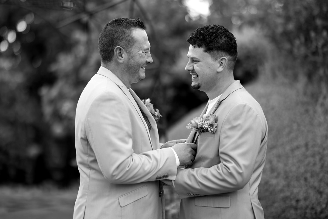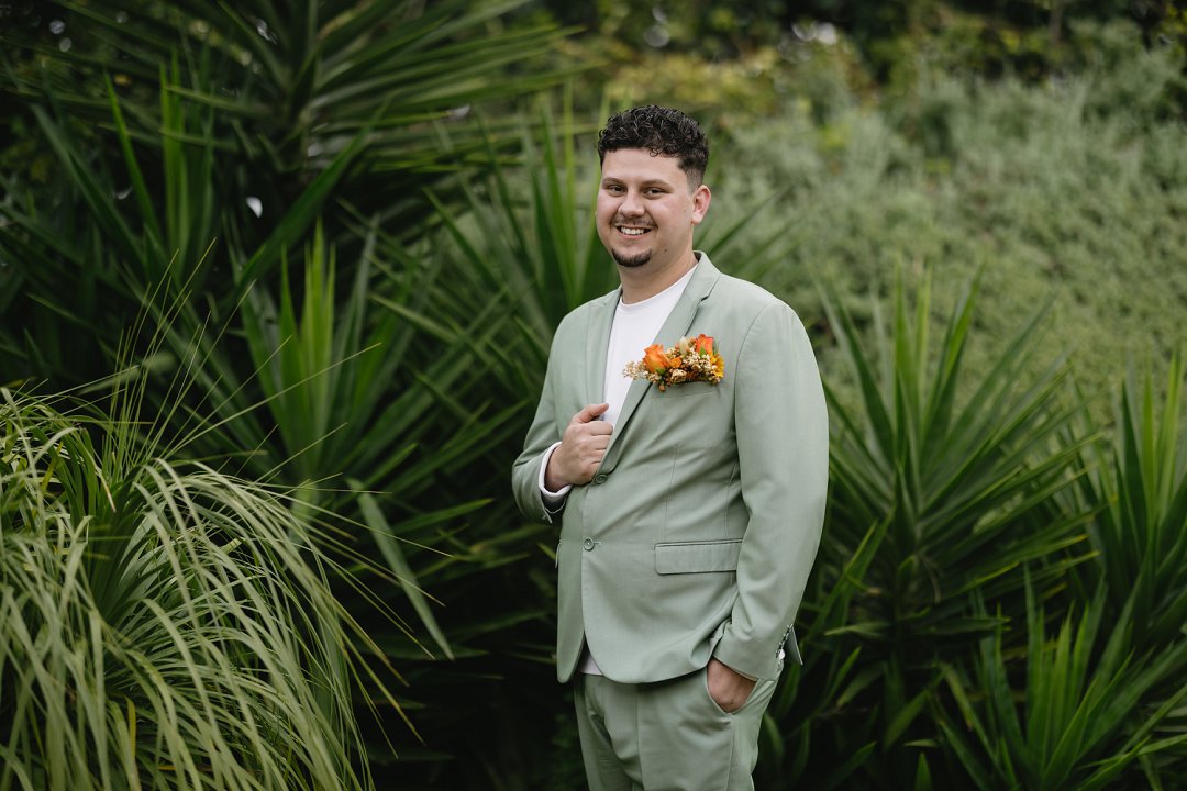Ons seremonie pakke het ons gehuur en was in Sage Green en Stone. Die tema vir die troue was “Out-do The Grooms”. Om seker te maak ons word nie te veel out-do nie, het ons besluit om net ná ons eerste dans ’n suit change te doen. Die pakke was skakerings van blou en is gemaak deur The Tailorman in Groen Punt. Dit het perfek saam gepas het met die tema en die kleure van die troue.