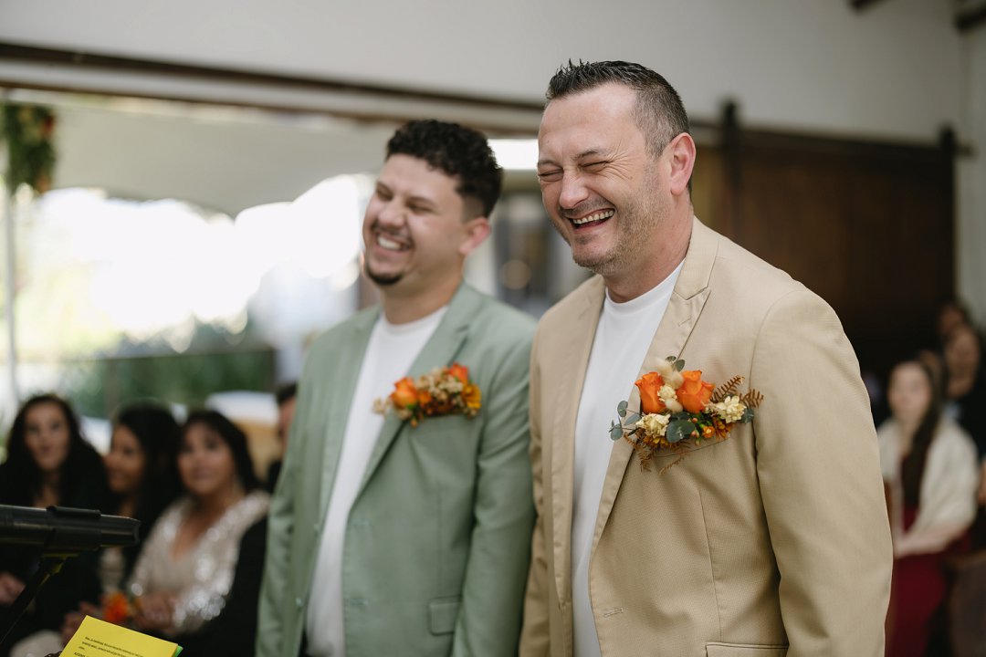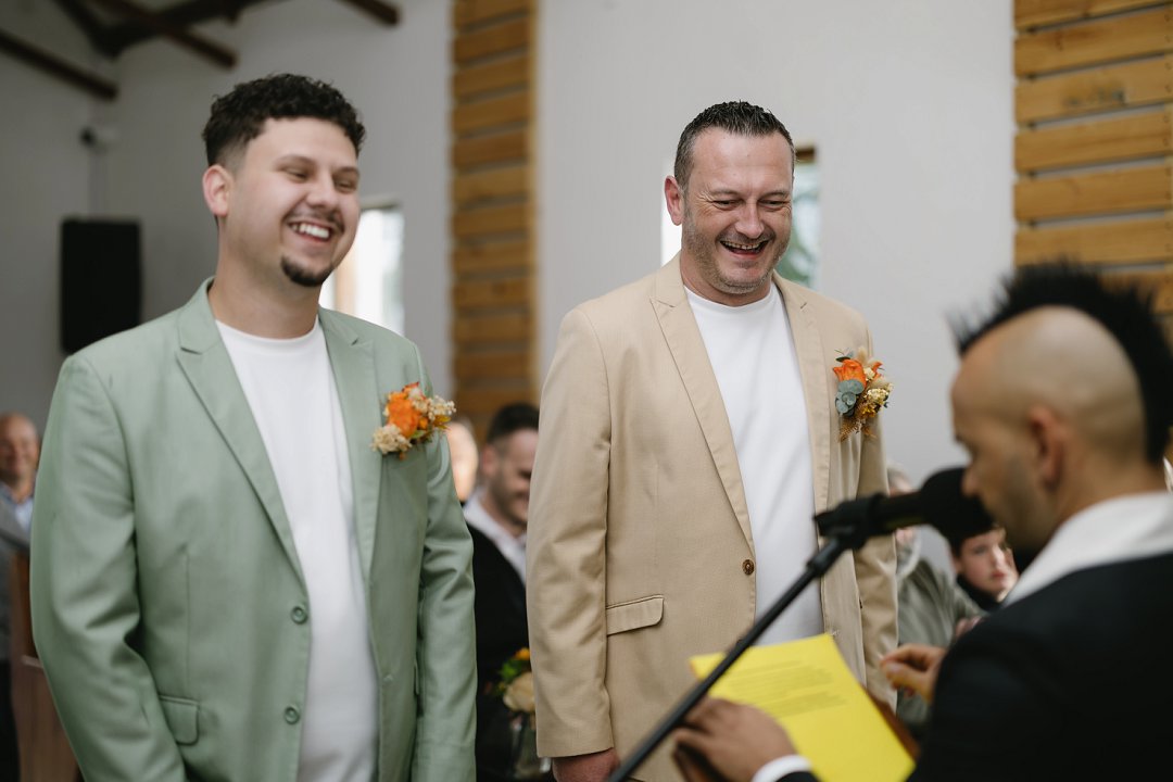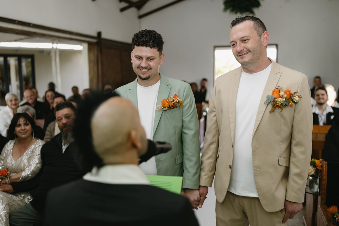 Ons het ook besluit op ’n interaktiewe seremonie, sodat almal betrokke kon wees. Onder andere het ons gaste die geleentheid gegee om geloftes aan ons af te lê. Ons troupante was ook slim weggesteek onder sitplekke in die kapel. Omdat ons nie ’n streng volgorde wou hê nie en nie iemand wou uitsluit nie, het dit beteken dat enige van ons gaste die rol van “ringbearer” kon vervul. Dit het ’n speelse en liefdevolle energie aan die seremonie gegee.