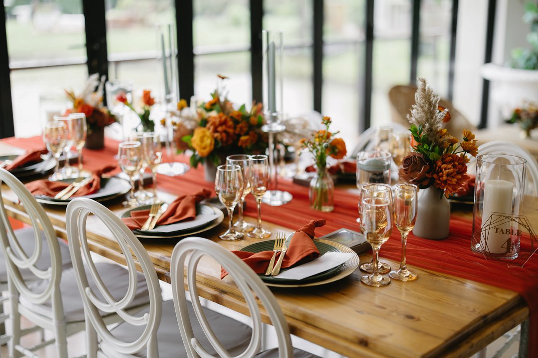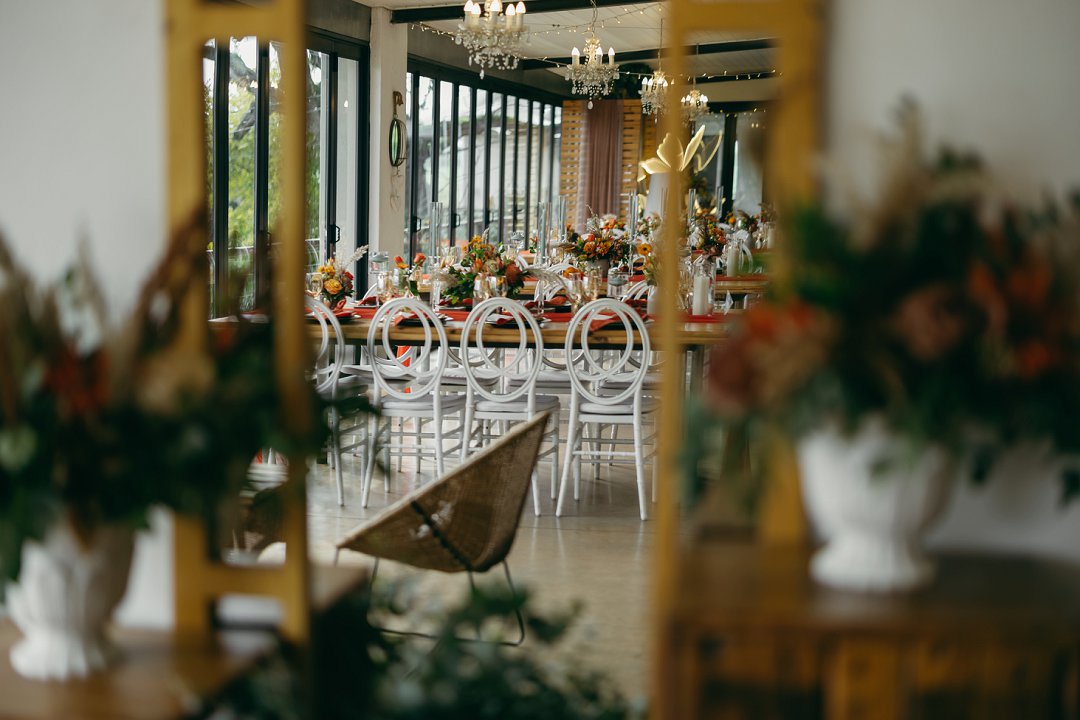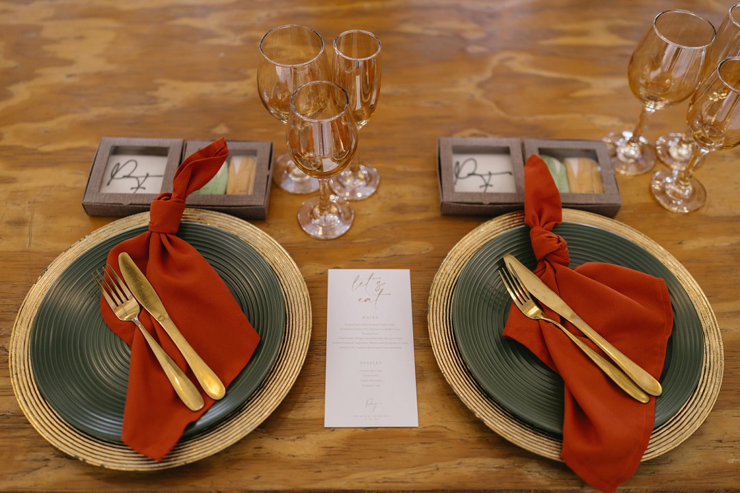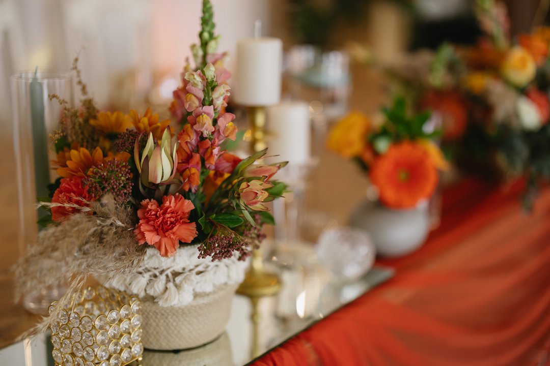 Die kleurskema was geïnspireer deur die ryk, sagte skakerings van winter en herfs. Ons wou hê dit moes die gevoel van warmte en liefde weerspieël, amper soos die seisoene wat van een na die ander ’n nuwe begin bring. Dit is presies wat ons op daardie dag ervaar het. Ek en Francois het geweet wat ons wou hê en was baie spesifiek oor die “look and feel” van die tafels. Na verskeie sessies van mix en match het ons uiteindelik besluit op die skakerings en uitleg wat die tafels op ons groot dag versier het, perfek in lyn met die atmosfeer wat ons wou skep.
