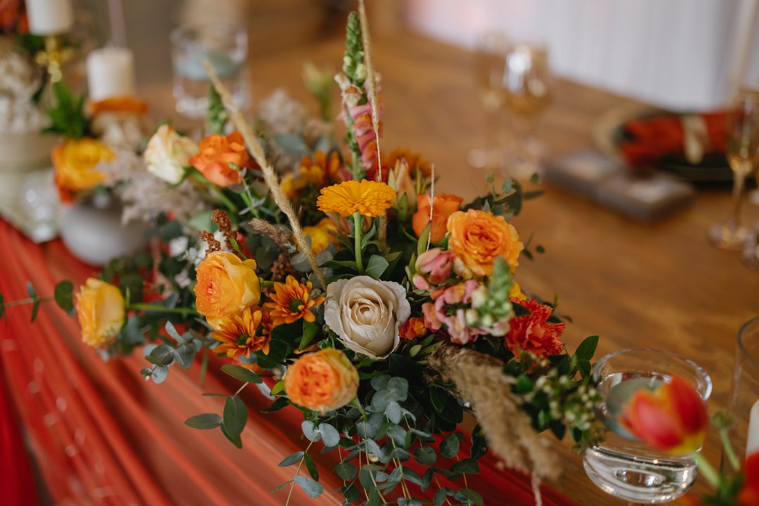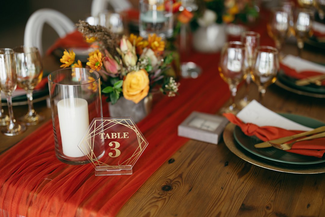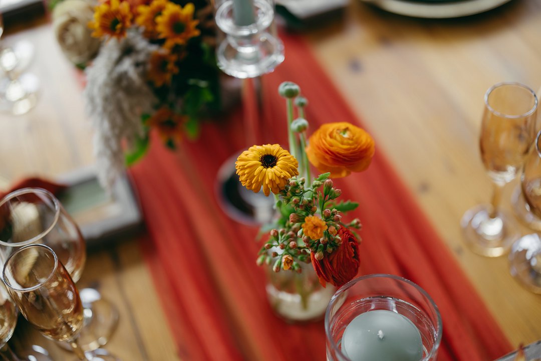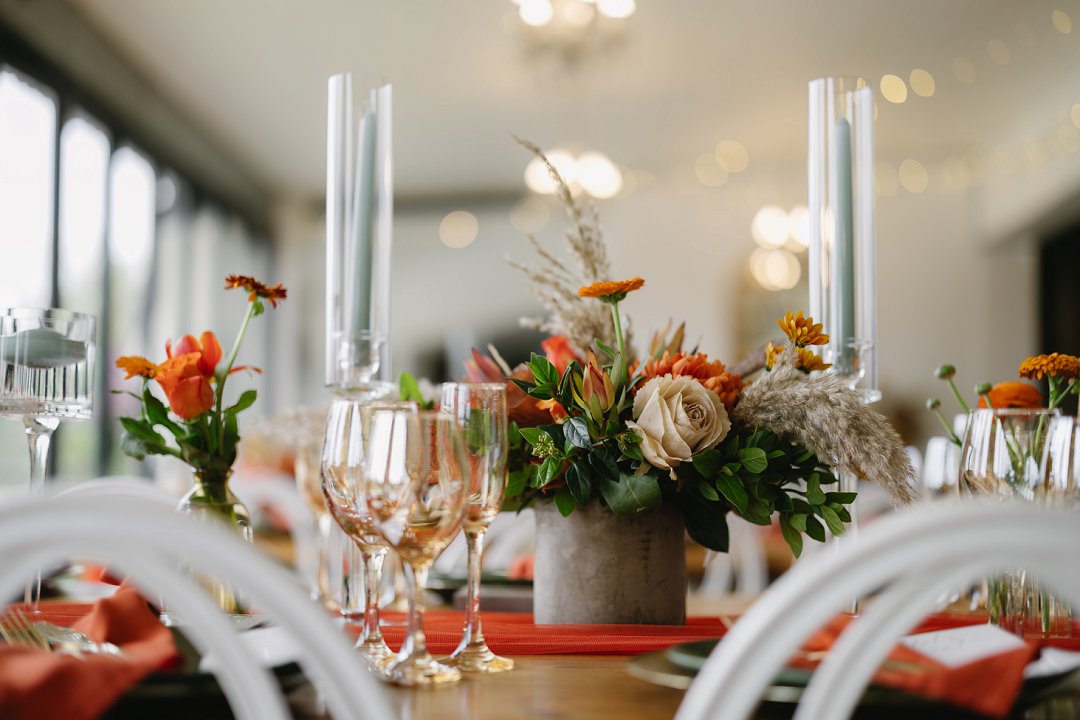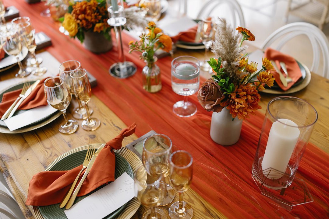 Die kleurskema was geïnspireer deur die ryk, sagte skakerings van winter en herfs. Ons wou hê dit moes die gevoel van warmte en liefde weerspieël, amper soos die seisoene wat van een na die ander ’n nuwe begin bring. Dit is presies wat ons op daardie dag ervaar het. Ek en Francois het geweet wat ons wou hê en was baie spesifiek oor die “look and feel” van die tafels. Na verskeie sessies van mix en match het ons uiteindelik besluit op die skakerings en uitleg wat die tafels op ons groot dag versier het, perfek in lyn met die atmosfeer wat ons wou skep.