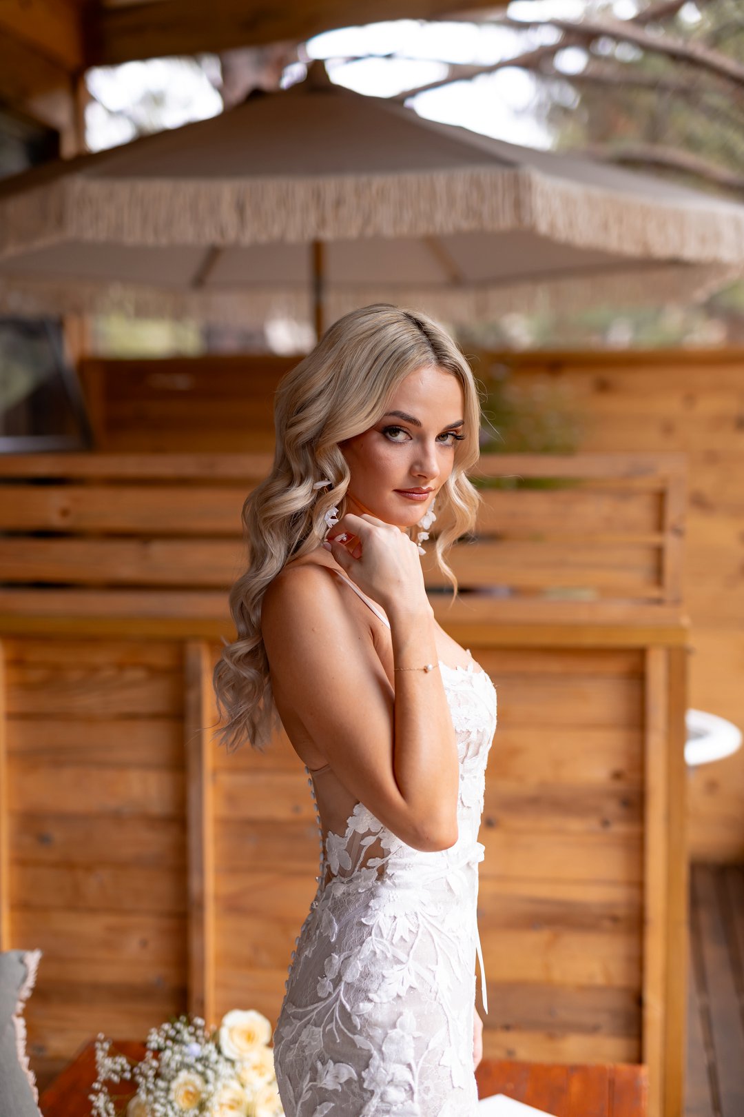 Caelin het gestraal in ’n romantiese meermin-styl trourok in ivoor- en vlees kleurige skakerings. Die rok het bestaan uit geborduurde blomkant oor Chantilly-kant en glinsterende tule, wat ’n betowerende glans aan haar voorkoms verleen het. Met ’n klassieke sweetheart-borslyn en ’n illusie-kant-rug het die rok afgesluit met ’n indrukwekkende kant sleep wat elegant agter haar afgestroom het.