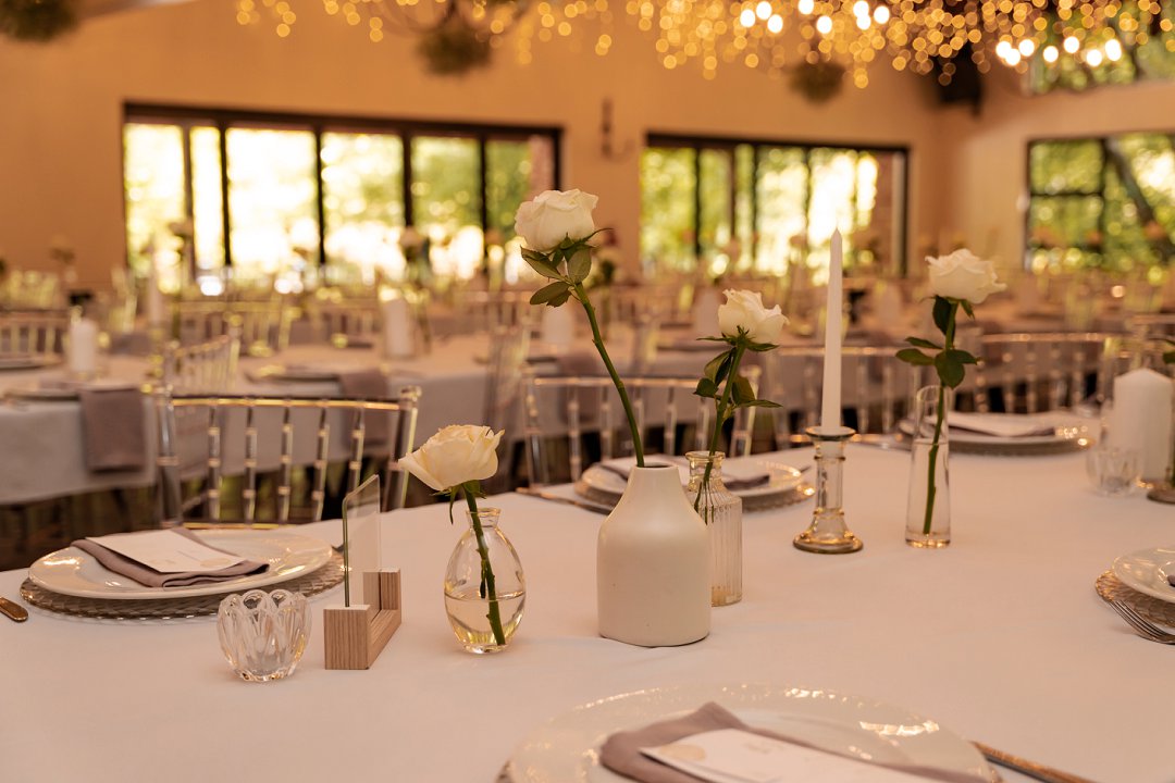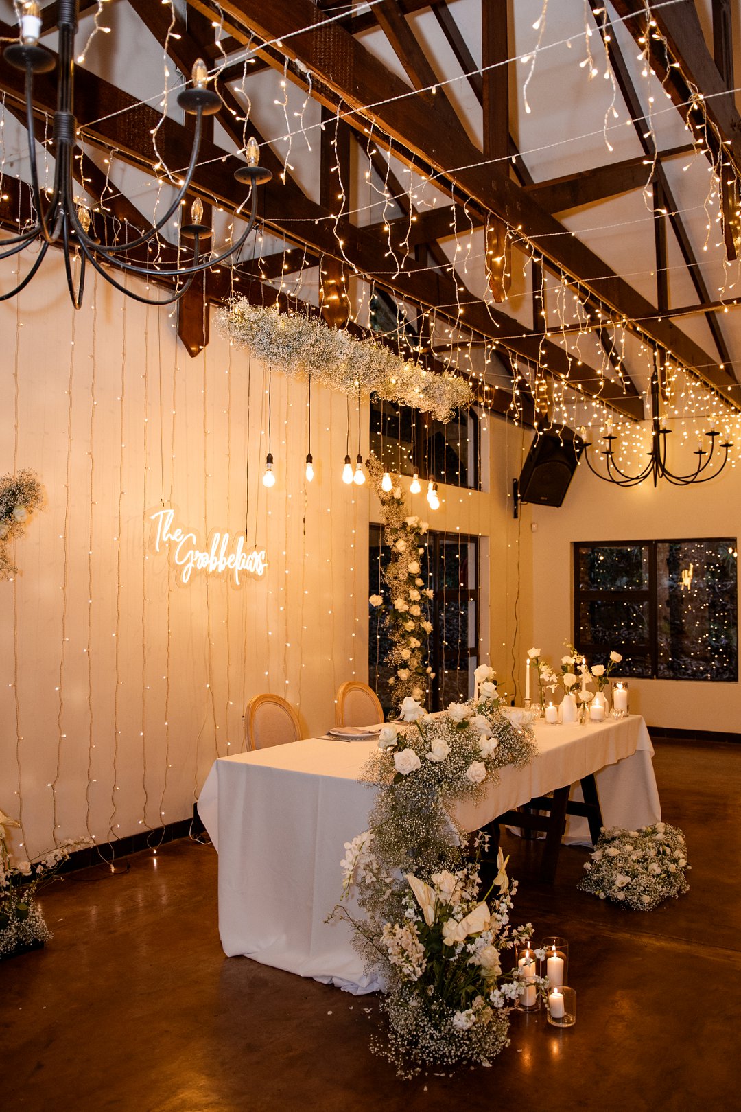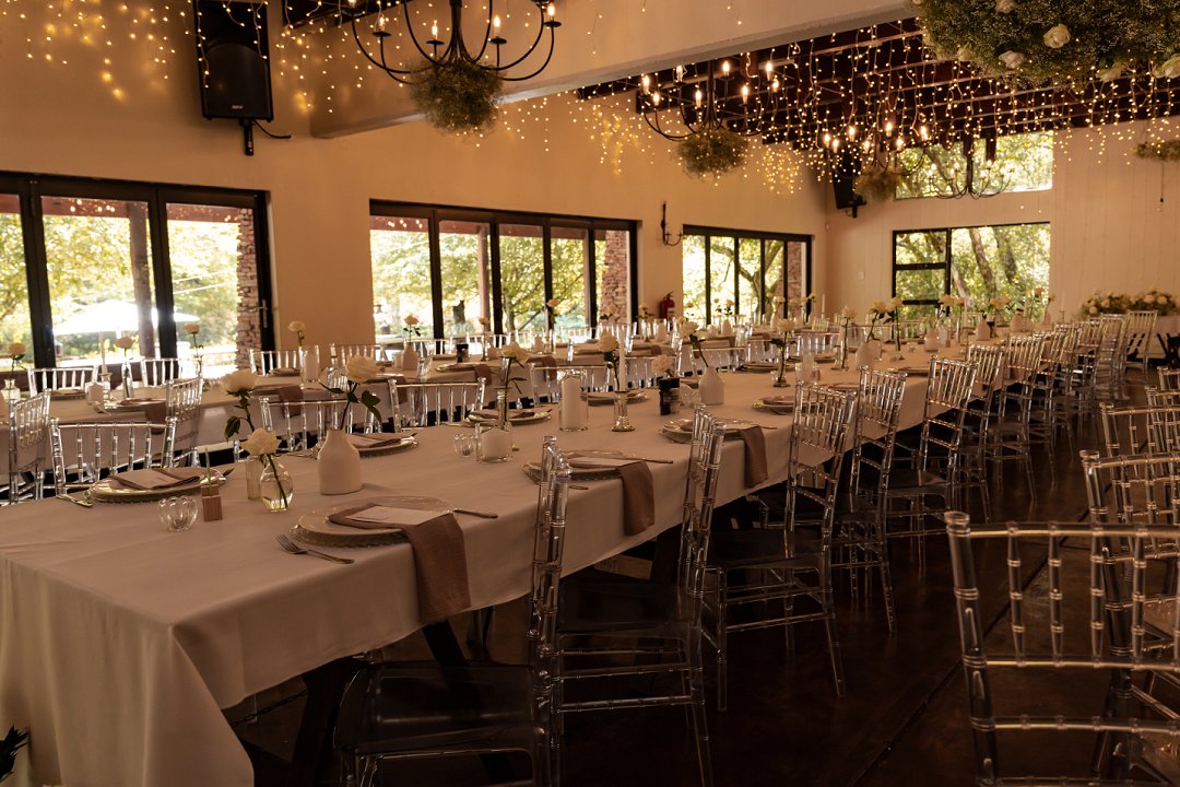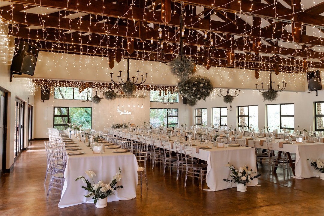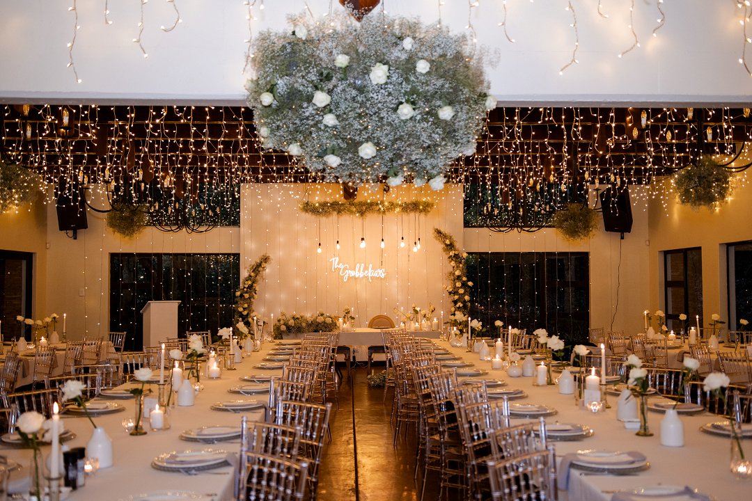 Die dekor was ’n minimalistiese, maar kragtige beeld van elegansie. Wit rose en gipskruid het pragtig teen die groen van die tuin uitgestaan, terwyl die onthaalruimte omskep is in ’n liggie-paradys. Dramatiese hangende feetjie liggies en gipskruid-kandelare het ’n romantiese sterre-effek geskep wat die venue só beïndruk het dat hulle die beligting as ’n permanente kenmerk behou het.