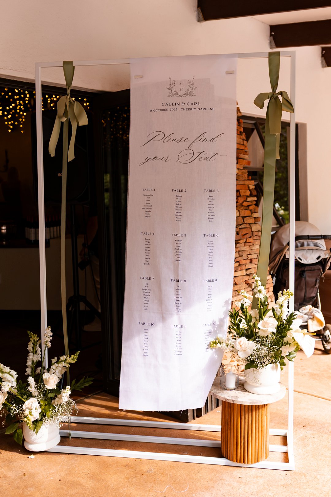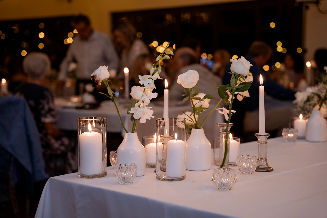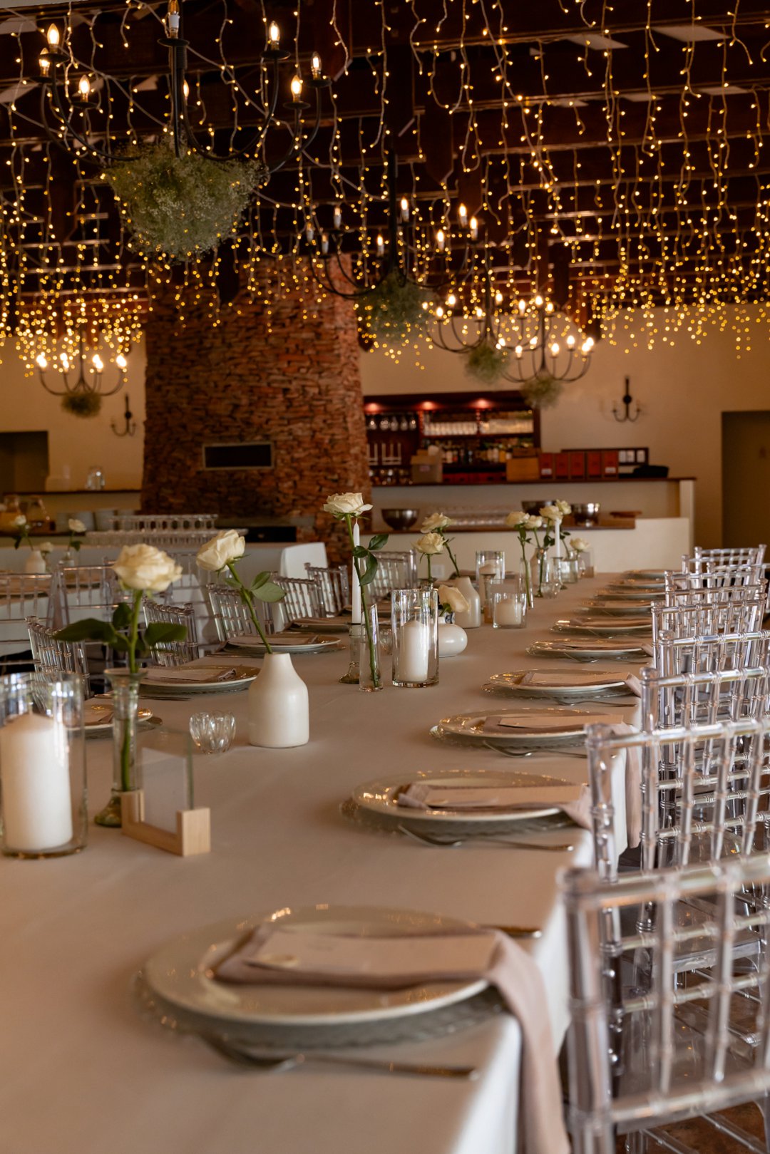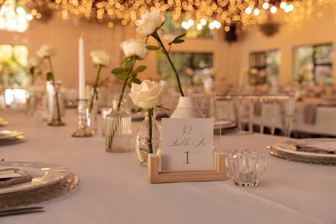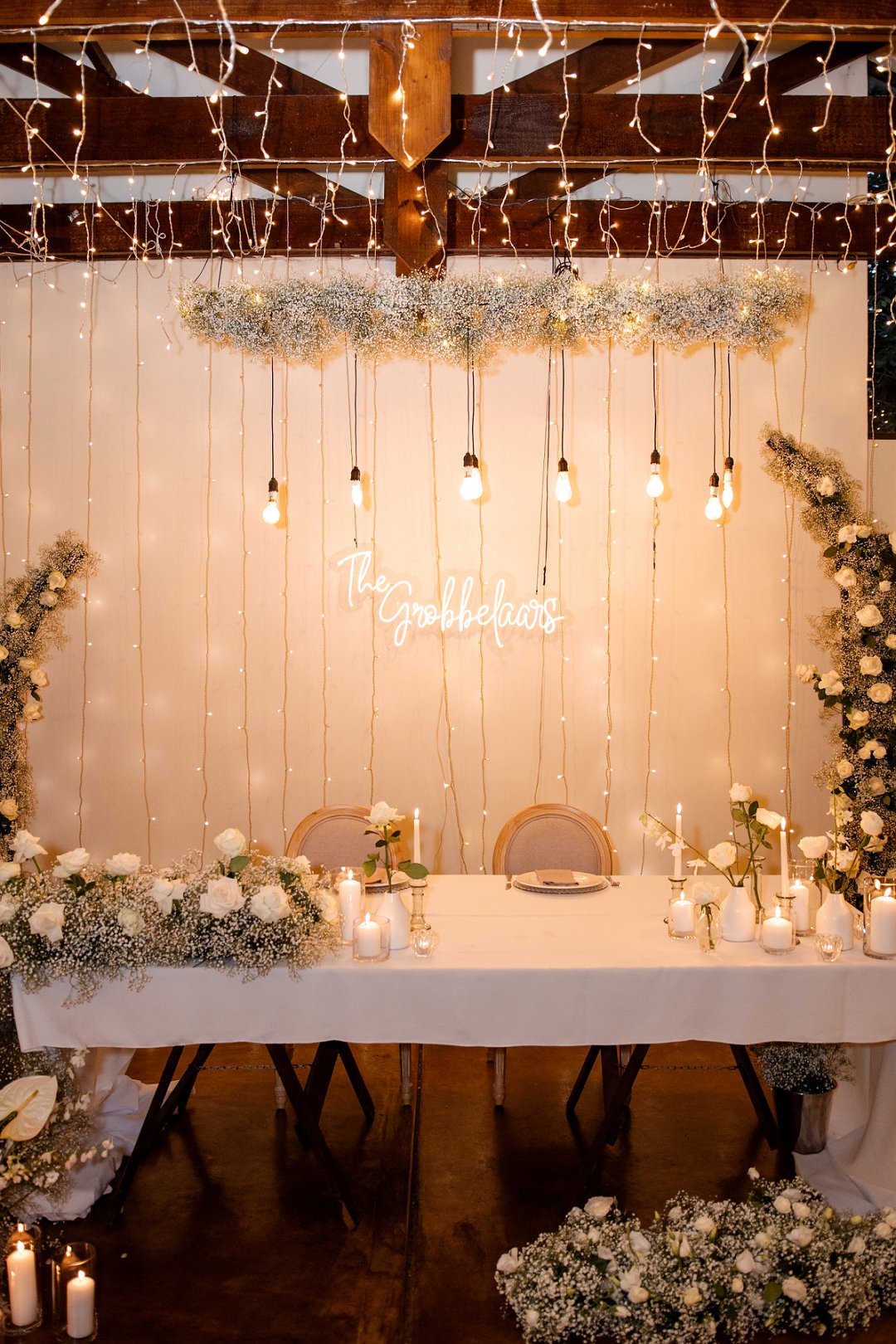 Die dekor was ’n minimalistiese, maar kragtige beeld van elegansie. Wit rose en gipskruid het pragtig teen die groen van die tuin uitgestaan, terwyl die onthaalruimte omskep is in ’n liggie-paradys. Dramatiese hangende feetjie liggies en gipskruid-kandelare het ’n romantiese sterre-effek geskep wat die venue só beïndruk het dat hulle die beligting as ’n permanente kenmerk behou het.