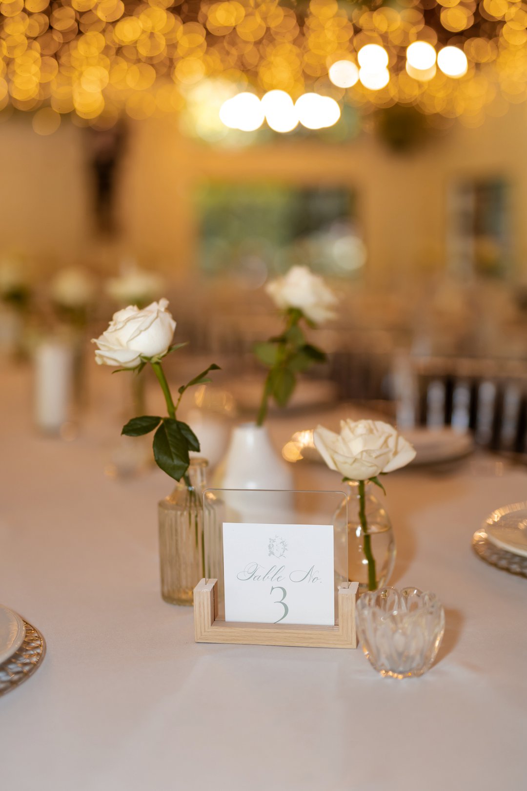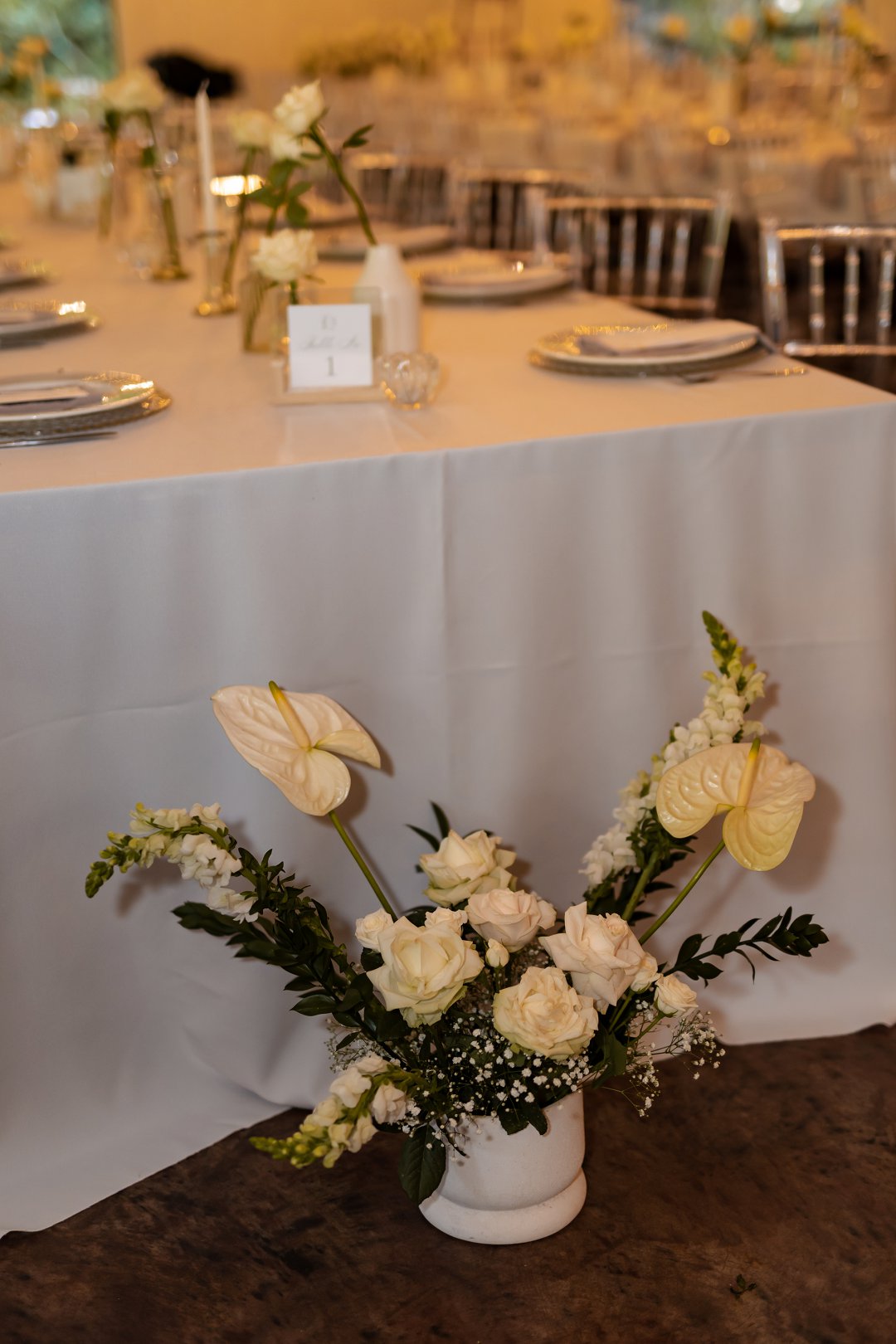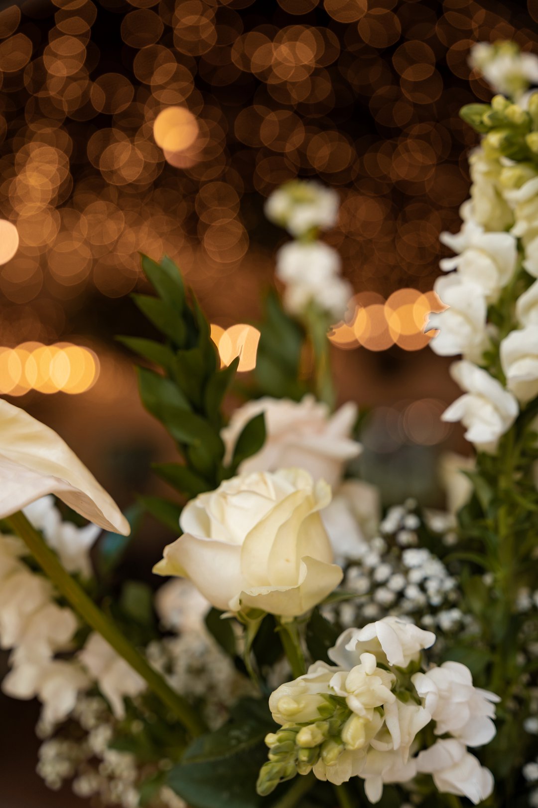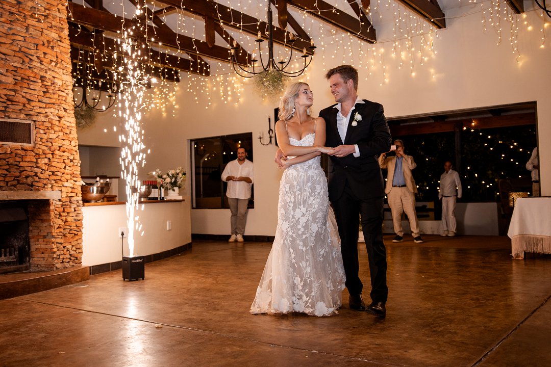 Die dekor was ’n minimalistiese, maar kragtige beeld van elegansie. Wit rose en gipskruid het pragtig teen die groen van die tuin uitgestaan, terwyl die onthaalruimte omskep is in ’n liggie-paradys. Dramatiese hangende feetjie liggies en gipskruid-kandelare het ’n romantiese sterre-effek geskep wat die venue só beïndruk het dat hulle die beligting as ’n permanente kenmerk behou het.