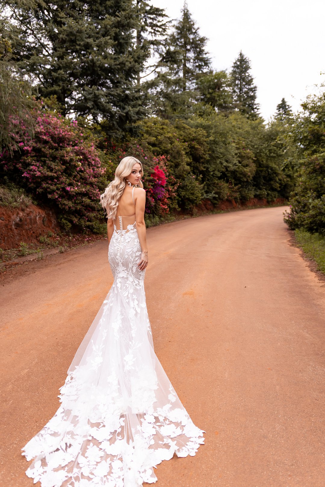 My trourok is die Enzoani “Tracie” – ’n pragtige, romantiese mermaid-styl rok wat jou op soveel maniere komplimenteer. Die rok het ’n klassieke strapless sweetheart-borslyn en ’n illusie-lace-rug wat jou figuur ongelooflik flatter. Ek het persoonlike bandjies bygevoeg vir ekstra ondersteuning. Die geborduurde blomlace onder die laag Chantilly-lace en glinsterende tulle, saam met unieke lyngewerkdetaille, skep ’n betowerende en elegante voorkoms. Die minimale striklint-detalje en lingerie-geïnspireerde pasvorm voeg ’n romantiese aanraking by, terwyl die rok in ’n dubbelgeskaalde lace-stert afstroom.