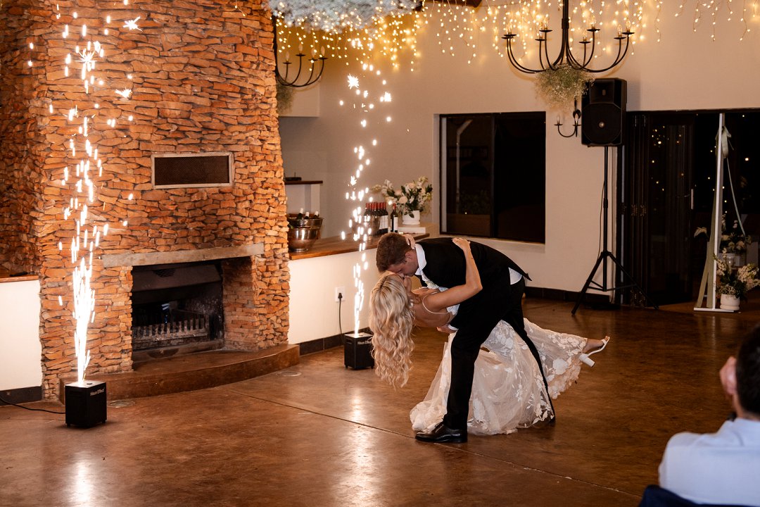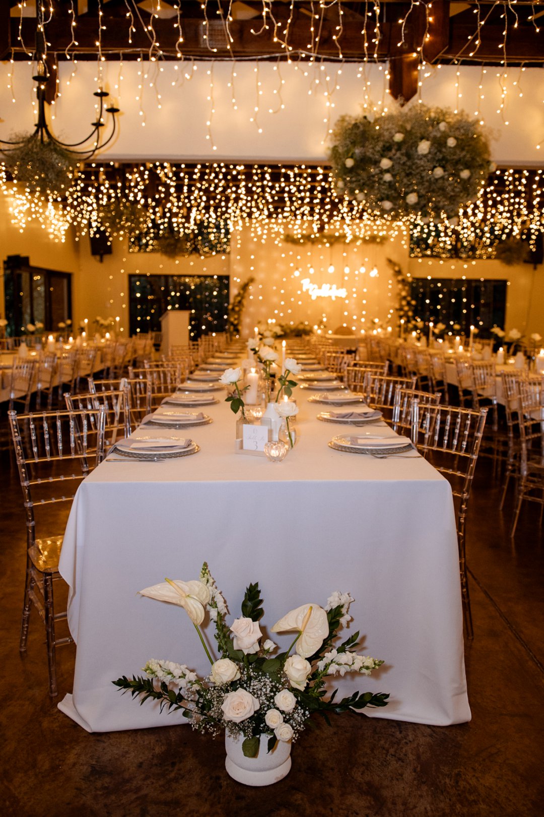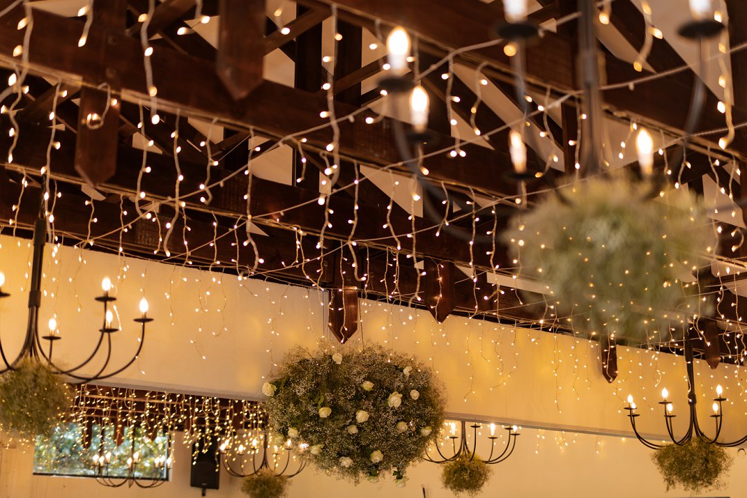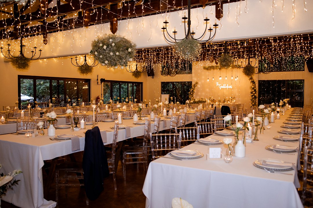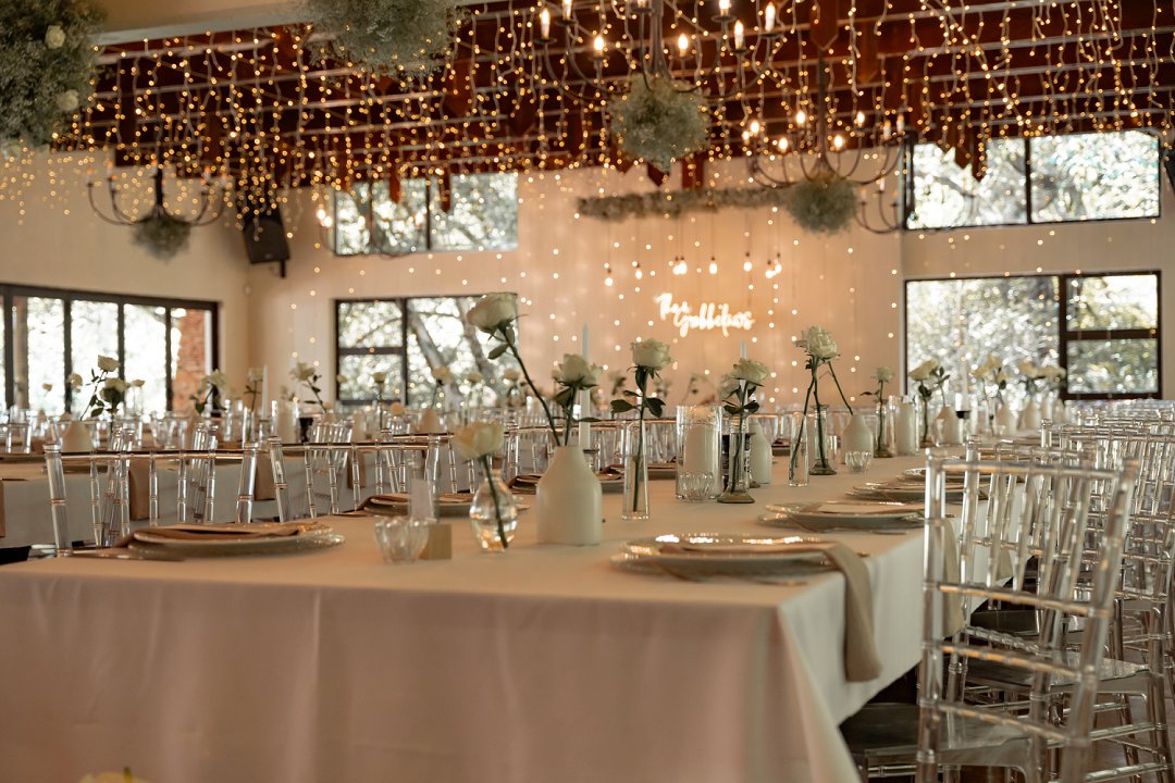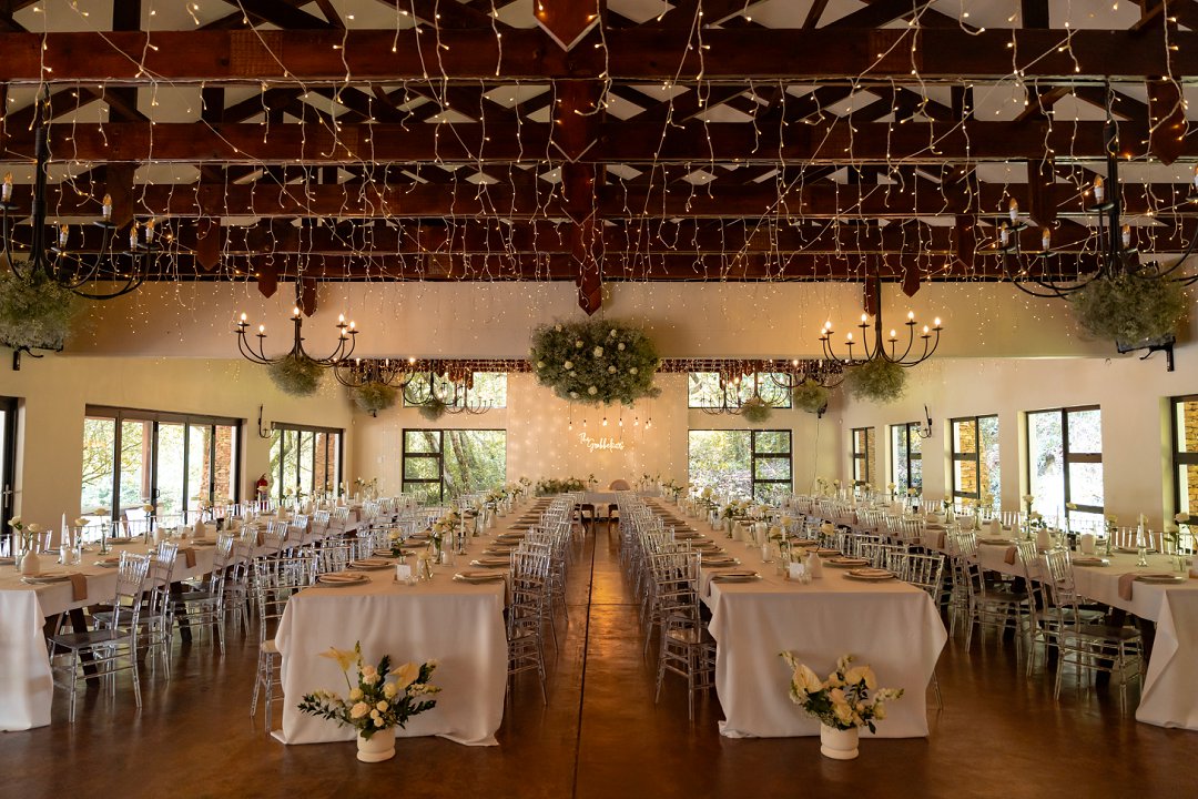 Vir die dekor het ons dramatiese hangende feesliggies in die onthaal gekies – ons het gevoel dat die beligting ’n sterker impak het as blomme alleen. Om die sprokies atmosfeer te versterk, het ons dit aangevul met hangende gyp-chandeliers wat tussen die liggies beweeg het. Die venue was so lief vir die liggies dat hulle dit selfs gekoop het en dit hang nou permanent daar – ’n mooi herinnering aan ons troue! Alles saam het ’n romantiese, sprokiesagtige gevoel geskep, met ’n styl wat my aan die TV series “Bridgerton” herinner het – elegant, verfyn en vol drome en betowering.