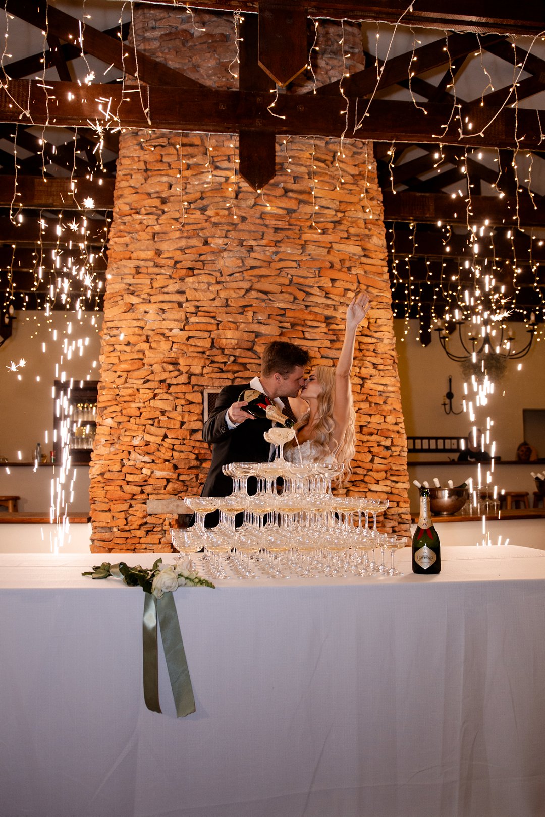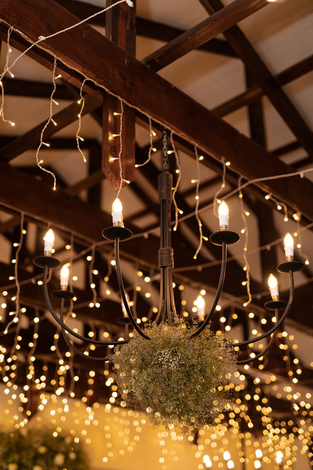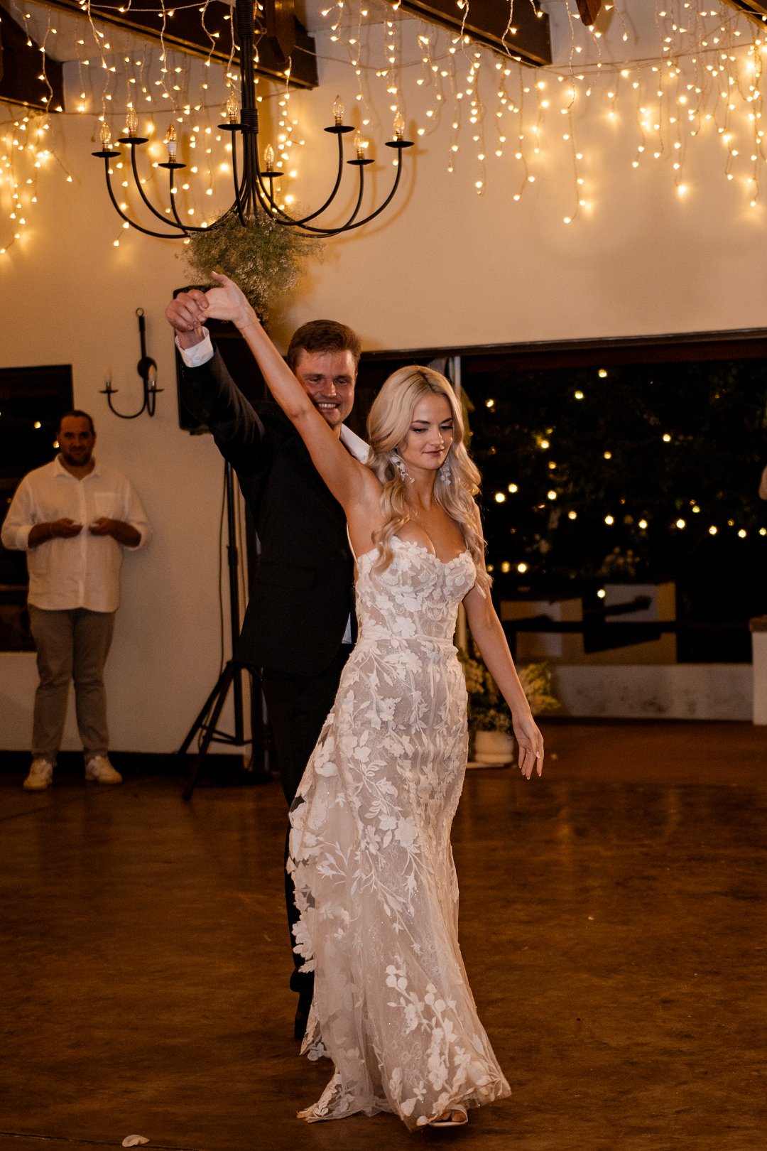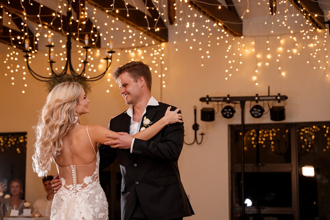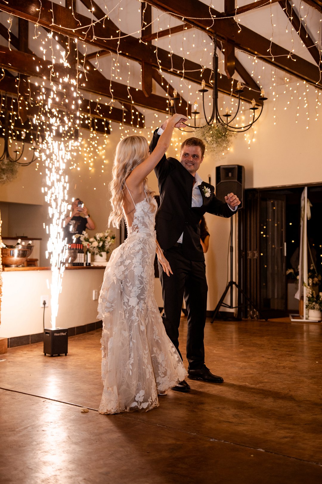 Vir die dekor het ons dramatiese hangende feesliggies in die onthaal gekies – ons het gevoel dat die beligting ’n sterker impak het as blomme alleen. Om die sprokies atmosfeer te versterk, het ons dit aangevul met hangende gyp-chandeliers wat tussen die liggies beweeg het. Die venue was so lief vir die liggies dat hulle dit selfs gekoop het en dit hang nou permanent daar – ’n mooi herinnering aan ons troue! Alles saam het ’n romantiese, sprokiesagtige gevoel geskep, met ’n styl wat my aan die TV series “Bridgerton” herinner het – elegant, verfyn en vol drome en betowering.
