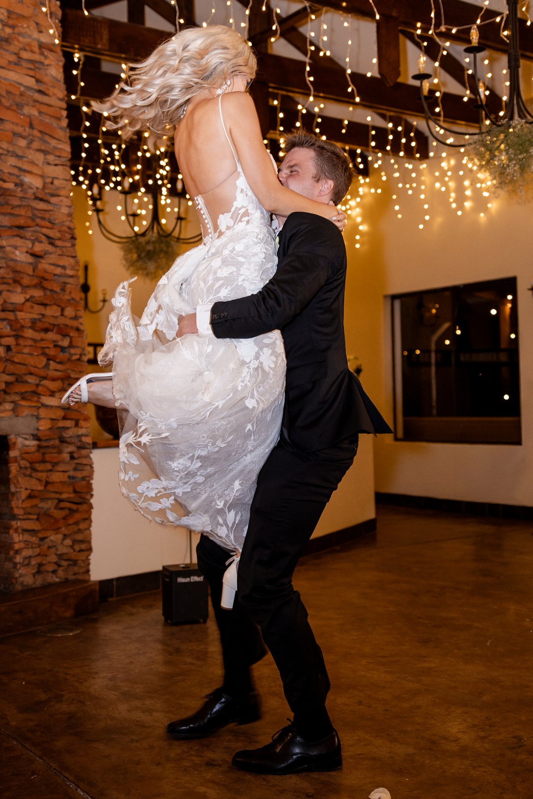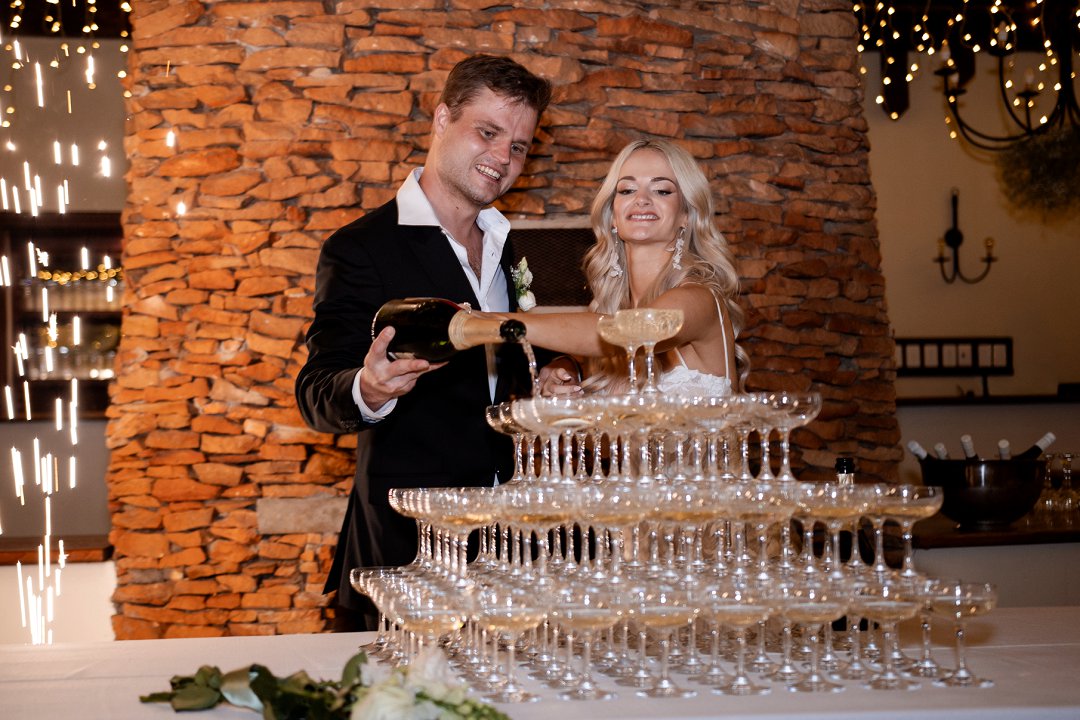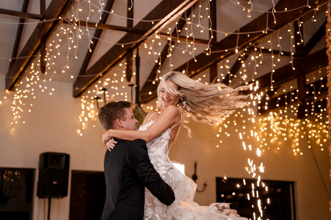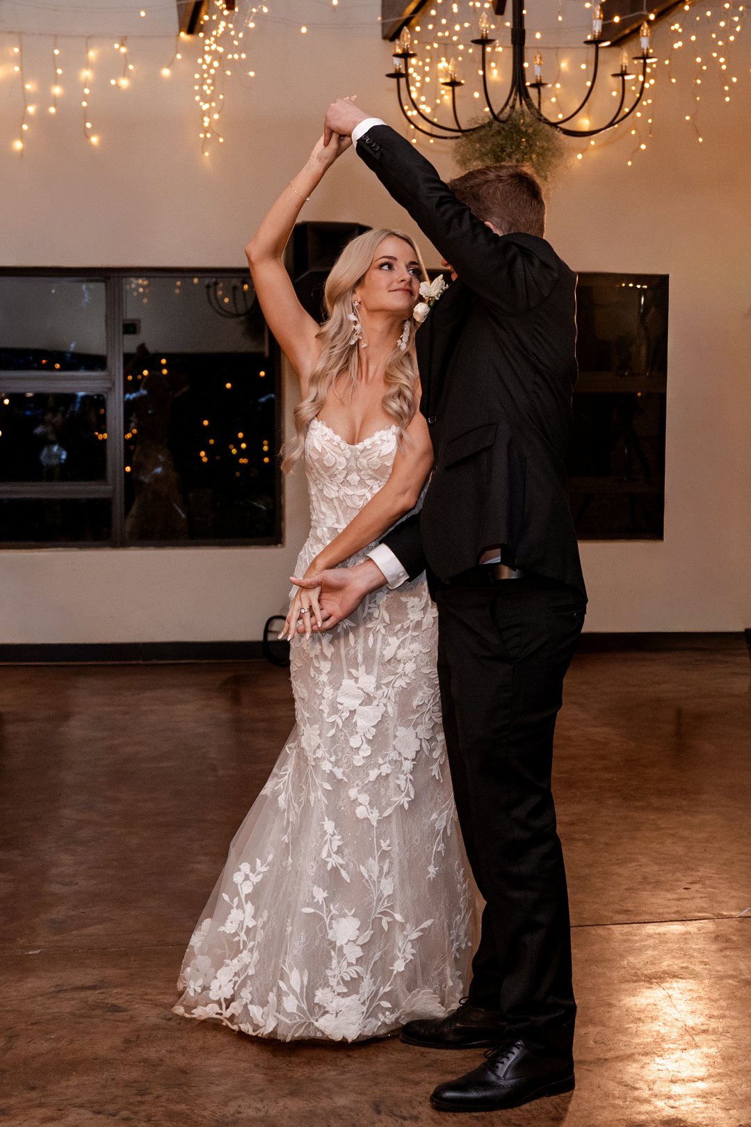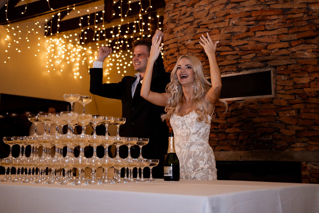 Vir die dekor het ons dramatiese hangende feesliggies in die onthaal gekies – ons het gevoel dat die beligting ’n sterker impak het as blomme alleen. Om die sprokies atmosfeer te versterk, het ons dit aangevul met hangende gyp-chandeliers wat tussen die liggies beweeg het. Die venue was so lief vir die liggies dat hulle dit selfs gekoop het en dit hang nou permanent daar – ’n mooi herinnering aan ons troue! Alles saam het ’n romantiese, sprokiesagtige gevoel geskep, met ’n styl wat my aan die TV series “Bridgerton” herinner het – elegant, verfyn en vol drome en betowering.