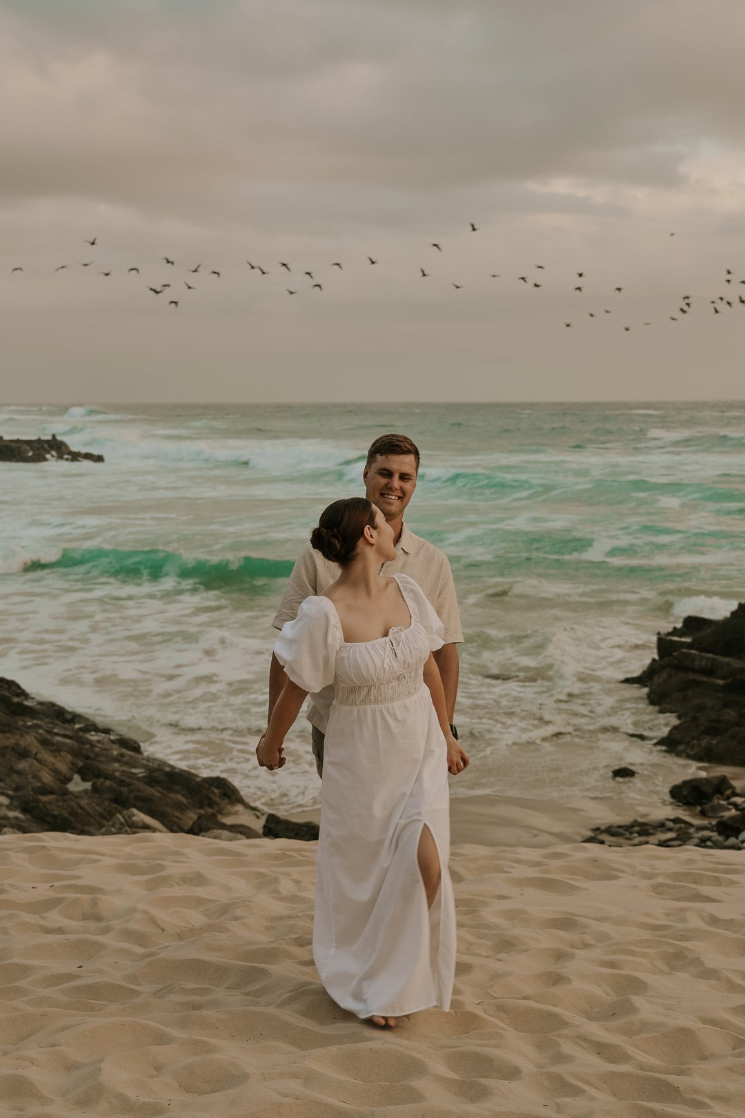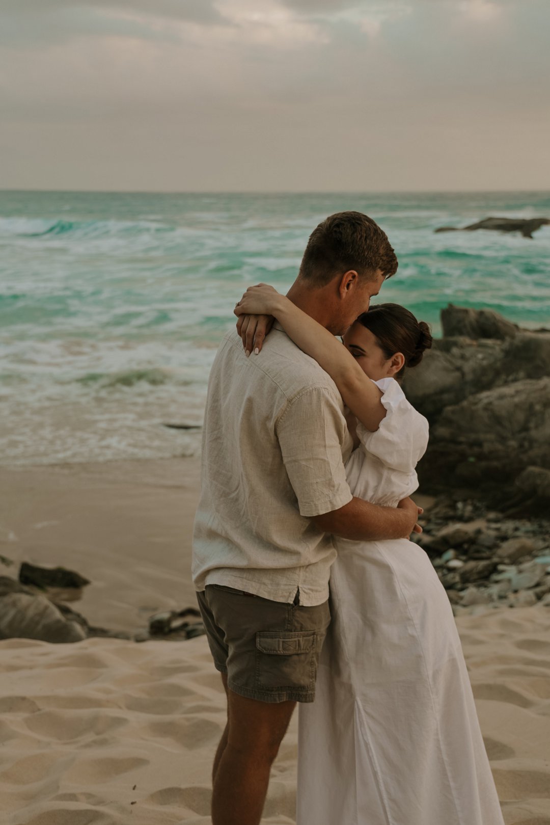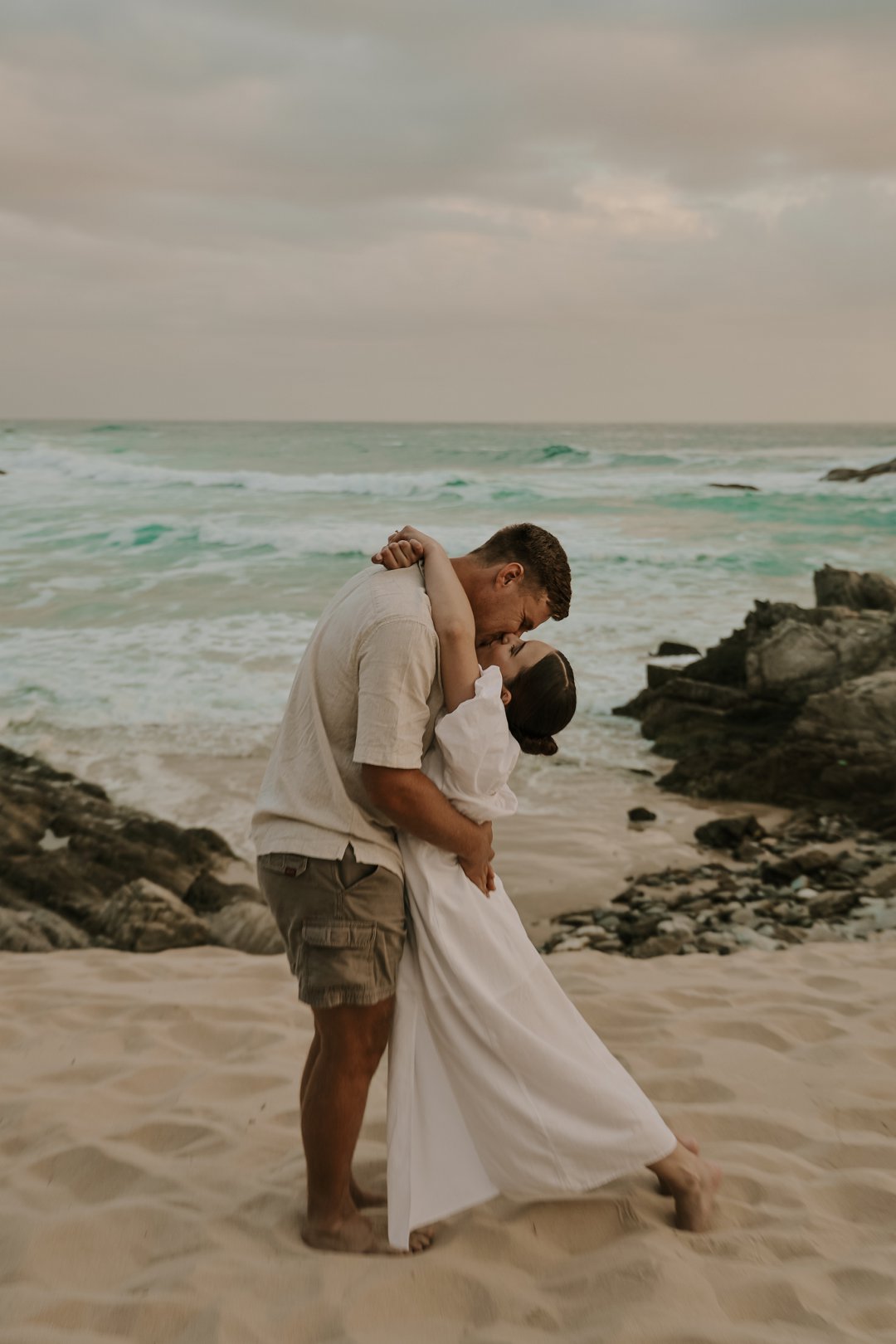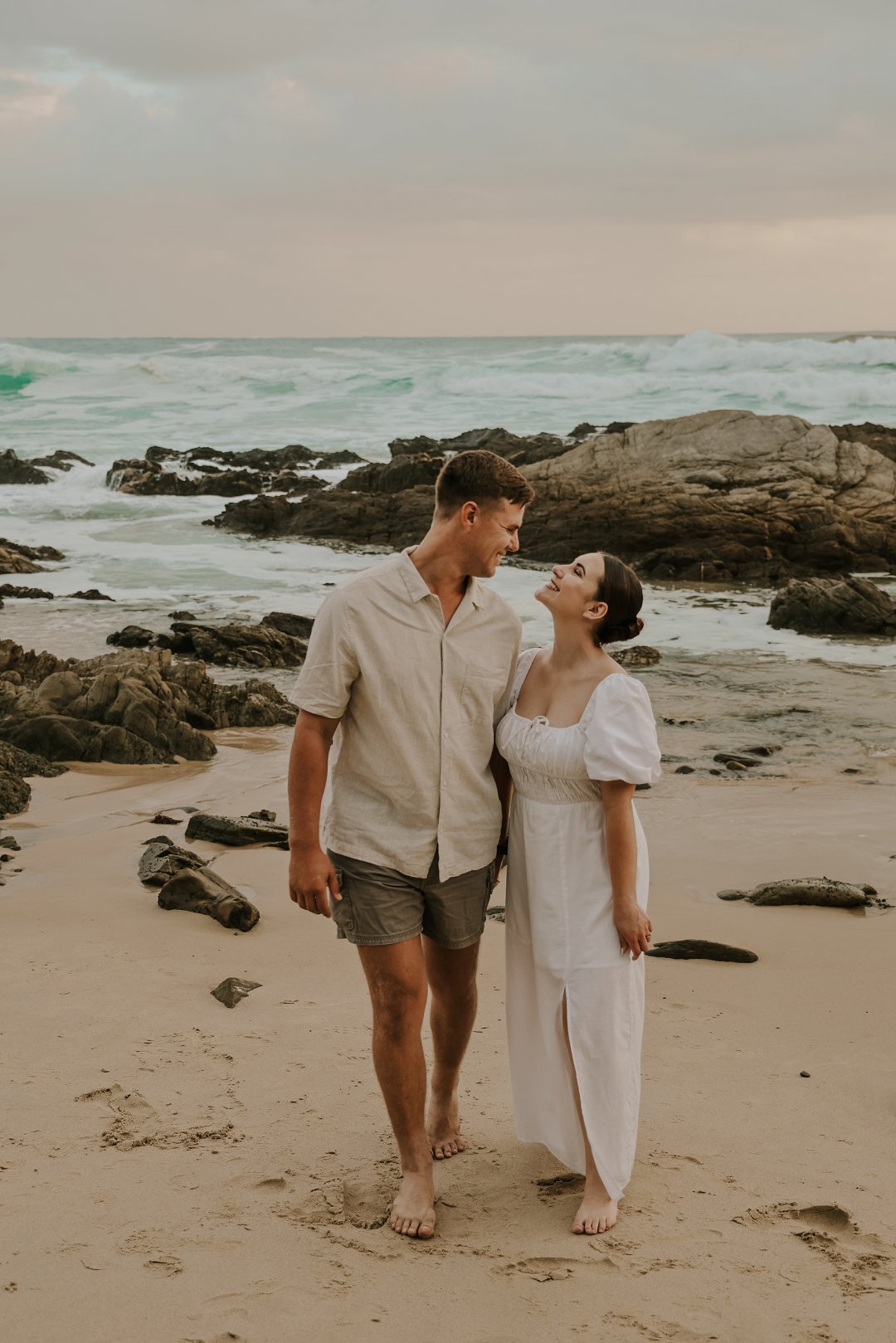 Soos die lig verander het, het die paartjie na die strand beweeg waar die atmosfeer onmiddellik oop en dromerig geword het. Hier het die swaarder teksture plek gemaak vir ligter, vloeiende materiale wat saam met die seebries beweeg. Die kleurskema het verskuif na ligter skakerings wat die spel van die son op die water komplimenteer. Kaalvoet-oomblikke op die sand het gesorg vir ’n speelse, ongedwonge energie wat die kontras met die gestruktureerde woud perfek voltooi het.