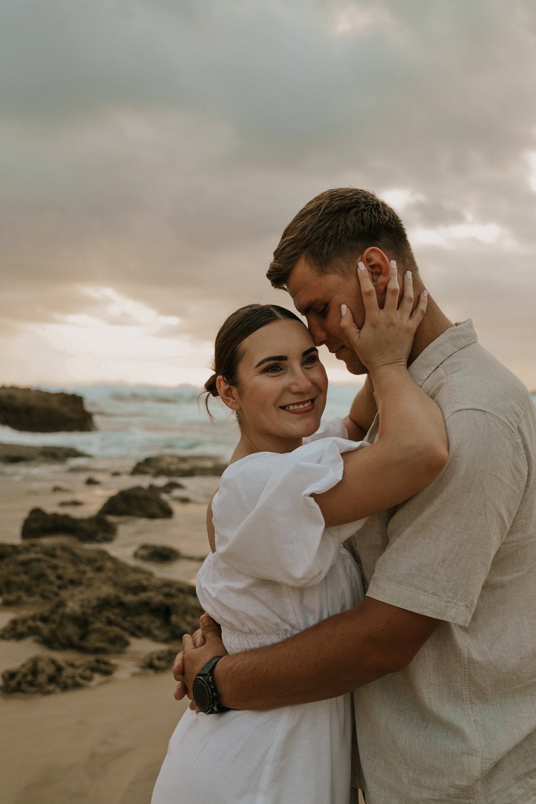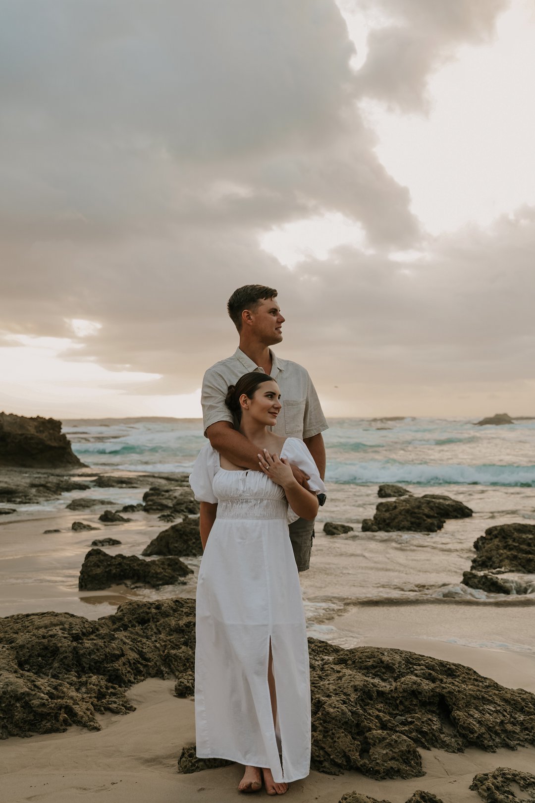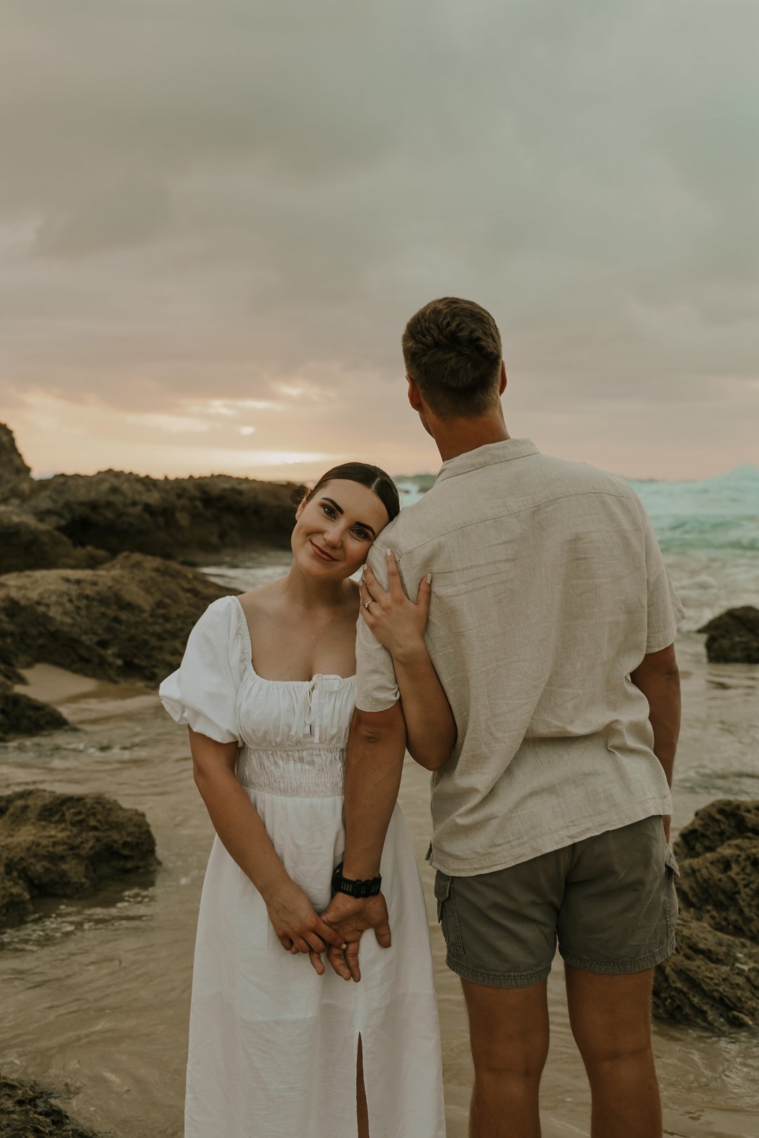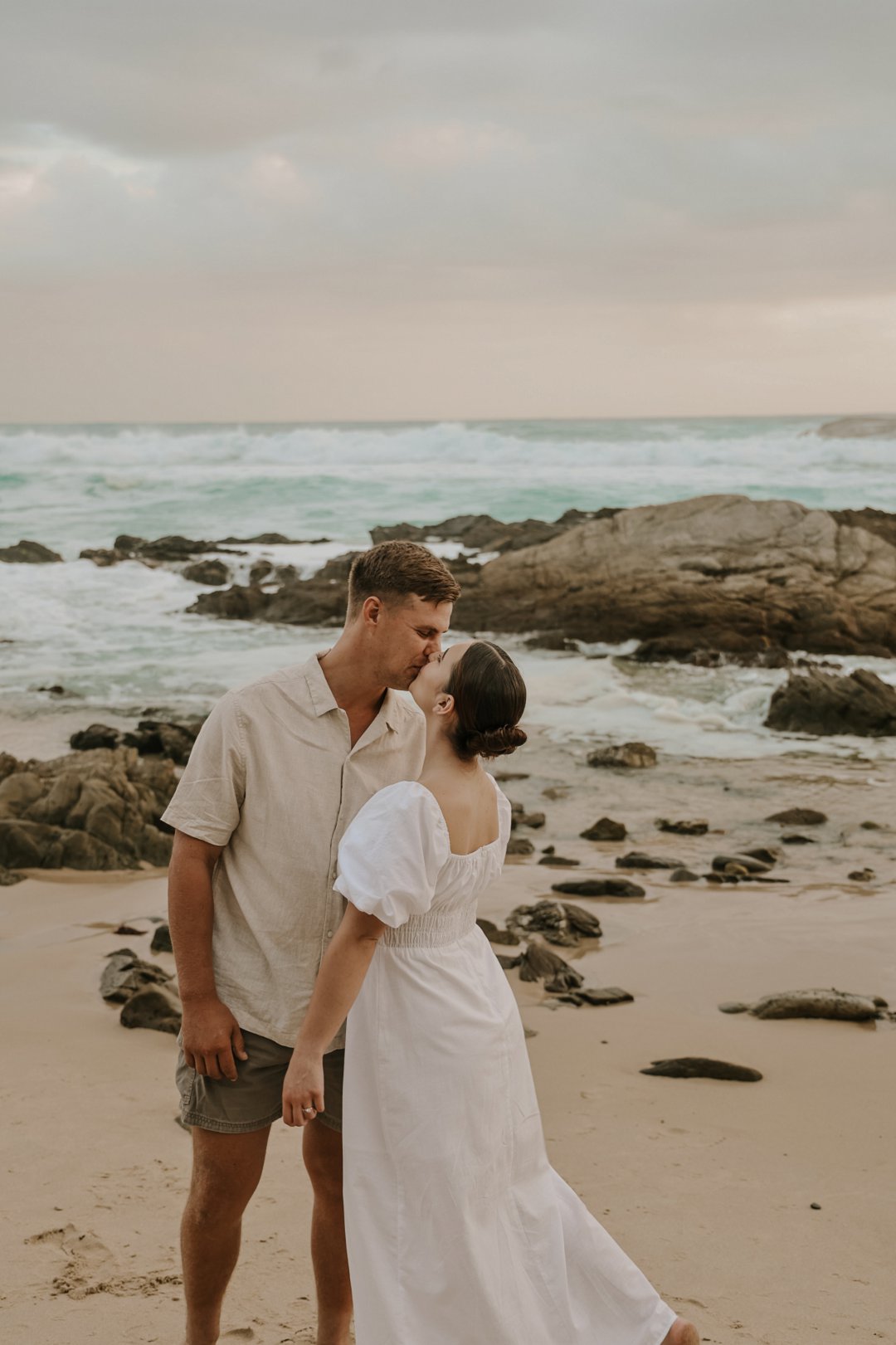 Soos die lig verander het, het die paartjie na die strand beweeg waar die atmosfeer onmiddellik oop en dromerig geword het. Hier het die swaarder teksture plek gemaak vir ligter, vloeiende materiale wat saam met die seebries beweeg. Die kleurskema het verskuif na ligter skakerings wat die spel van die son op die water komplimenteer. Kaalvoet-oomblikke op die sand het gesorg vir ’n speelse, ongedwonge energie wat die kontras met die gestruktureerde woud perfek voltooi het.