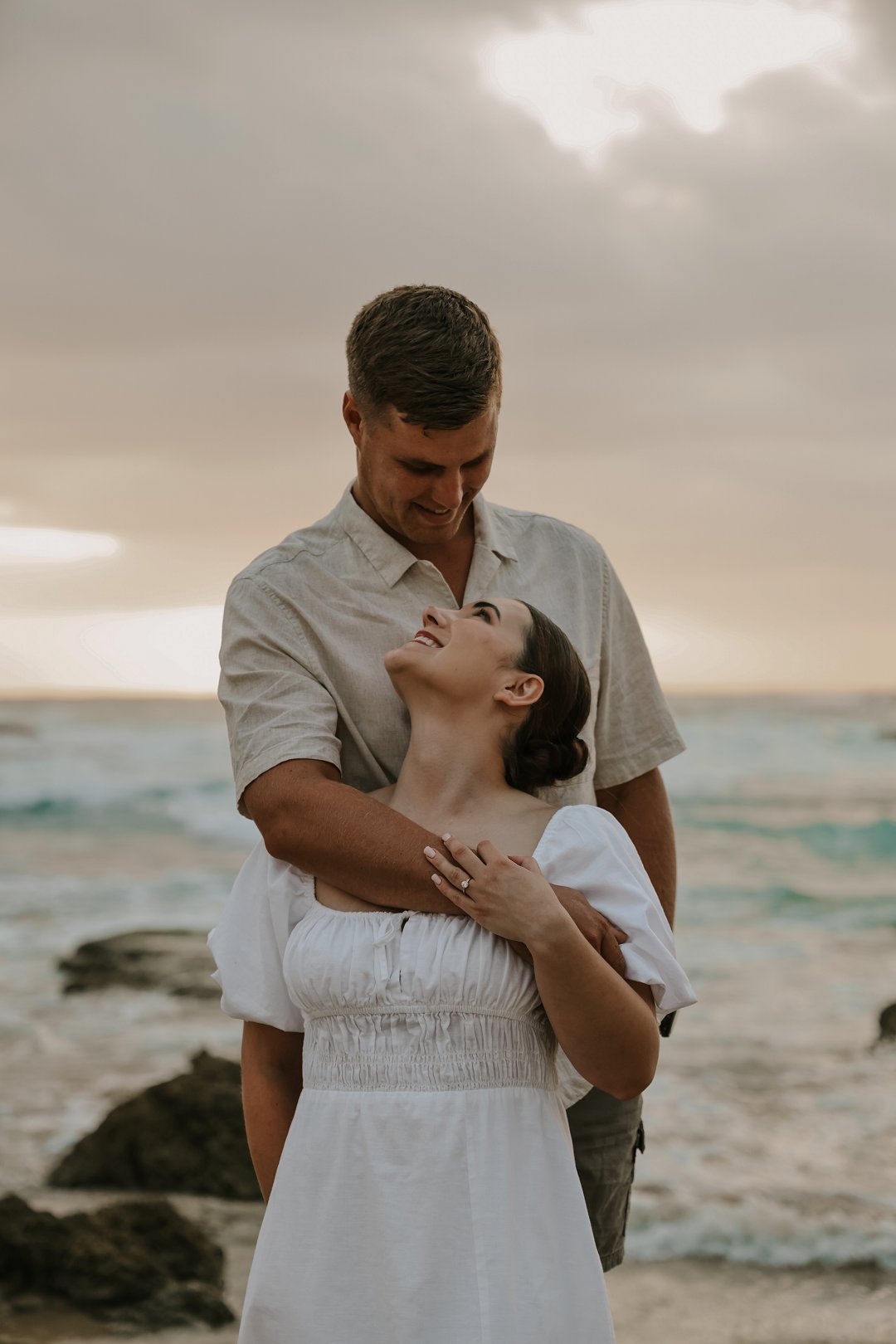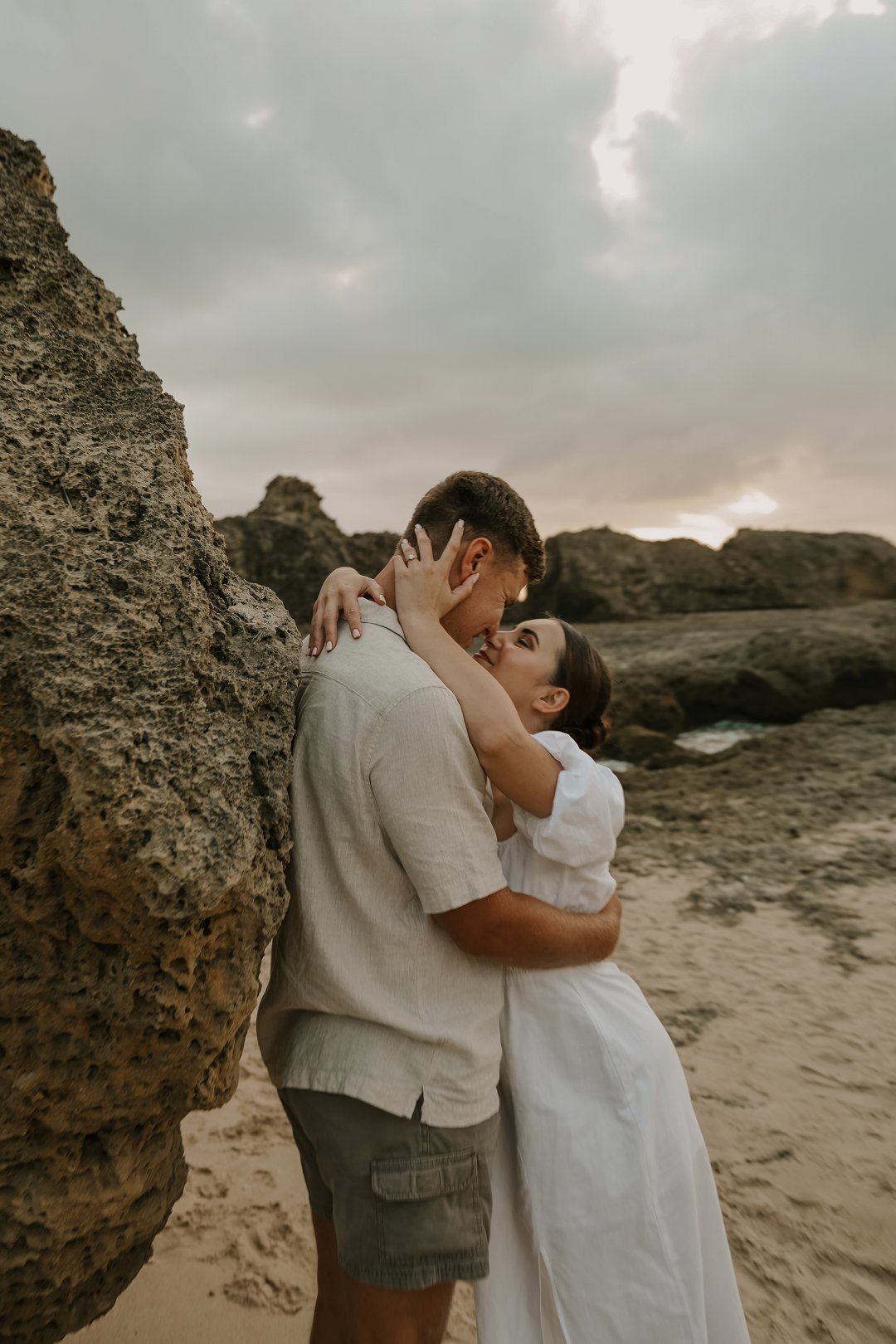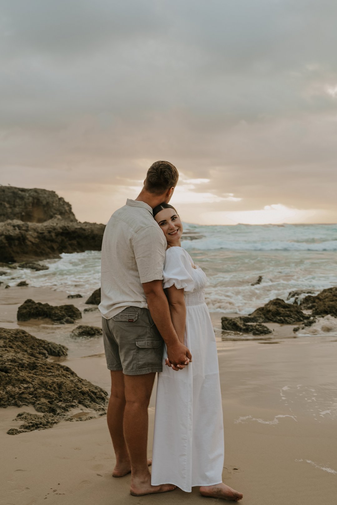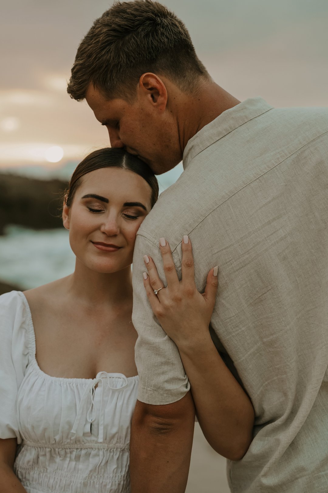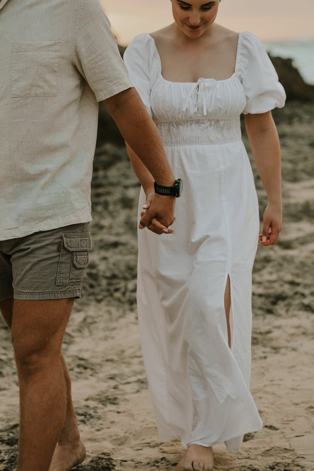Soos die lig verander het, het die paartjie na die strand beweeg waar die atmosfeer onmiddellik oop en dromerig geword het. Hier het die swaarder teksture plek gemaak vir ligter, vloeiende materiale wat saam met die seebries beweeg. Die kleurskema het verskuif na ligter skakerings wat die spel van die son op die water komplimenteer. Kaalvoet-oomblikke op die sand het gesorg vir ’n speelse, ongedwonge energie wat die kontras met die gestruktureerde woud perfek voltooi het.