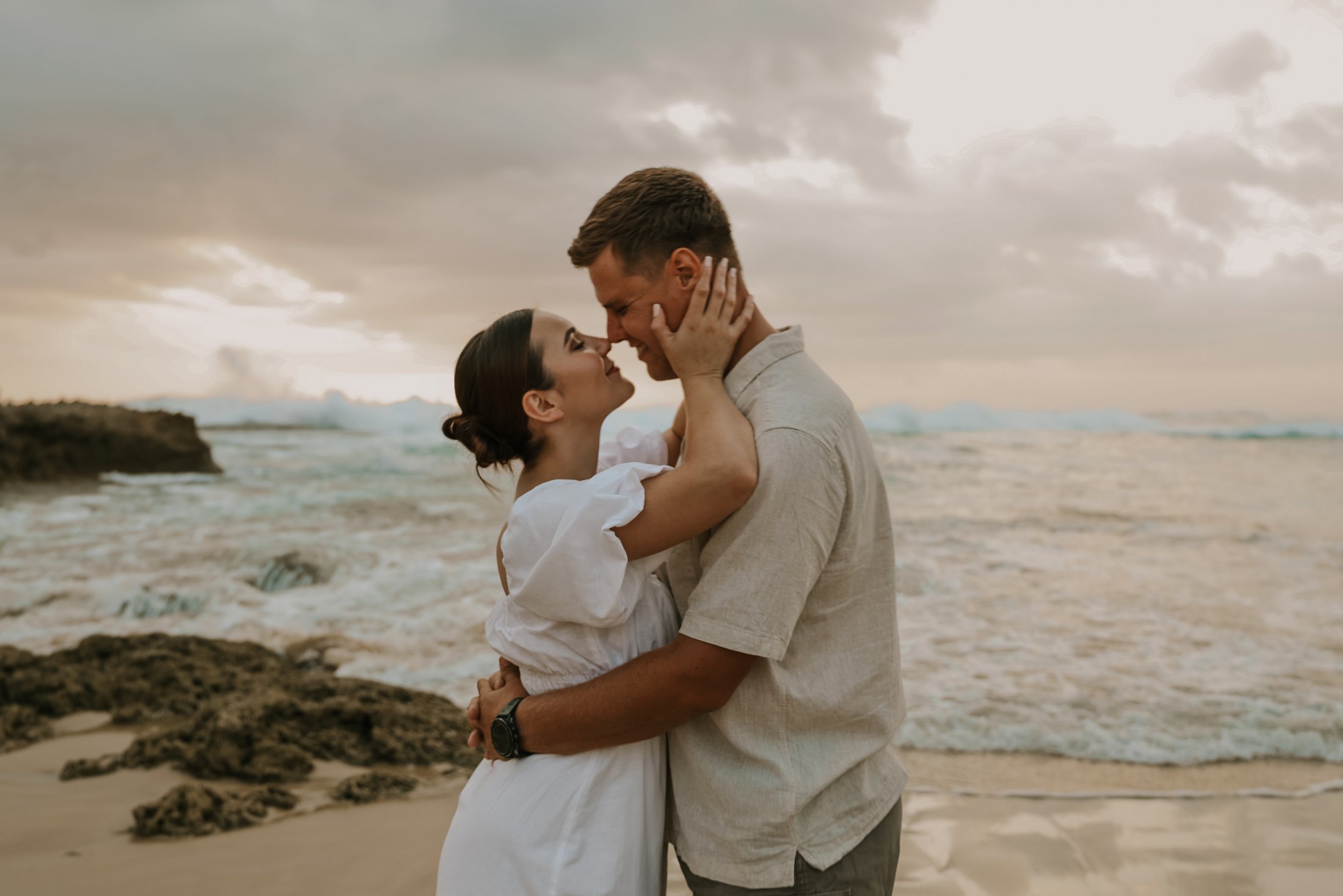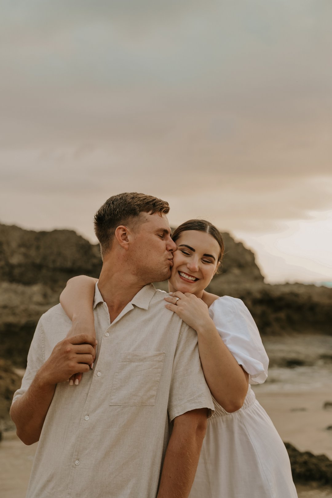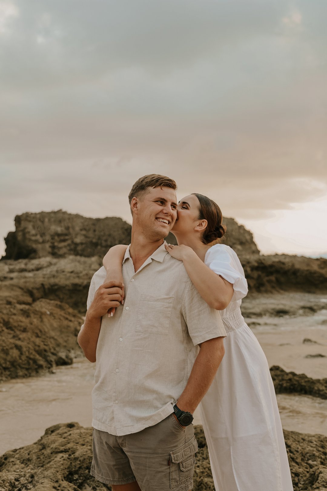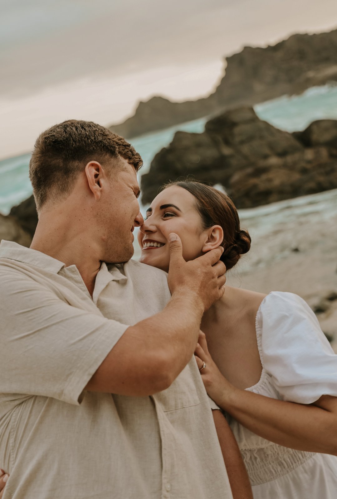 Soos die lig verander het, het die paartjie na die strand beweeg waar die atmosfeer onmiddellik oop en dromerig geword het. Hier het die swaarder teksture plek gemaak vir ligter, vloeiende materiale wat saam met die seebries beweeg. Die kleurskema het verskuif na ligter skakerings wat die spel van die son op die water komplimenteer. Kaalvoet-oomblikke op die sand het gesorg vir ’n speelse, ongedwonge energie wat die kontras met die gestruktureerde woud perfek voltooi het.