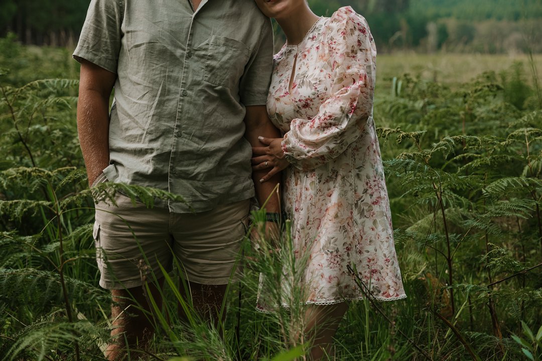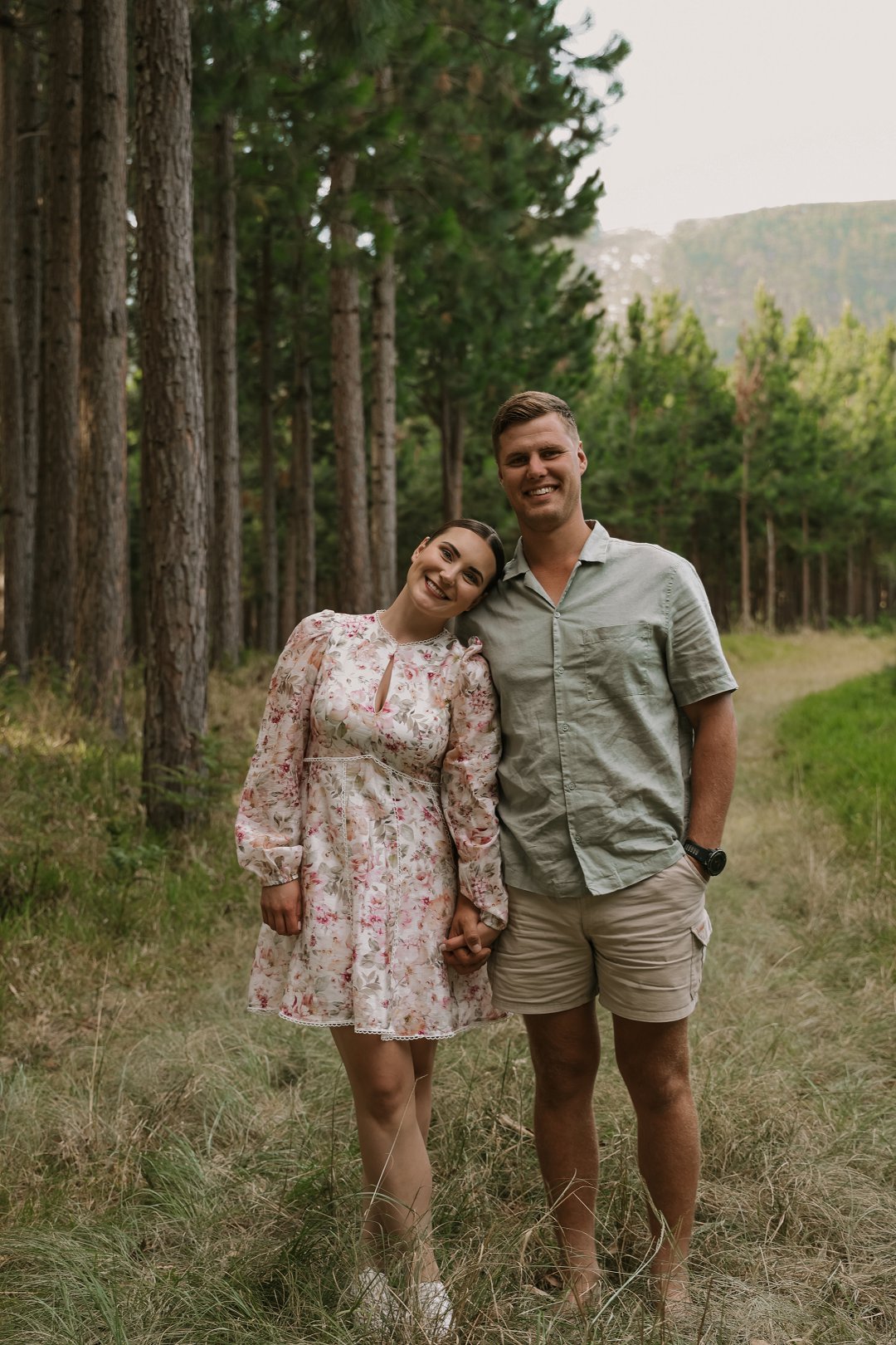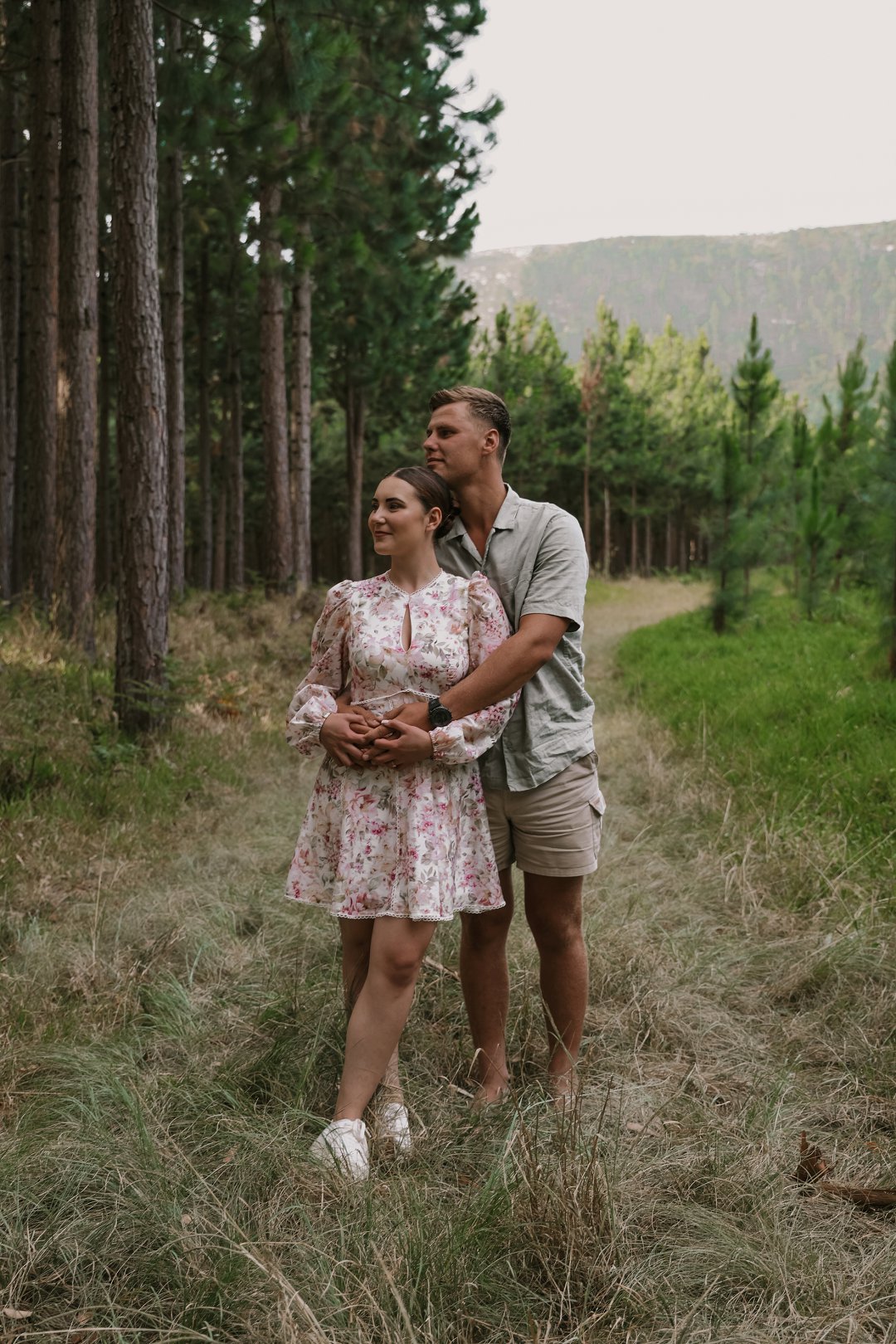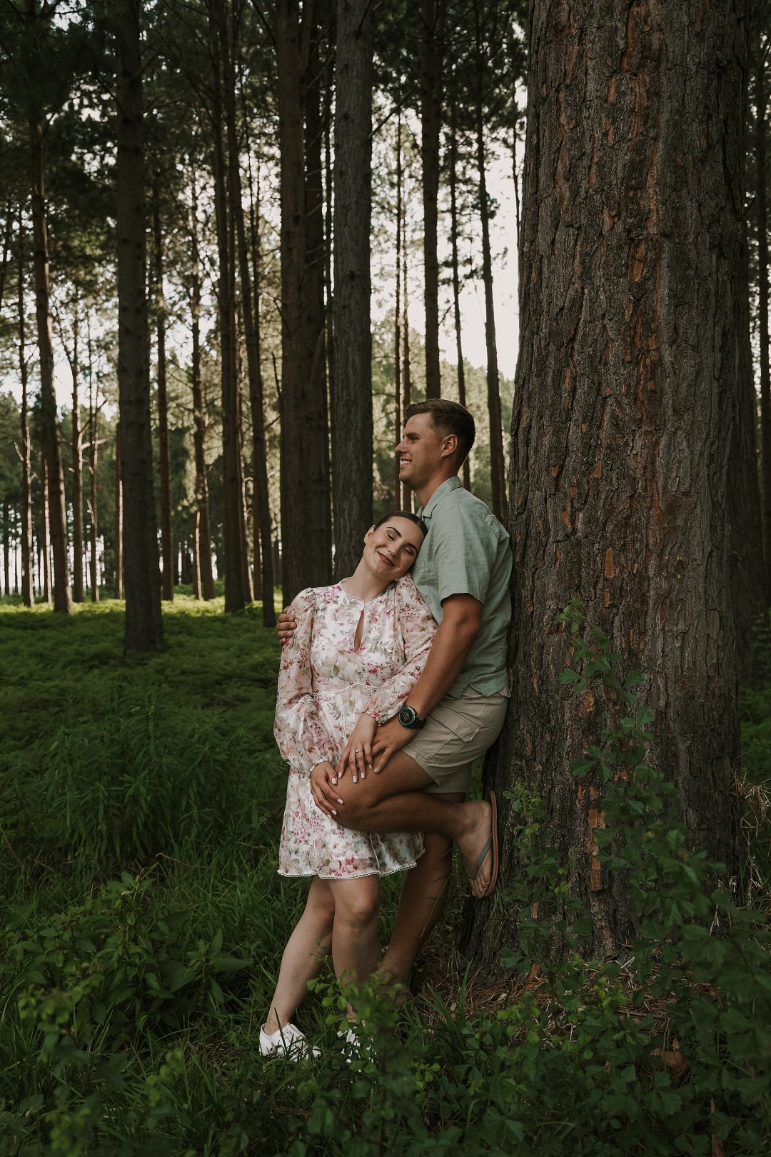 In die eerste deel van die sessie het die digte blaredak van die woud ’n intieme, aardse atmosfeer geskep. Hier was die fokus op tekstuur en warmte. Christian en Ané het gekies vir uitrustings wat saamsmelt met die natuurlike elemente van die bos. Dink aan neutrale kleure en stewige skoene wat perfek pas by die “innibos”-gevoel van hul komende trouvenue. Die sagte lig wat deur die bome filtreer, het ’n gevoel van geborgenheid en tydlose romanse beklemtoon.