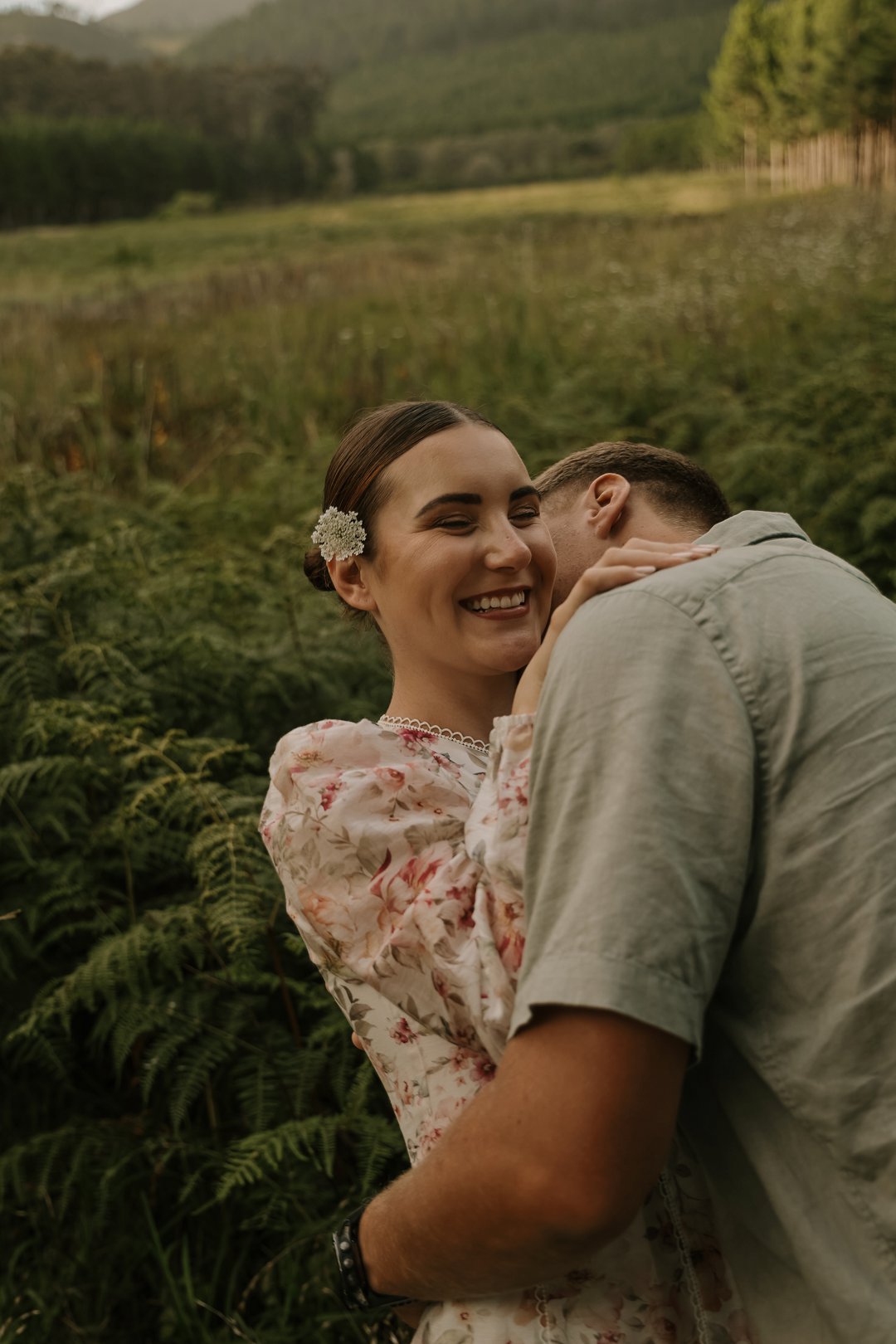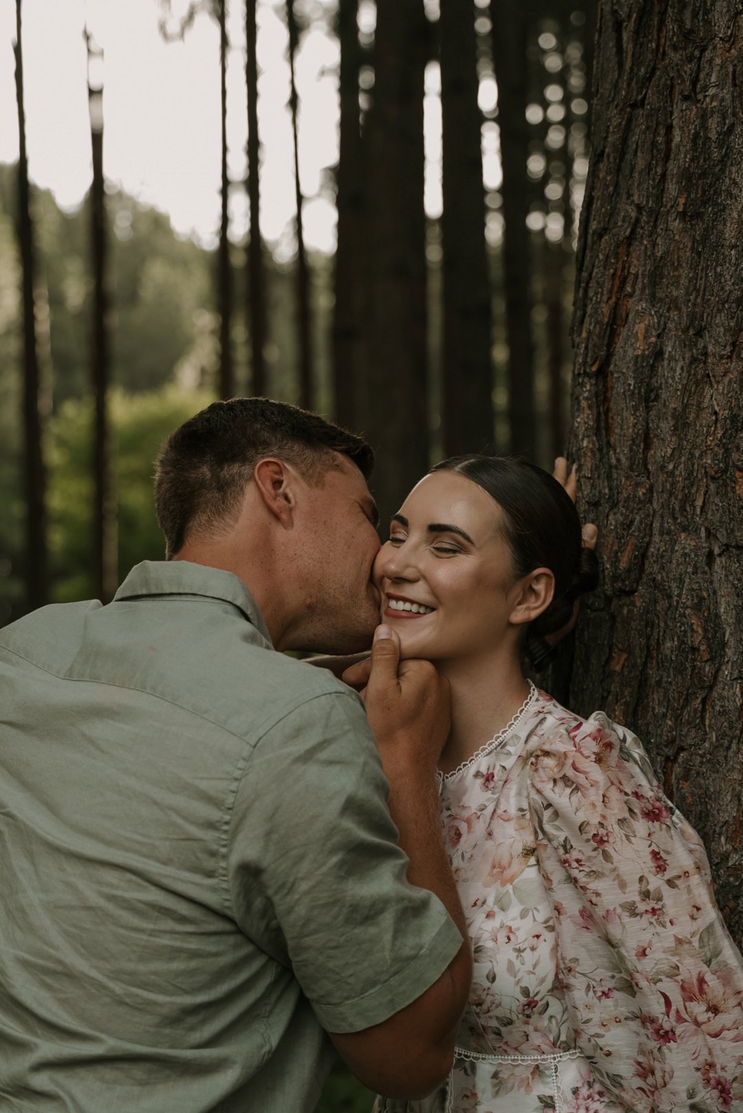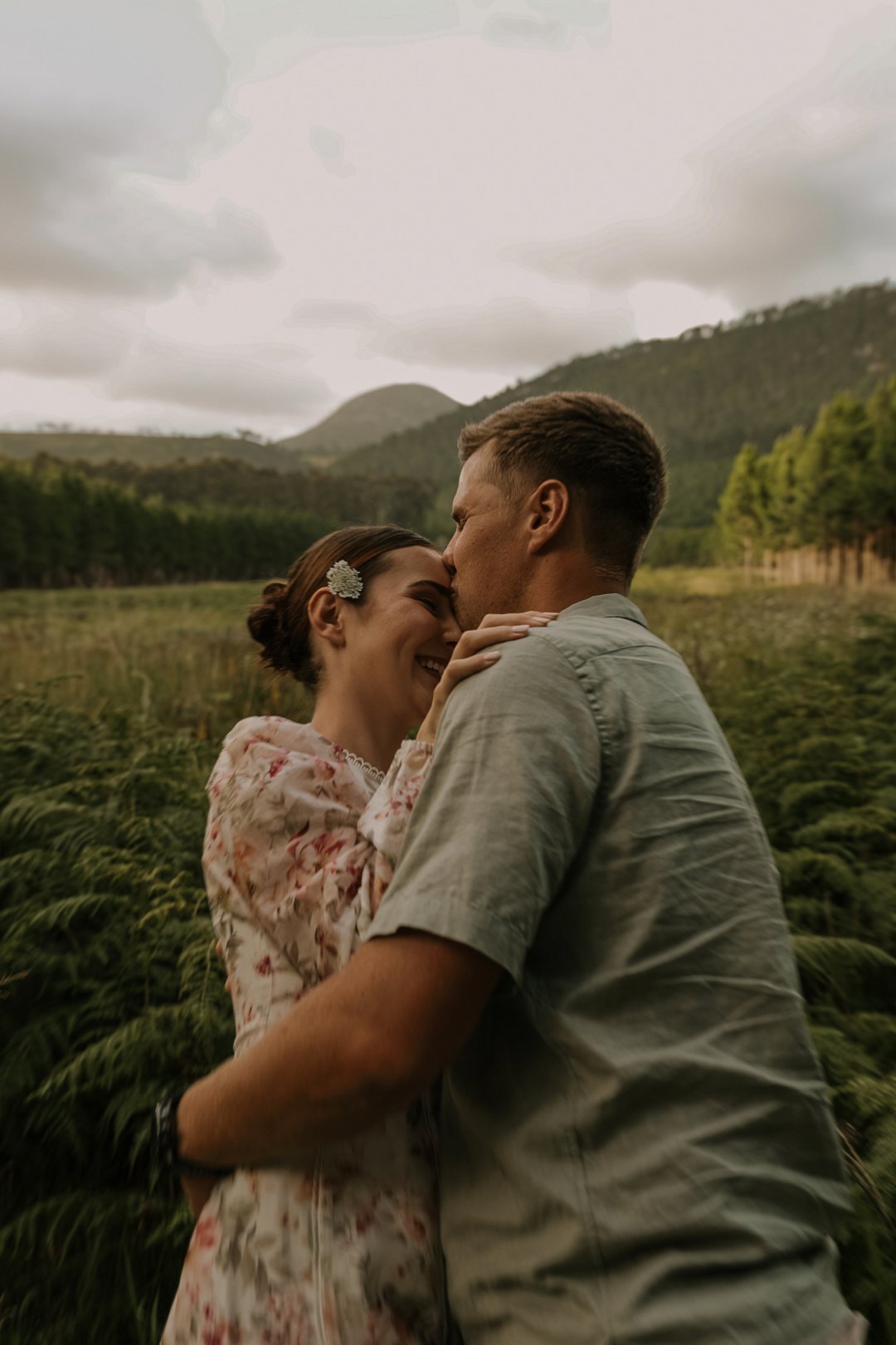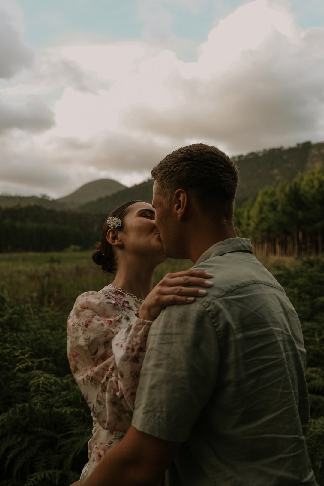 In die eerste deel van die sessie het die digte blaredak van die woud ’n intieme, aardse atmosfeer geskep. Hier was die fokus op tekstuur en warmte. Christian en Ané het gekies vir uitrustings wat saamsmelt met die natuurlike elemente van die bos. Dink aan neutrale kleure en stewige skoene wat perfek pas by die “innibos”-gevoel van hul komende trouvenue. Die sagte lig wat deur die bome filtreer, het ’n gevoel van geborgenheid en tydlose romanse beklemtoon.