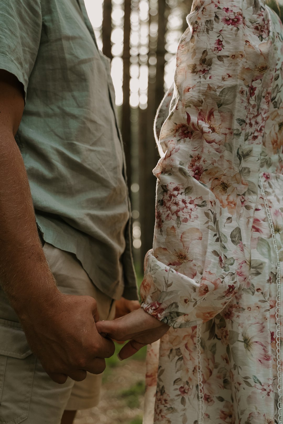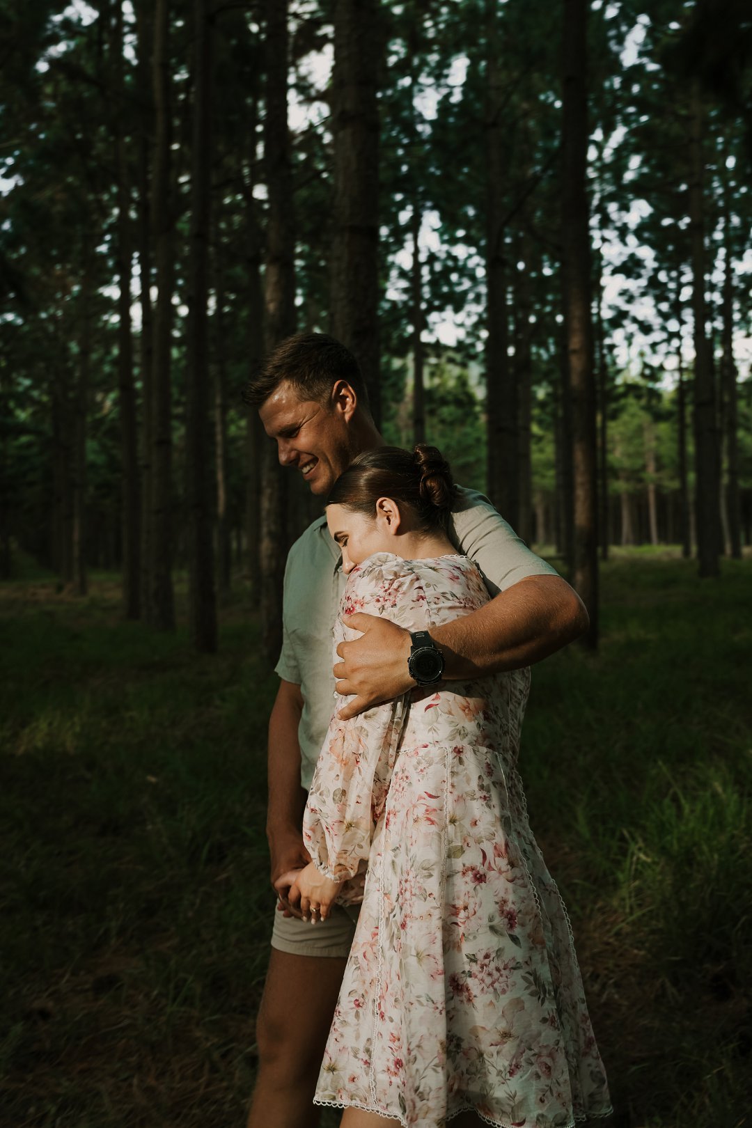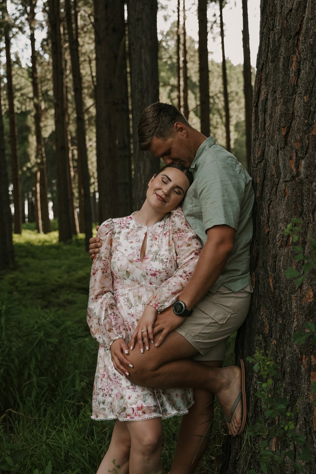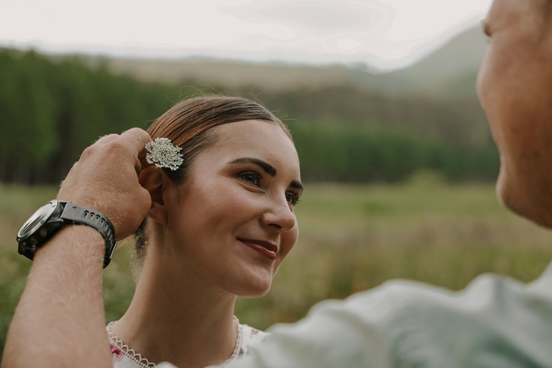 In die eerste deel van die sessie het die digte blaredak van die woud ’n intieme, aardse atmosfeer geskep. Hier was die fokus op tekstuur en warmte. Christian en Ané het gekies vir uitrustings wat saamsmelt met die natuurlike elemente van die bos. Dink aan neutrale kleure en stewige skoene wat perfek pas by die “innibos”-gevoel van hul komende trouvenue. Die sagte lig wat deur die bome filtreer, het ’n gevoel van geborgenheid en tydlose romanse beklemtoon.