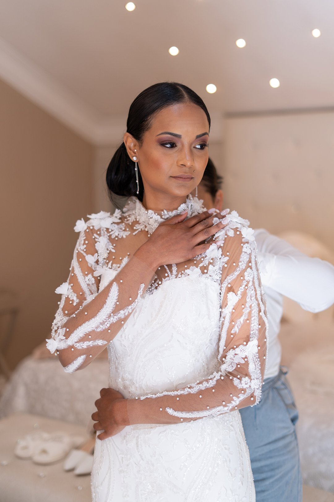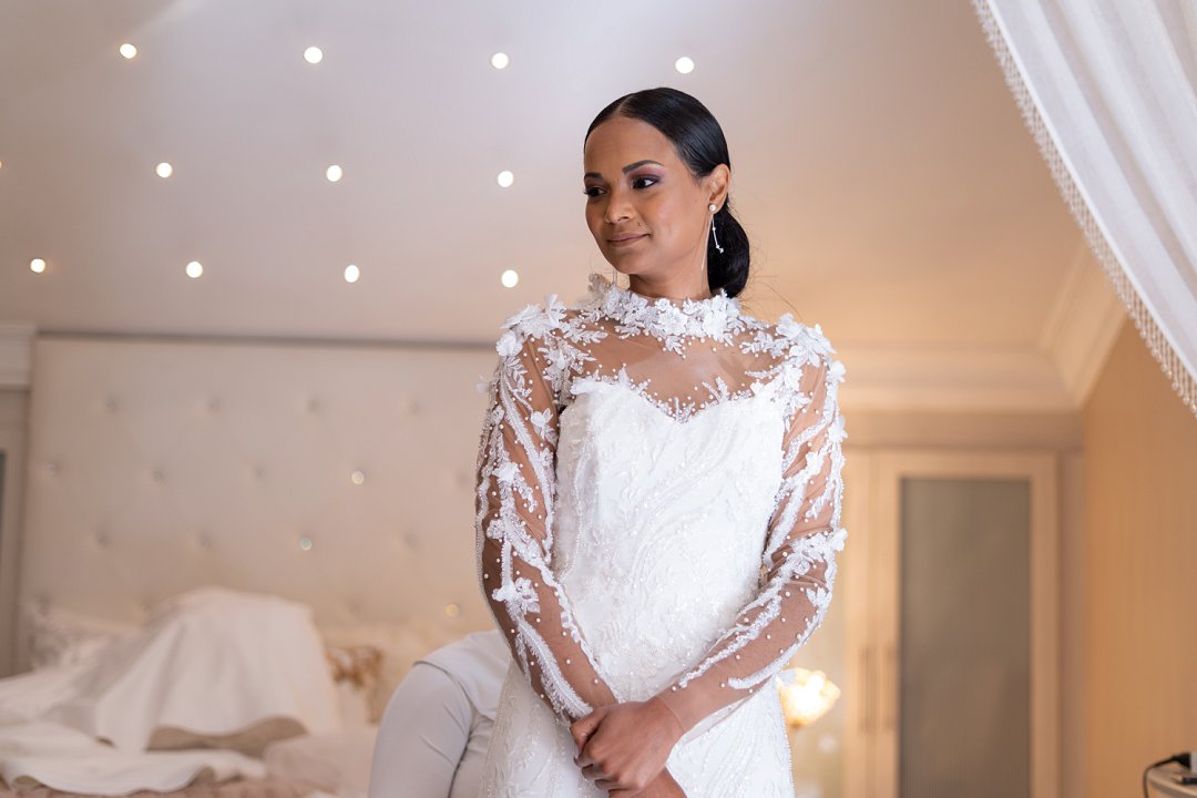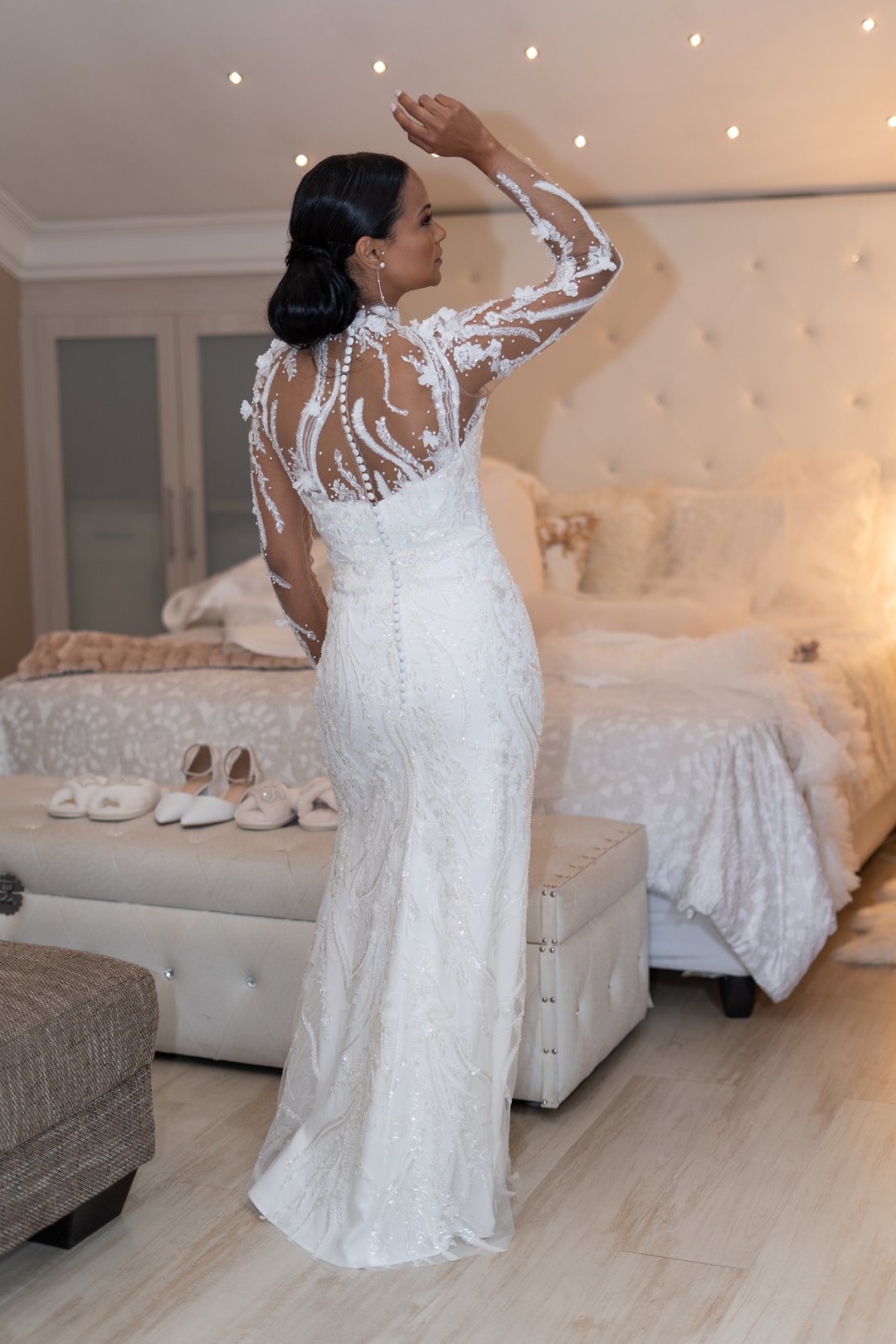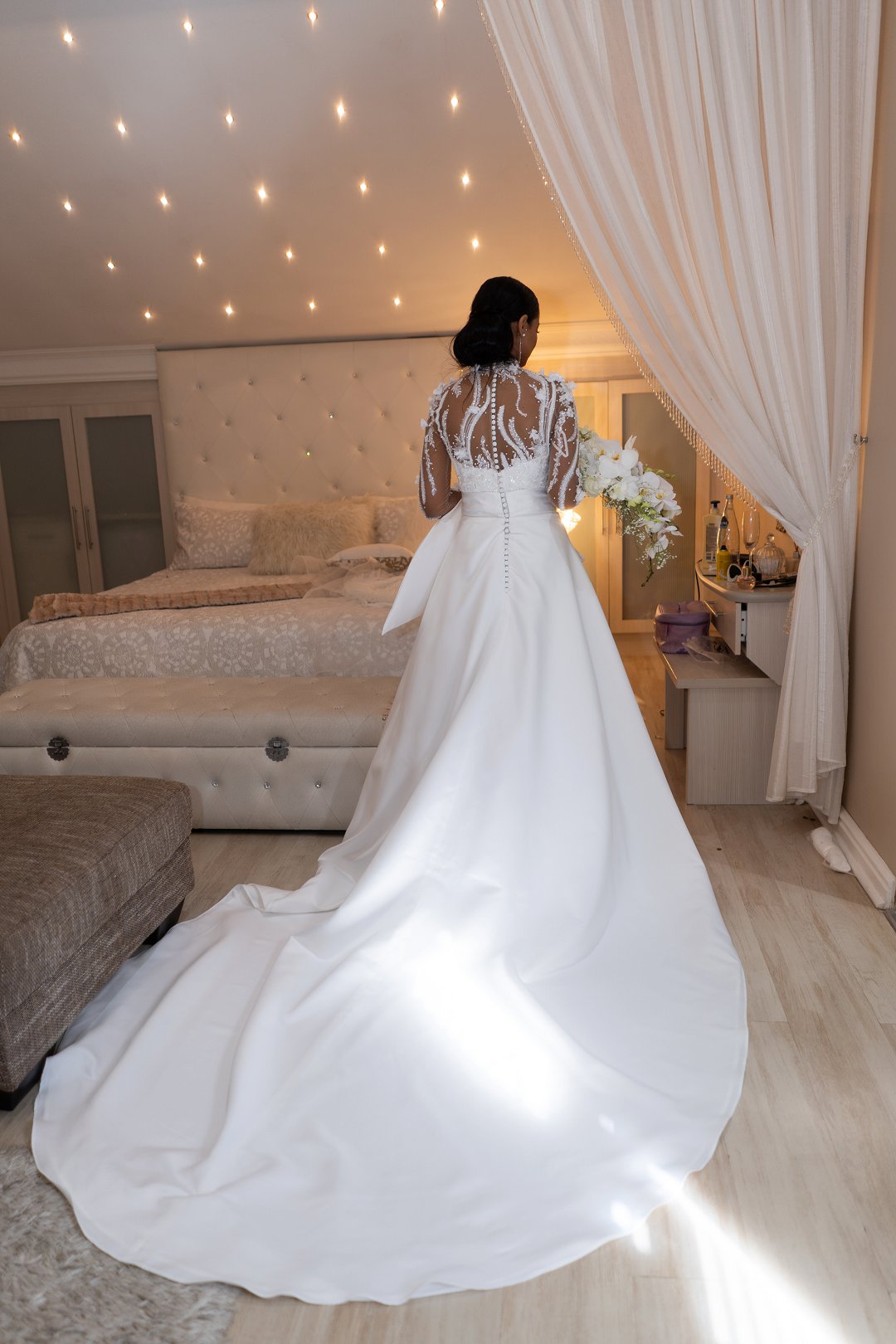Die trourok, ontwerp deur Inge Coetzer en geïnspireer deur die ikoniese Millanova ontwerp, was ’n perfekte balans van kontemporêre romantiek en couture luuksheid. Met gevormde silhoeët, fyn kant, 3D-blomme, pêrel-detail en deurskynende moue het die sagte Millanova-estetika weerspieël, terwyl die dramatiese satyn-oorrok met sy strukturele voue ’n unieke, hoë mode afwerking bygevoeg het. Die hoë halslyn, tekstuur kombinasies en vloeiende lengte het saam ’n persoonlike, pasgemaakte meesterstuk geskep wat jou styl en teenwoordigheid perfek belig.