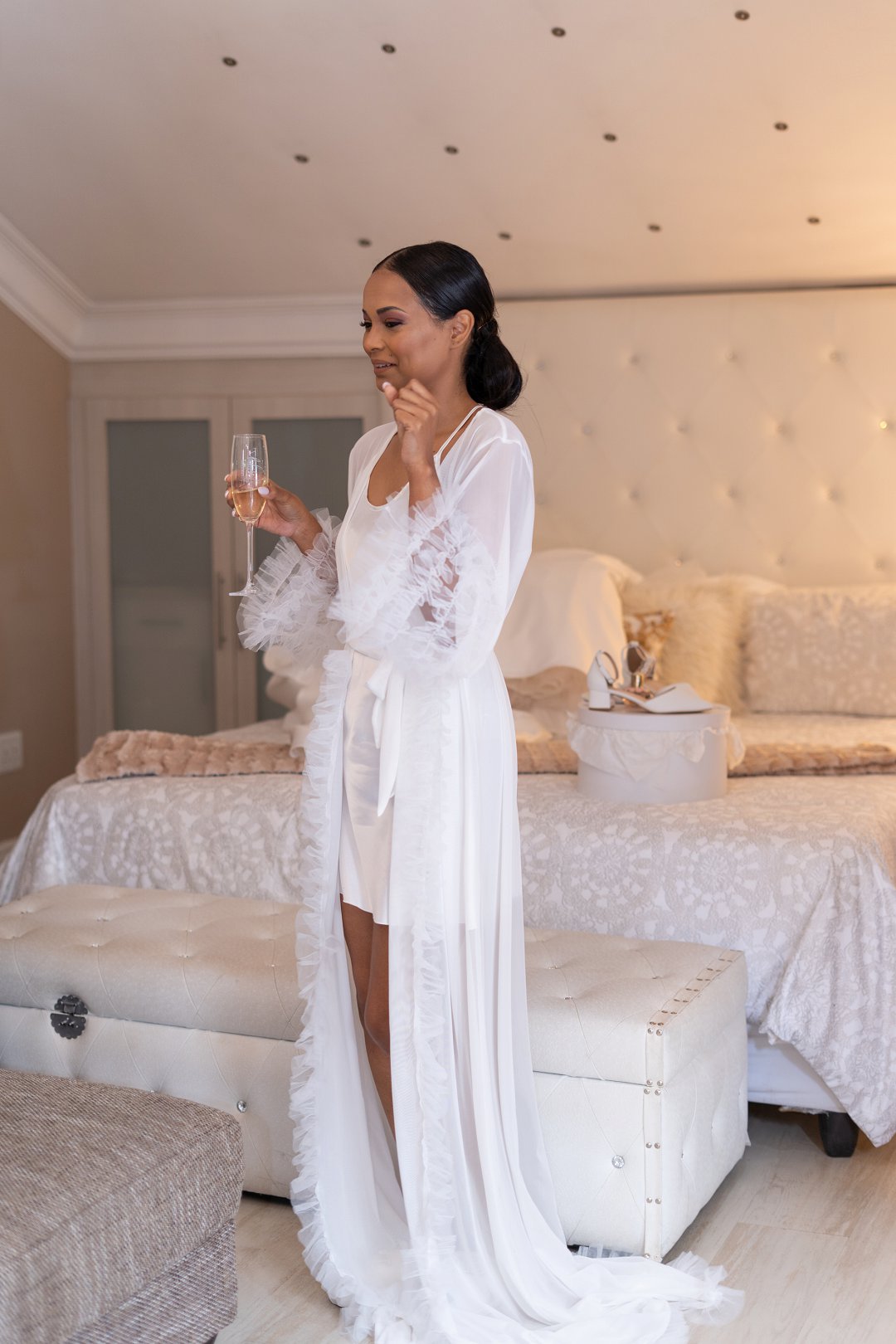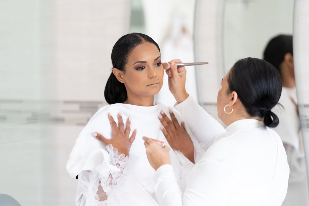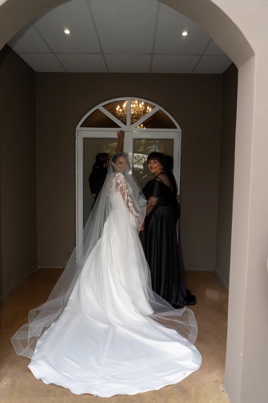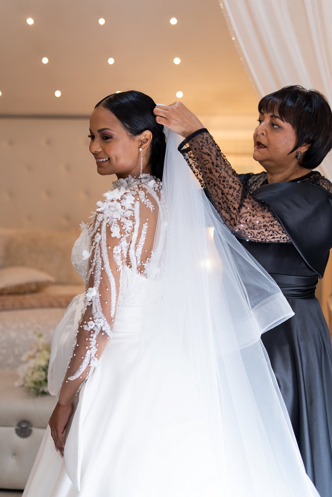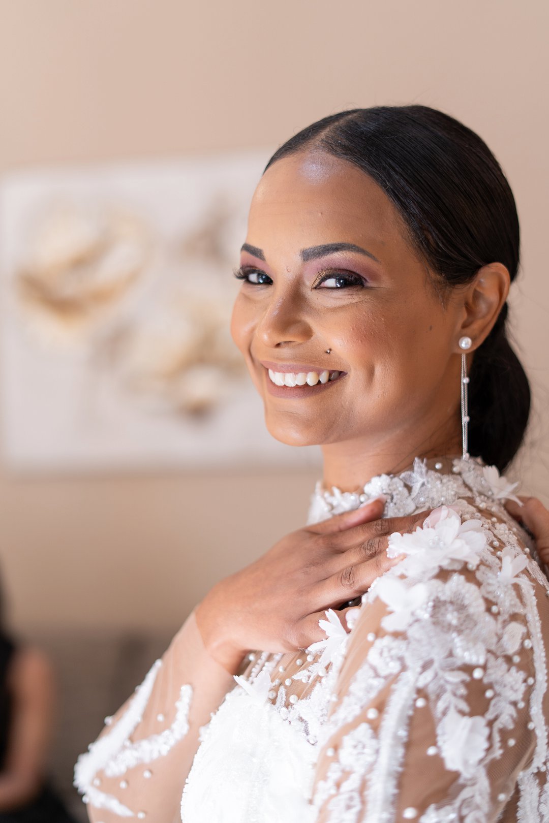 Die trourok, ontwerp deur Inge Coetzer en geïnspireer deur die ikoniese Millanova ontwerp, was ’n perfekte balans van kontemporêre romantiek en couture luuksheid. Met gevormde silhoeët, fyn kant, 3D-blomme, pêrel-detail en deurskynende moue het die sagte Millanova-estetika weerspieël, terwyl die dramatiese satyn-oorrok met sy strukturele voue ’n unieke, hoë mode afwerking bygevoeg het. Die hoë halslyn, tekstuur kombinasies en vloeiende lengte het saam ’n persoonlike, pasgemaakte meesterstuk geskep wat jou styl en teenwoordigheid perfek belig.