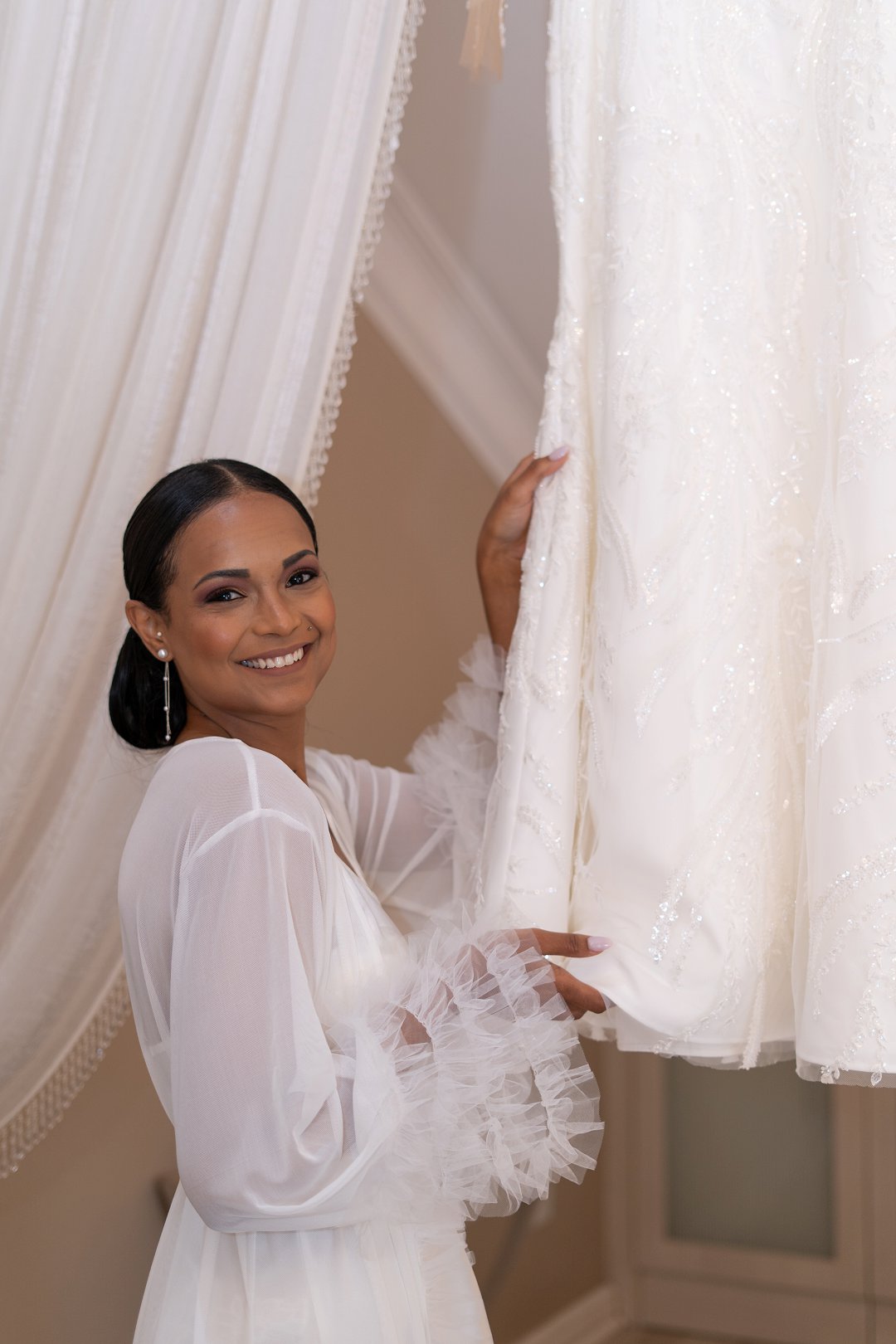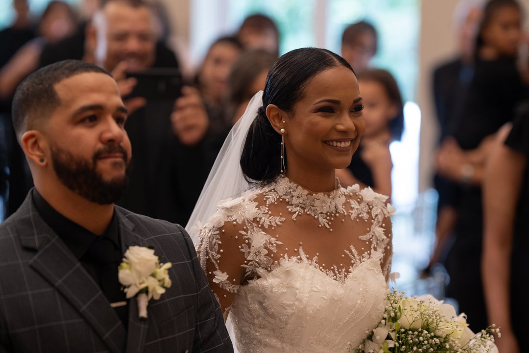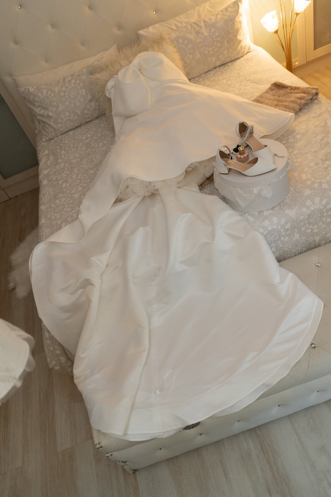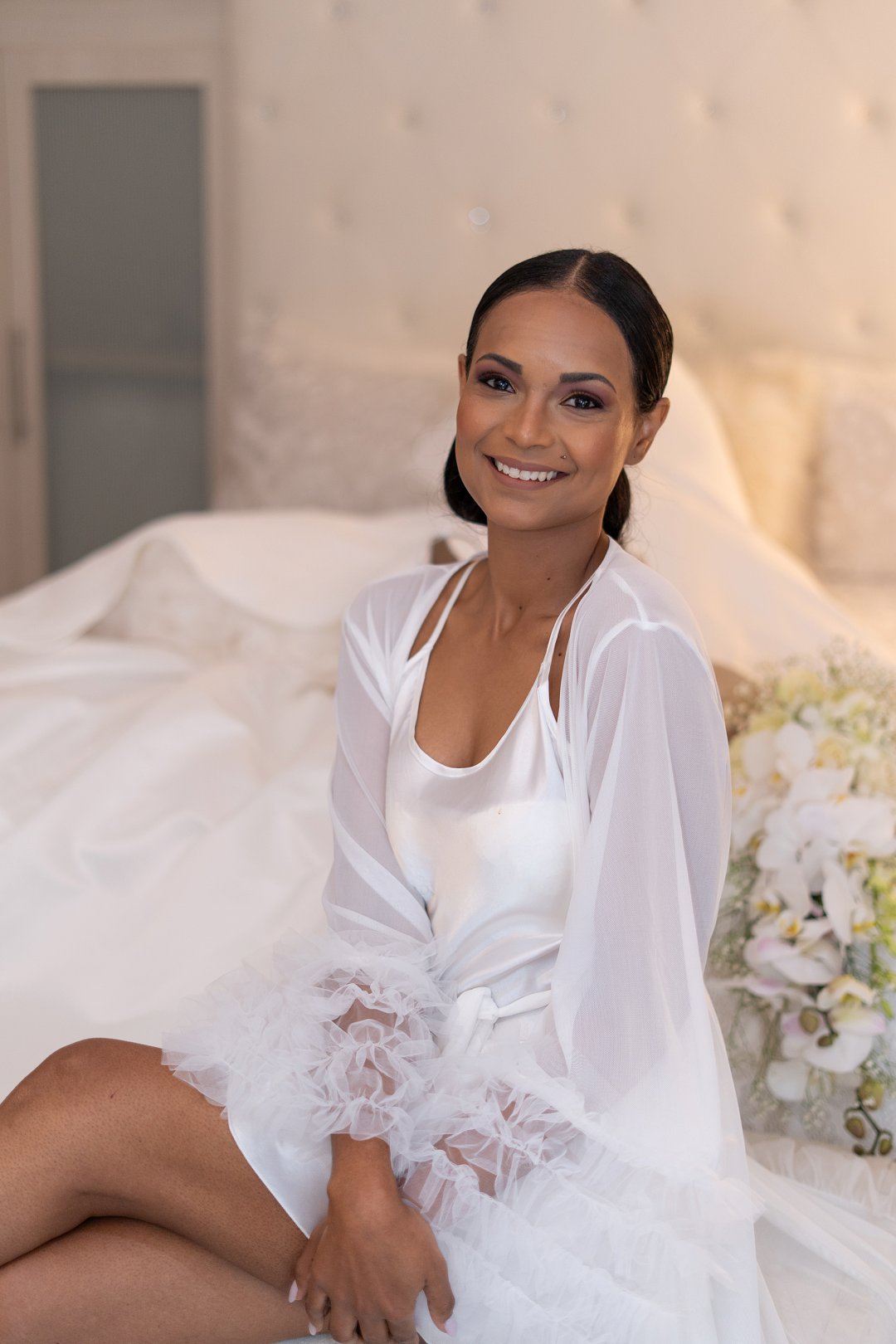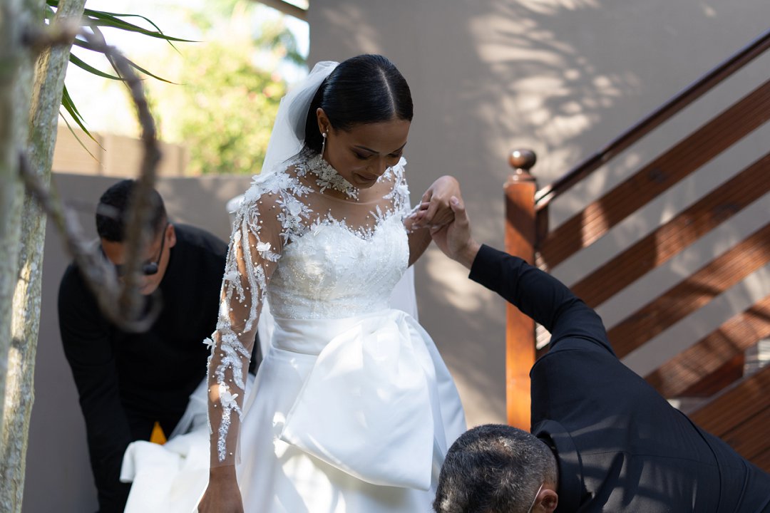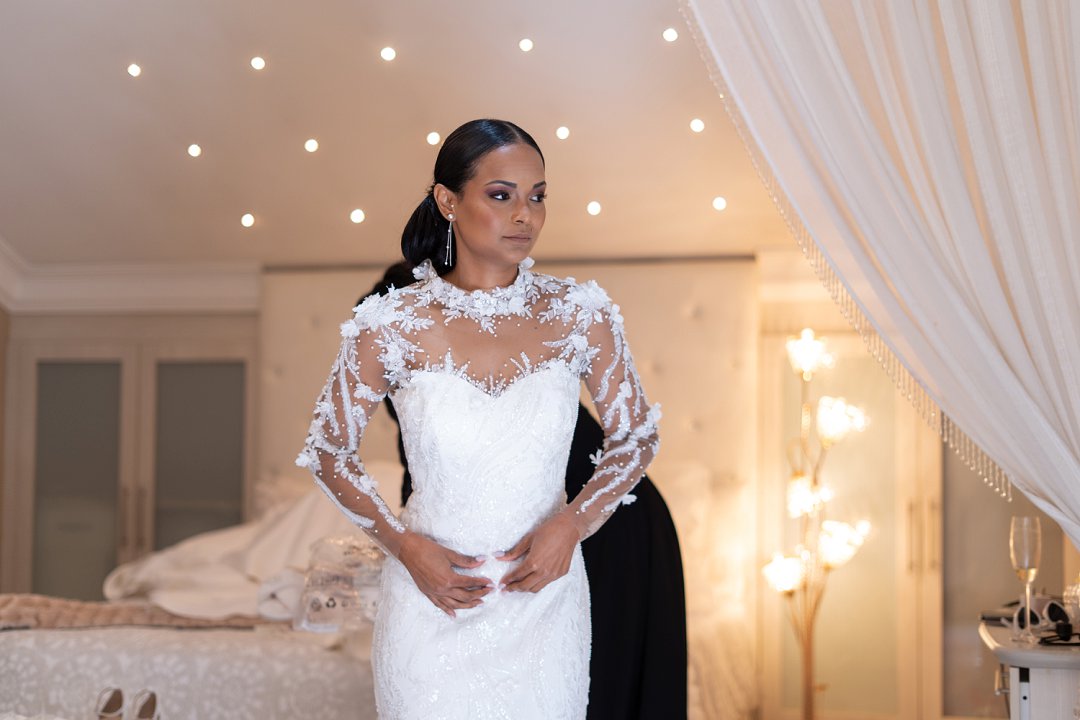 Lanine het asemrowend gelyk in ’n pasgemaakte trourok geïnspireer deur die ikoniese Millanova-estetika. Haar trourok het 3D-blomme, pêrel-detail en deurskynende moue gekombineer met ’n dramatiese satyn-oorrok. Die kombinasie van teksture en strukturele voue het ’n unieke couture afwerking aan haar voorkoms gegee.
