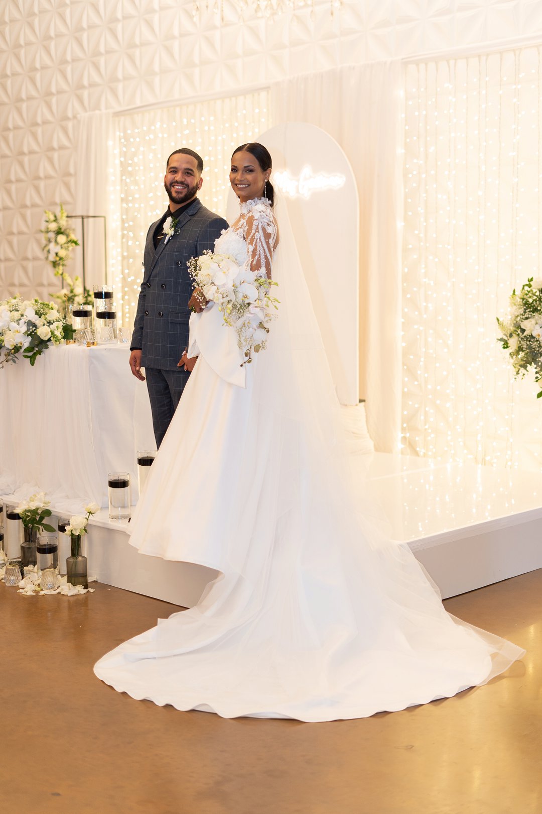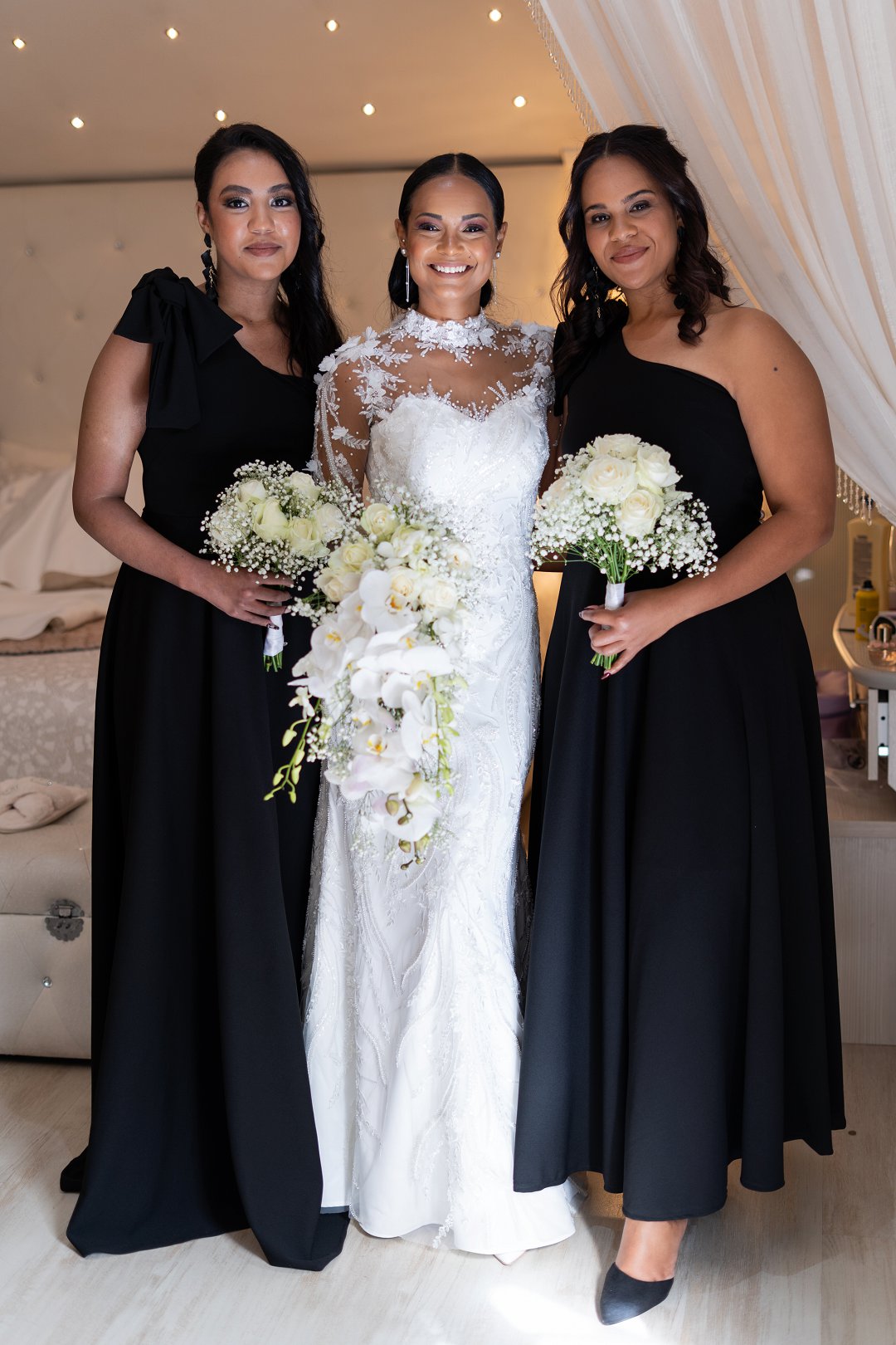 Die kleurskema het op ’n kontemporêre, minimalistiese wit-en-swart palet gebou wat onmiddellik ’n gevoel van luuksheid en tydlose elegansie geskep het. Die suiwer wit elemente — van jou rok tot die sagte blomme en tafel elemente — het ’n skoon, dromerige lig oor die hele venue gebring, terwyl die swart aksente ’n stylvolle kontras geskep het wat die dekor verfyn en kontemporêr laat voel het. Hierdie klassieke kleurkombinasie het ’n rustige, gesofistikeerde atmosfeer geskep waarin elke detail skoon, modern en doelbewus gelyk het. Dit was die perfekte balans tussen eenvoud, luuksheid en hoë mode elegansie.