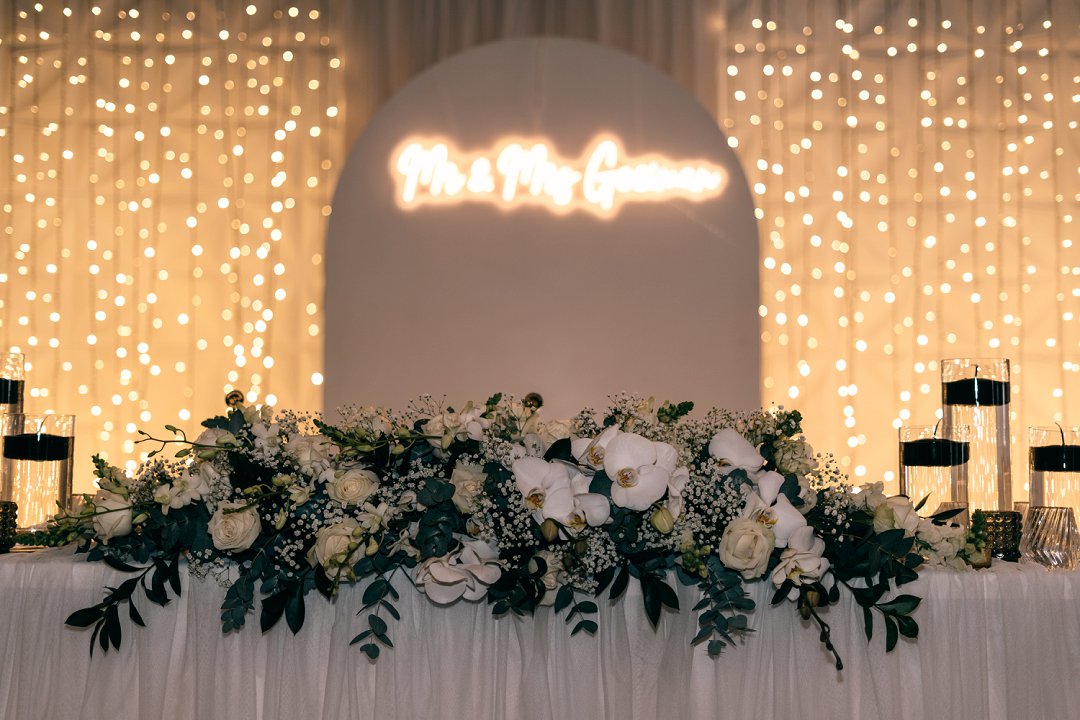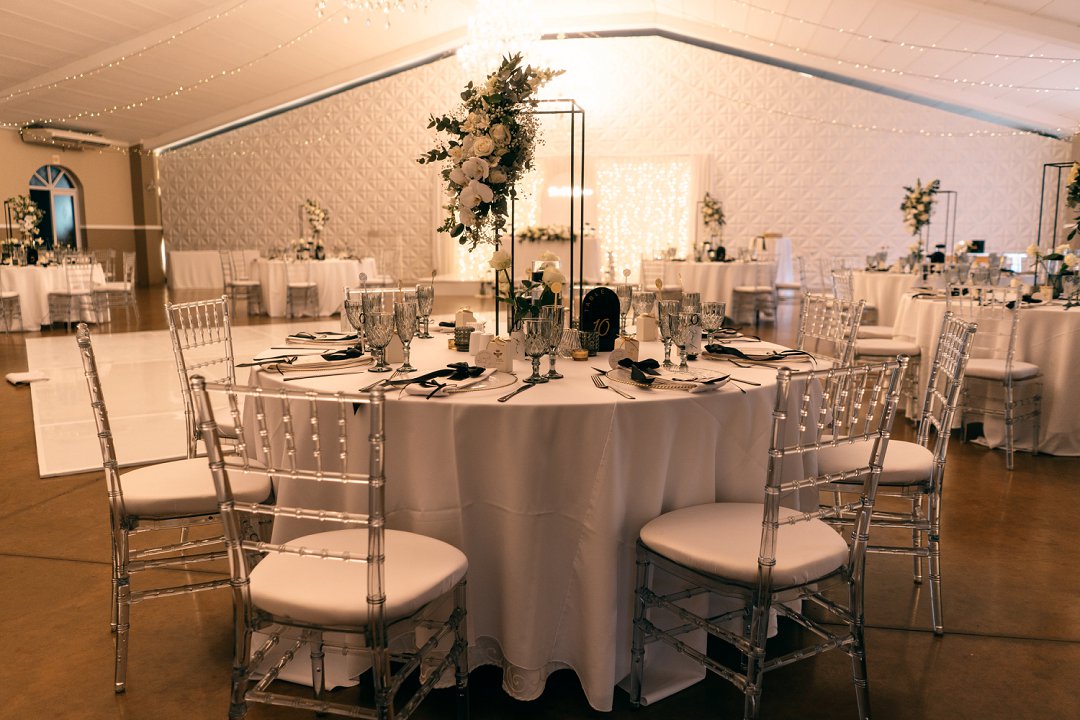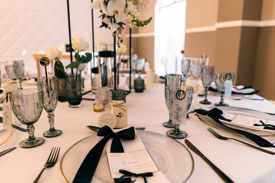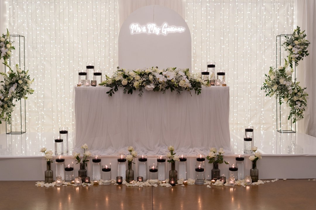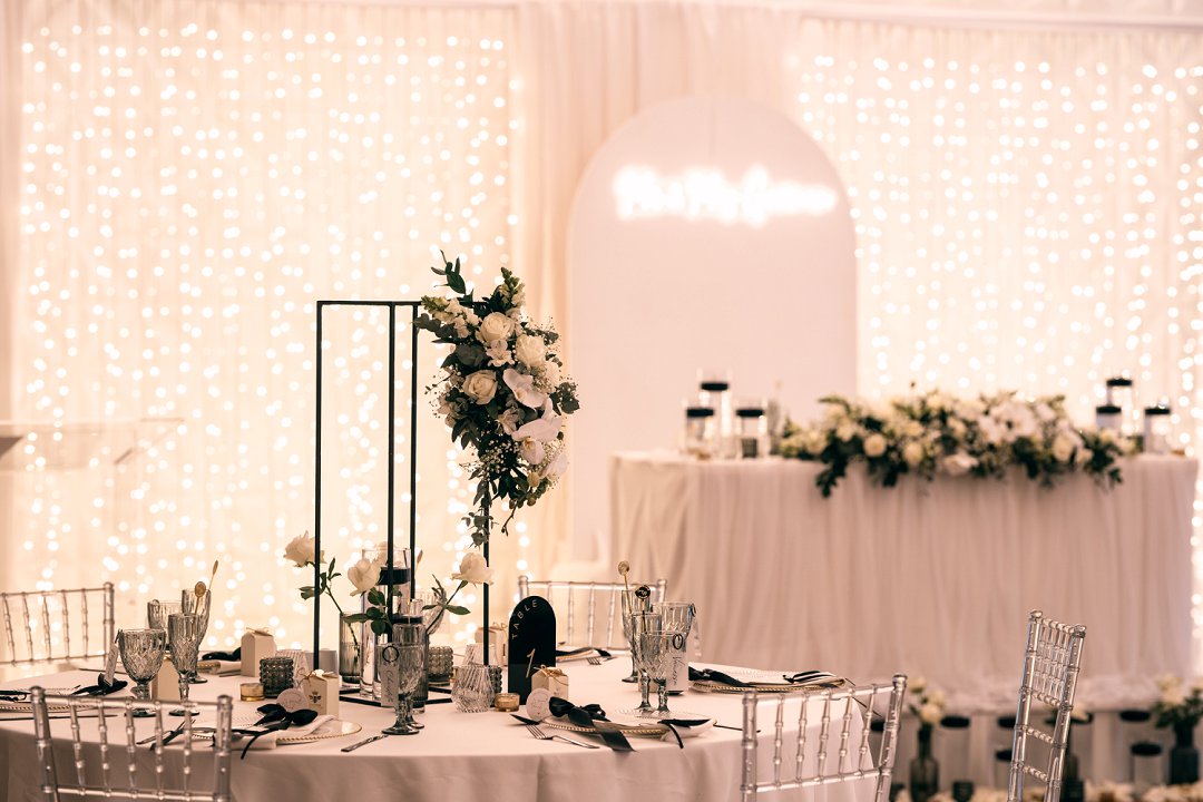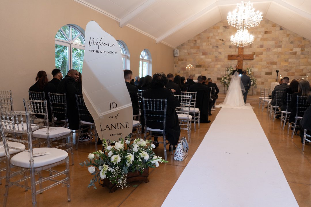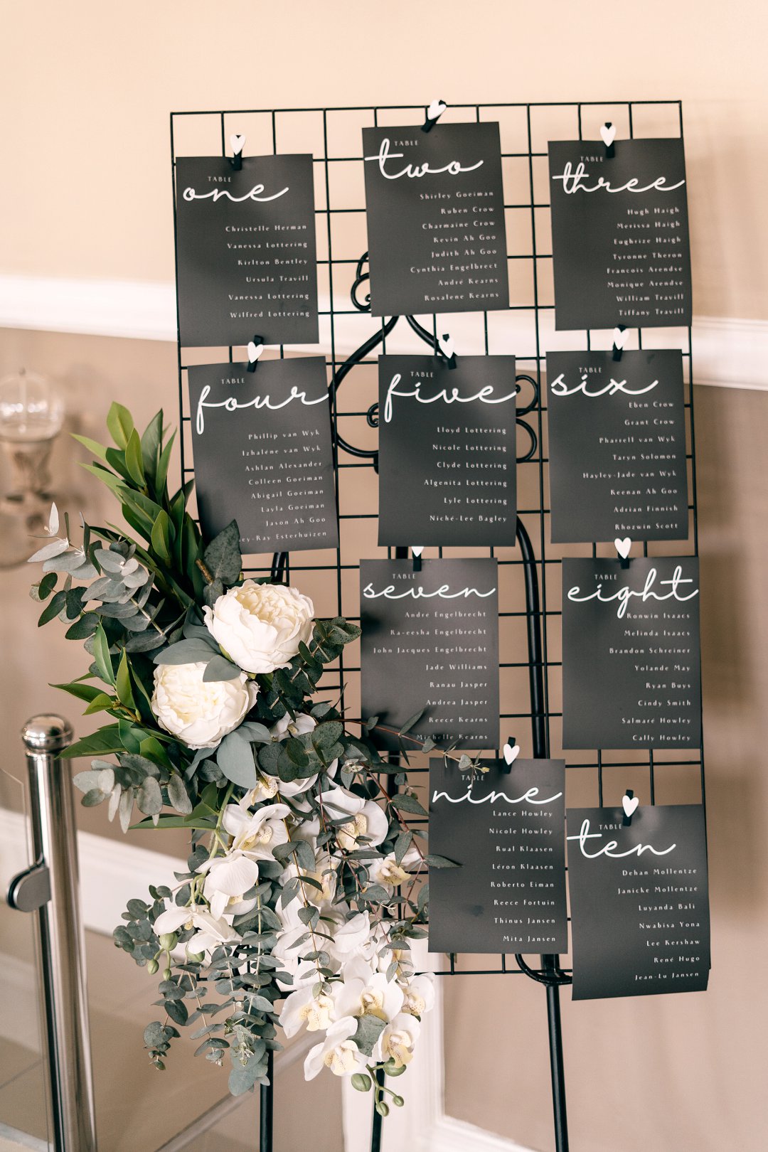 Die dekor het ’n minimalistiese swart-en-wit palet gevolg. Vars wit blomme en tafel elemente het ’n skoon, kontemporêre gevoel geskep, terwyl swart aksente ’n stylvolle kontras gebied het. Elke detail is doelbewus gekies om ’n rustige, gesofistikeerde atmosfeer te skep waar liefde die middelpunt kon wees.