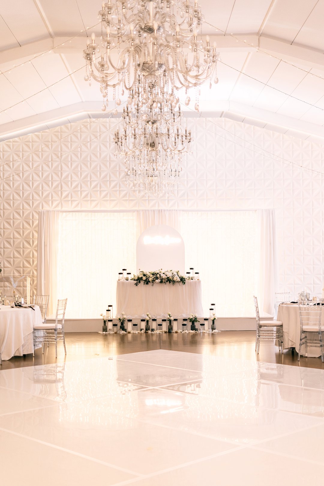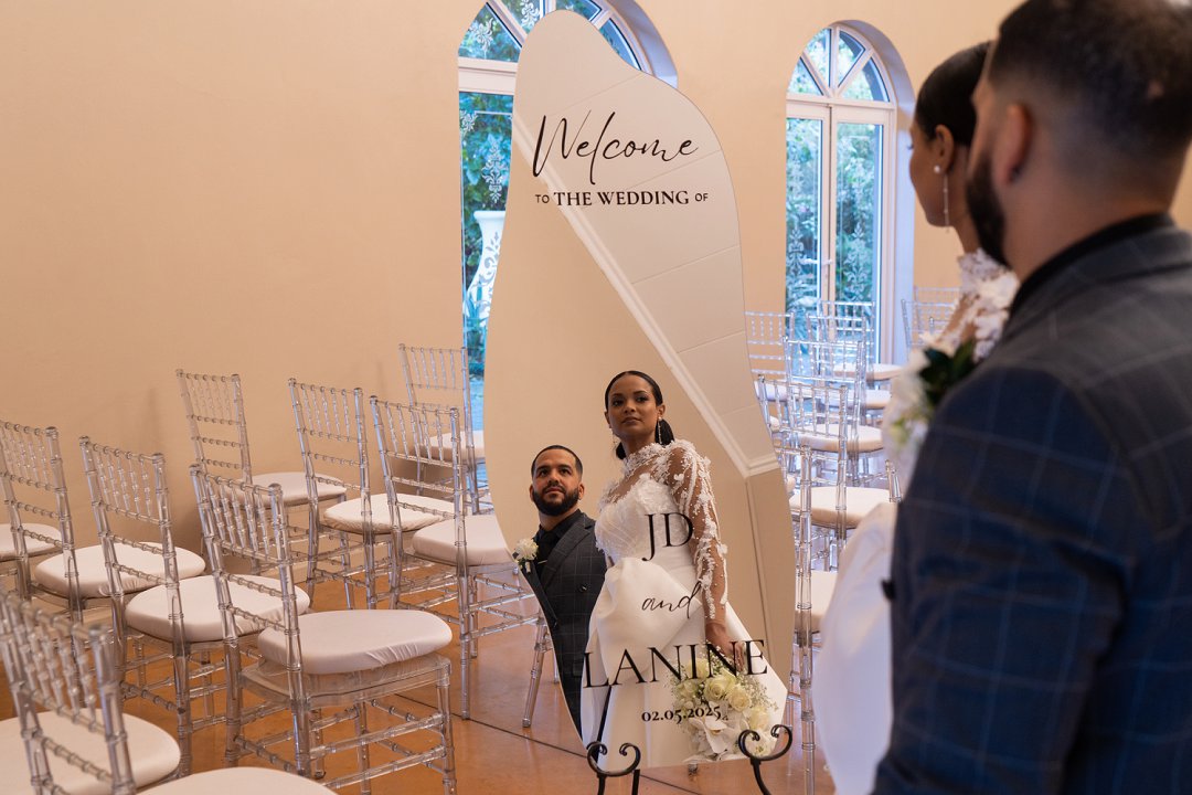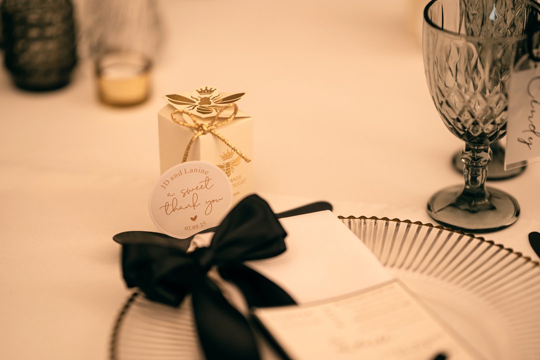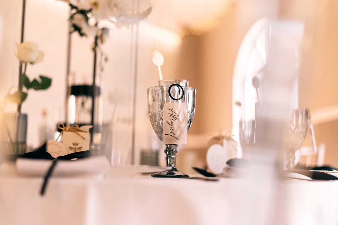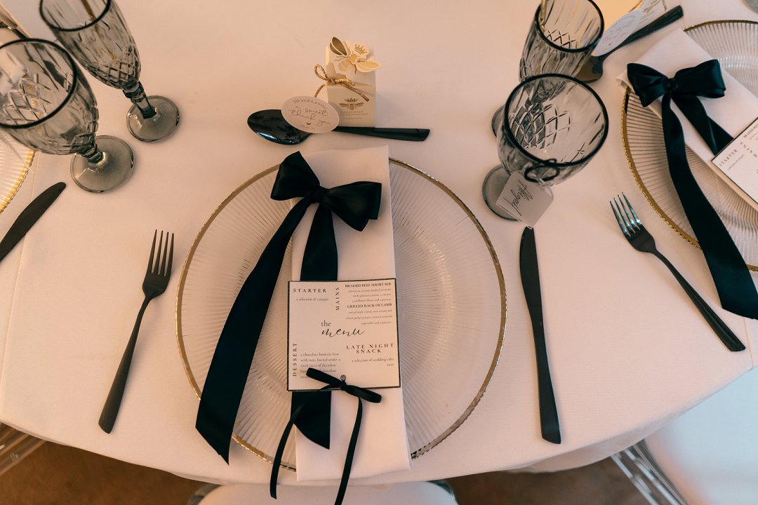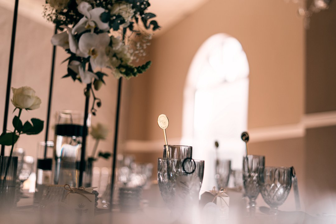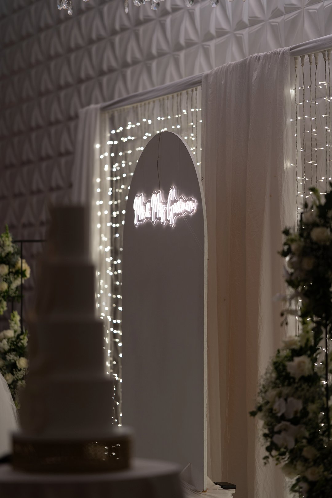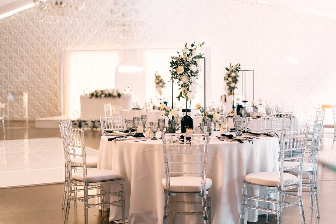 Die dekor het ’n minimalistiese swart-en-wit palet gevolg. Vars wit blomme en tafel elemente het ’n skoon, kontemporêre gevoel geskep, terwyl swart aksente ’n stylvolle kontras gebied het. Elke detail is doelbewus gekies om ’n rustige, gesofistikeerde atmosfeer te skep waar liefde die middelpunt kon wees.