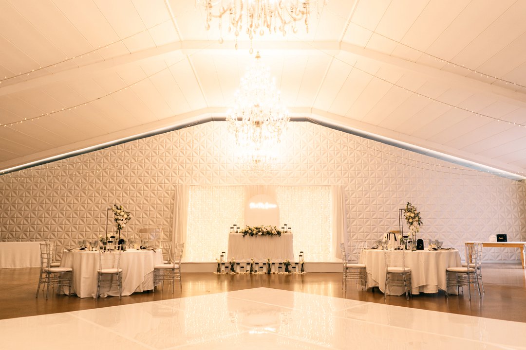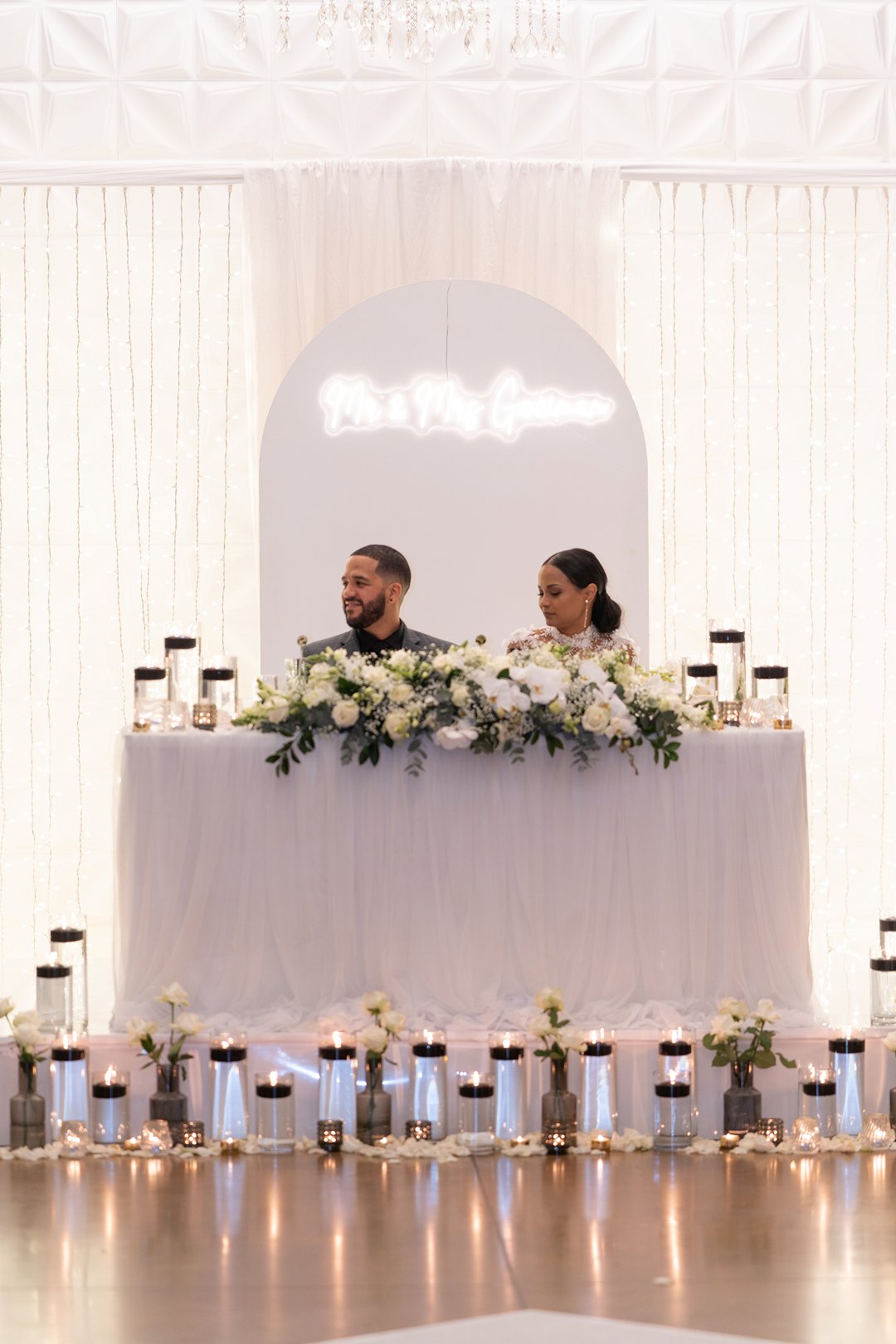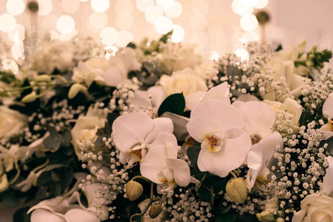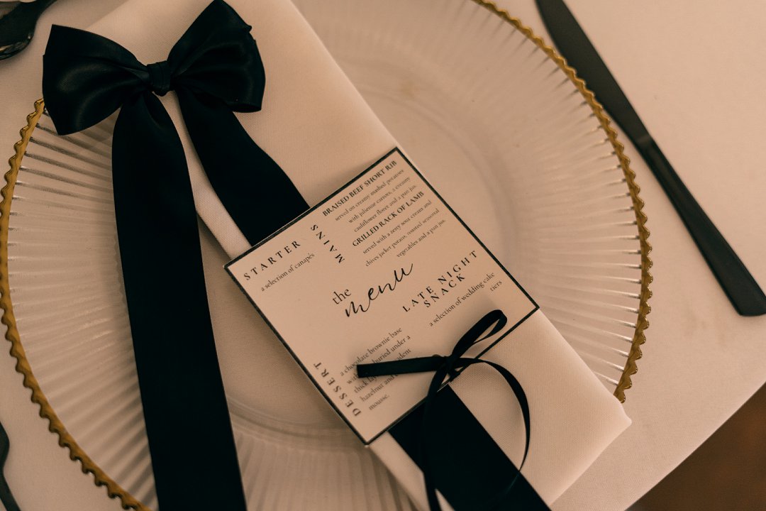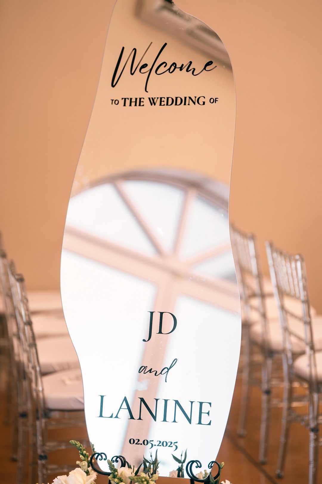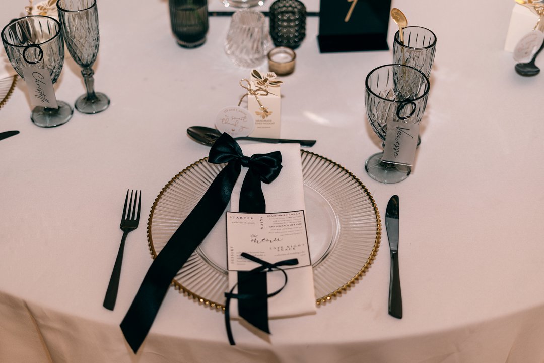 Die dekor het ’n minimalistiese swart-en-wit palet gevolg. Vars wit blomme en tafel elemente het ’n skoon, kontemporêre gevoel geskep, terwyl swart aksente ’n stylvolle kontras gebied het. Elke detail is doelbewus gekies om ’n rustige, gesofistikeerde atmosfeer te skep waar liefde die middelpunt kon wees.