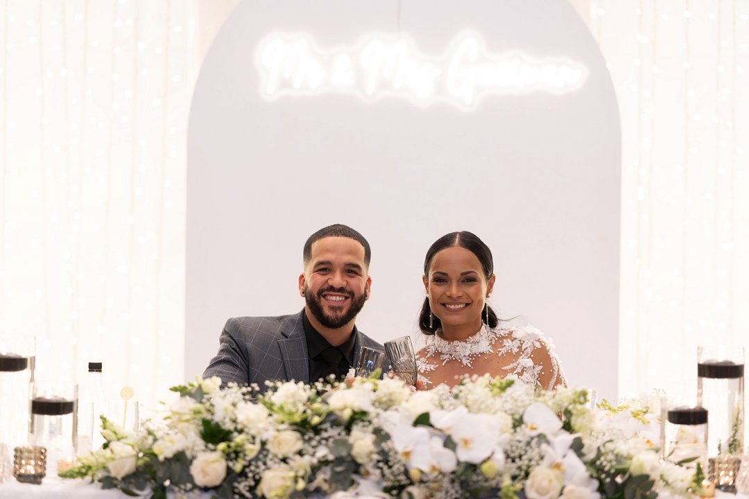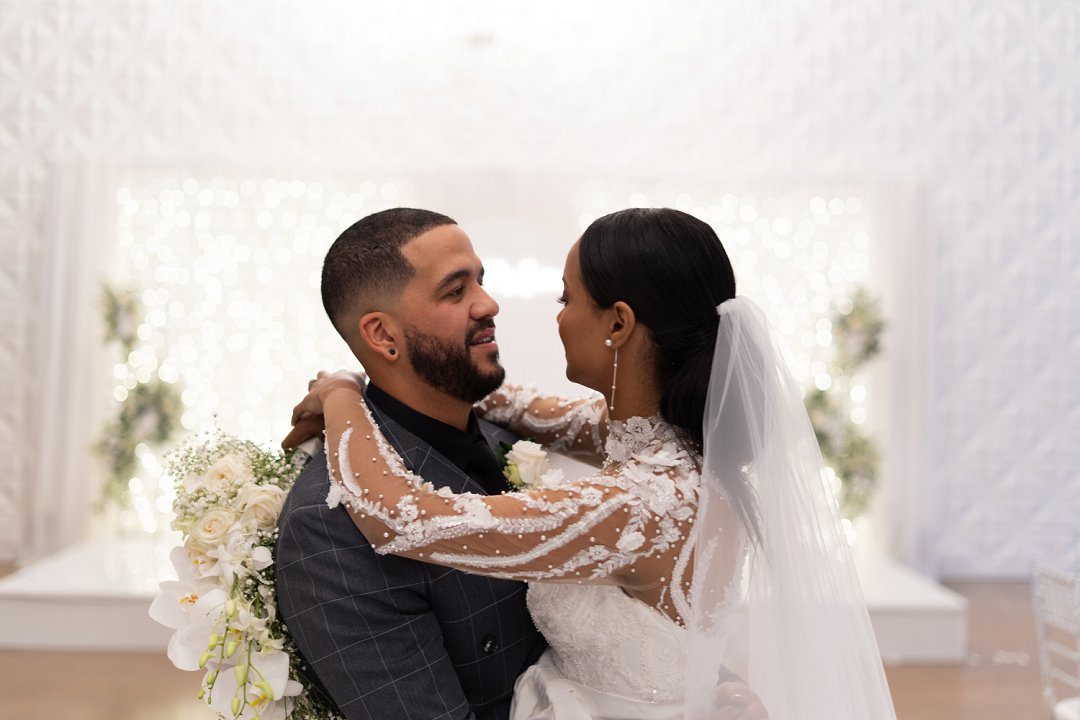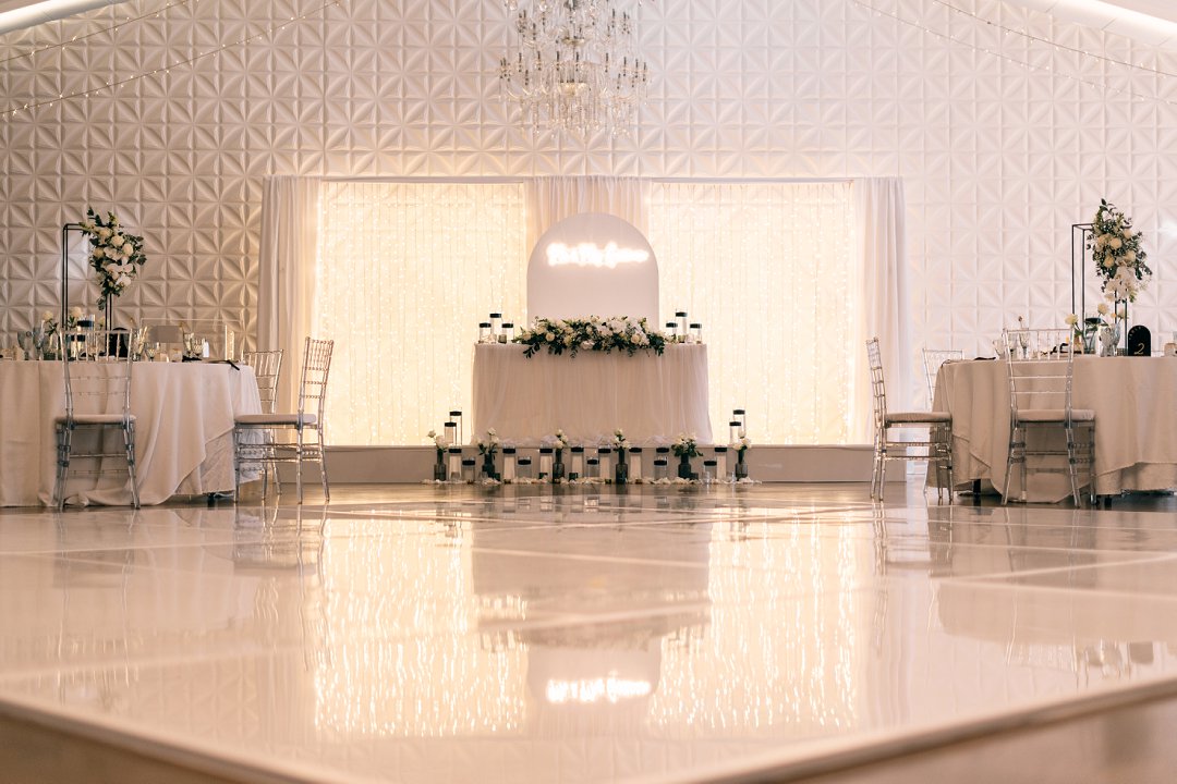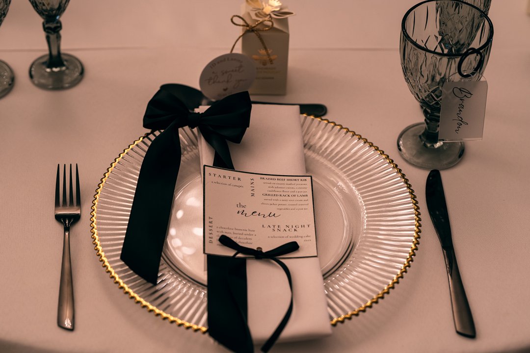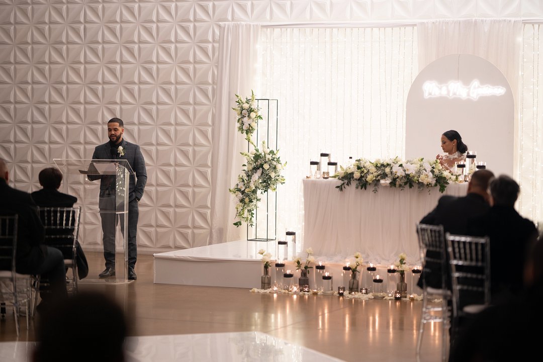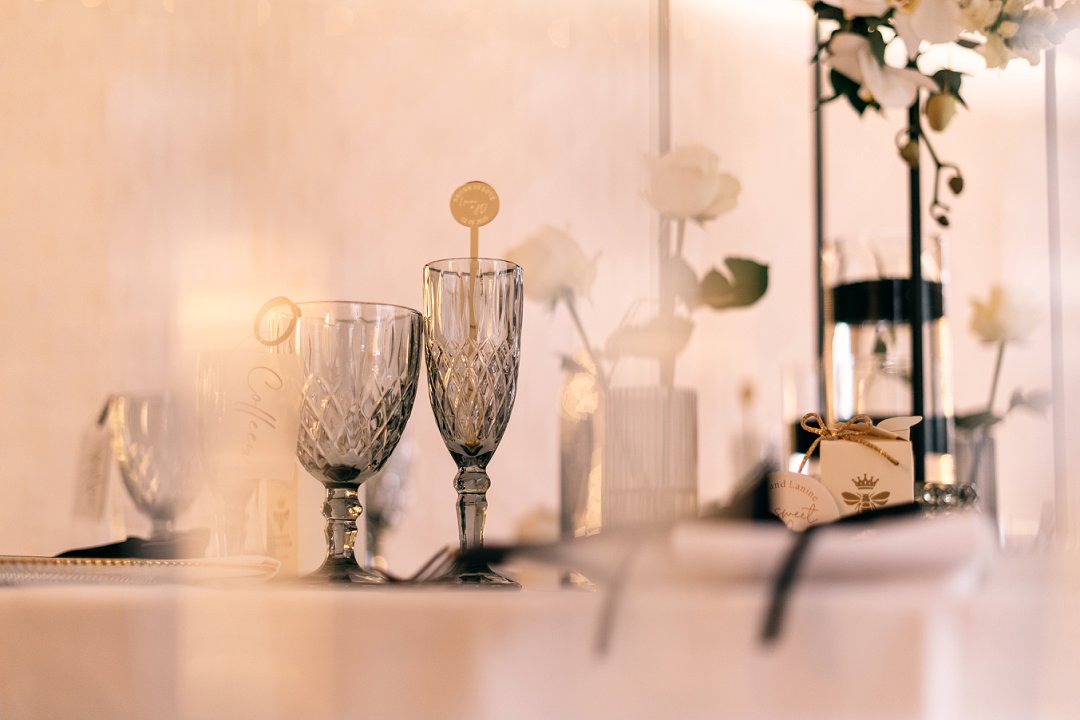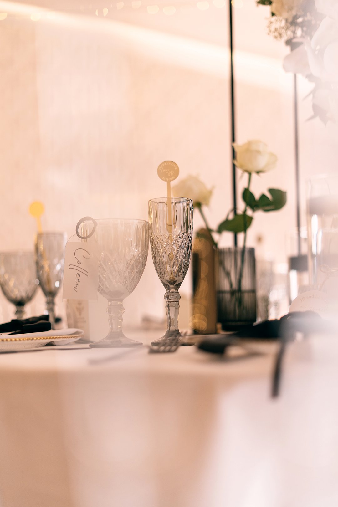 Die dekor het ’n minimalistiese swart-en-wit palet gevolg. Vars wit blomme en tafel elemente het ’n skoon, kontemporêre gevoel geskep, terwyl swart aksente ’n stylvolle kontras gebied het. Elke detail is doelbewus gekies om ’n rustige, gesofistikeerde atmosfeer te skep waar liefde die middelpunt kon wees.