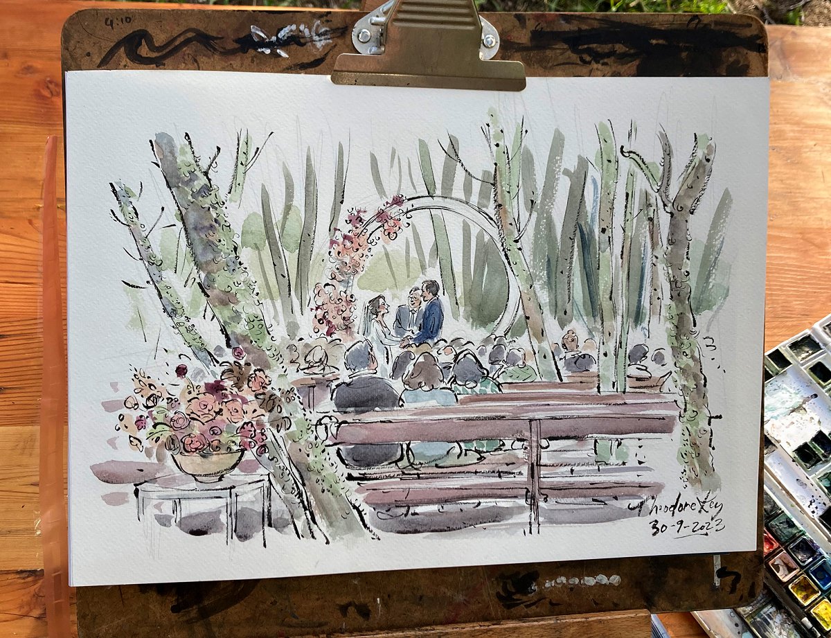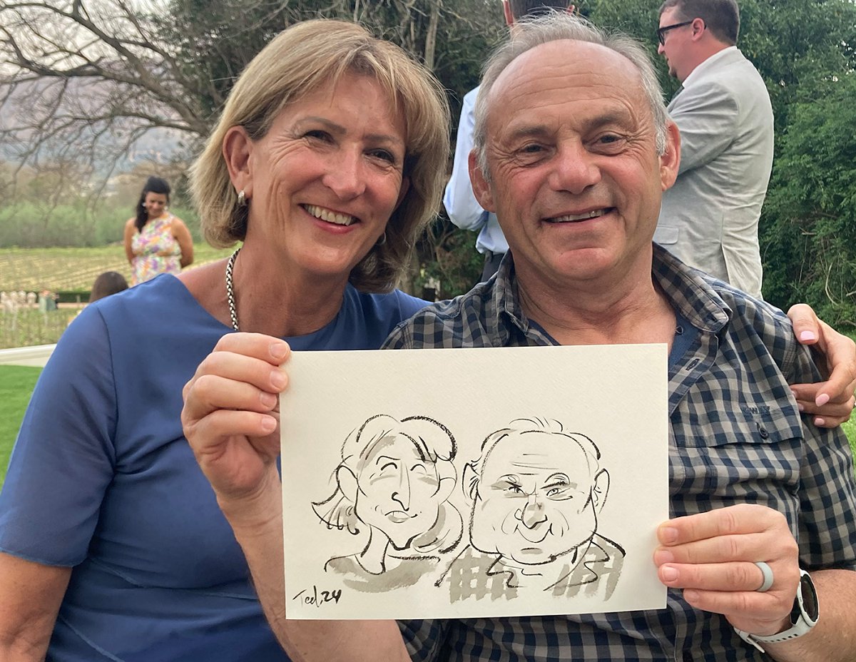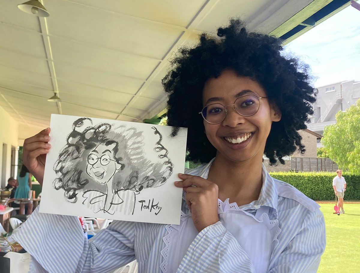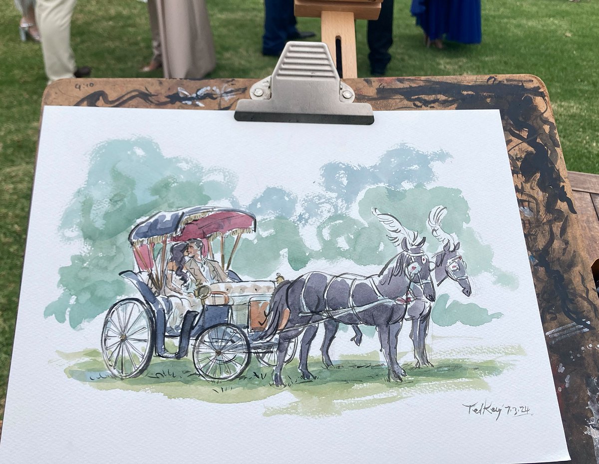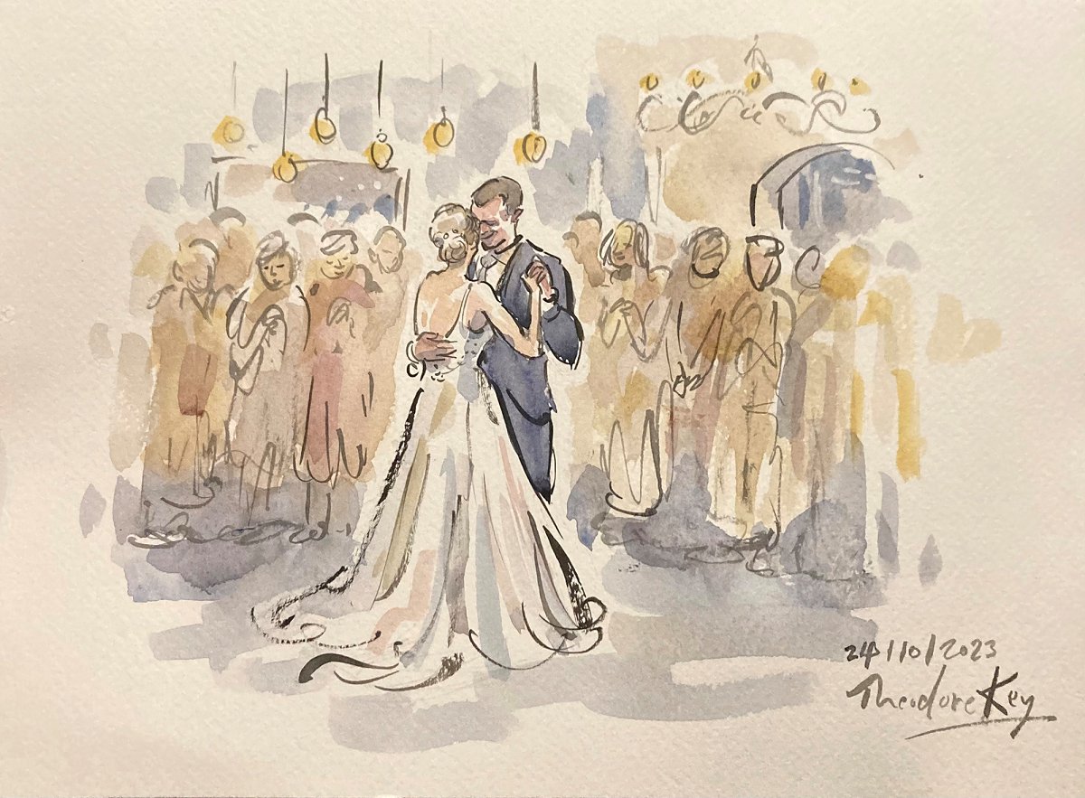 Ted verskaf regstreekse impressionistiese en naturalistiese toneel sketse (seremonies, eerste danse, kanapees uur) wat die spesiale oomblik vasvang, sowel as meer humoristiese portrette tydens die kanapees en onthaal wat dien as beide vermaak en ʼn geskenk aan die trou gas. Hy het by dosyne troues en duisende feestelike gesigte geteken. Jou gaste sal ook nie te lank hoef te sit en die sitplek warm maak nie.