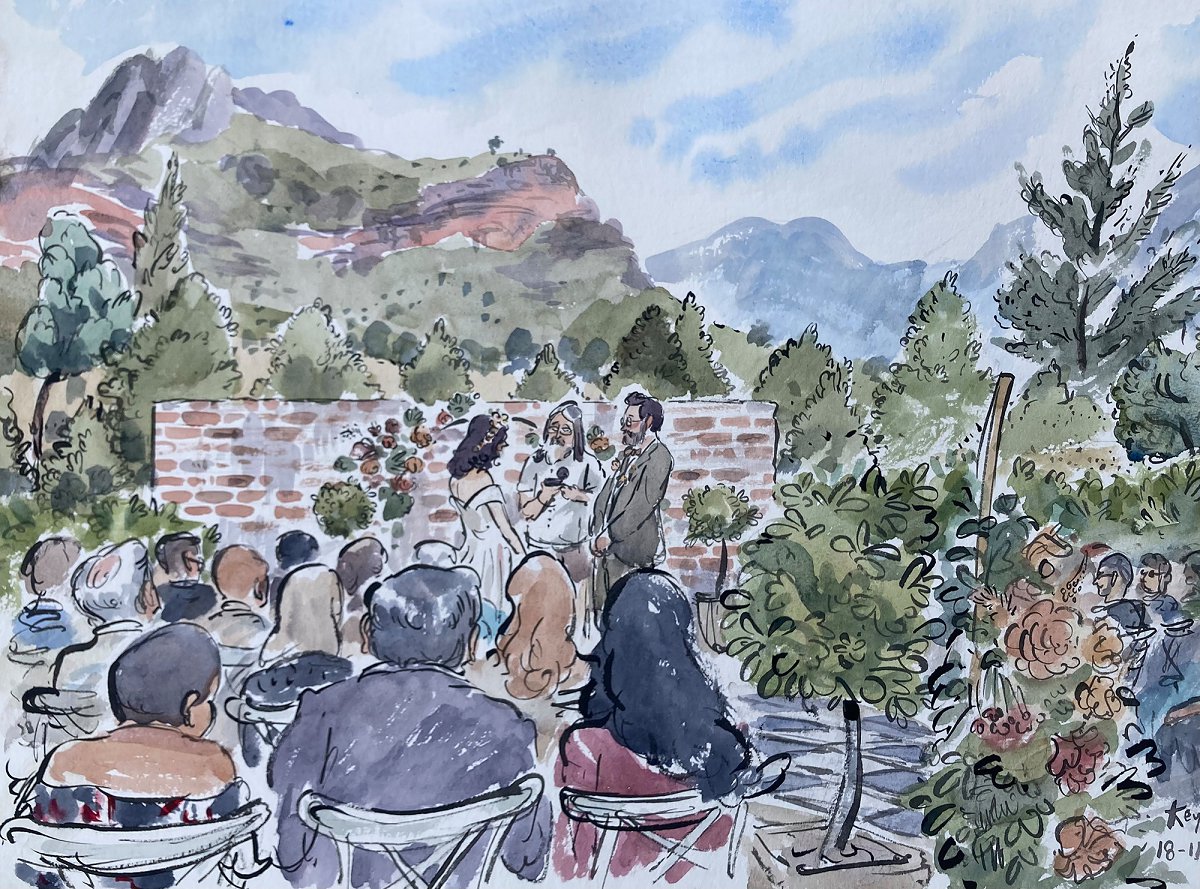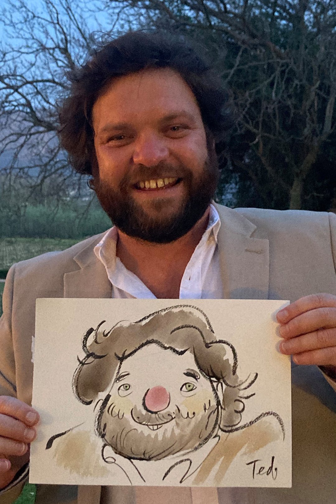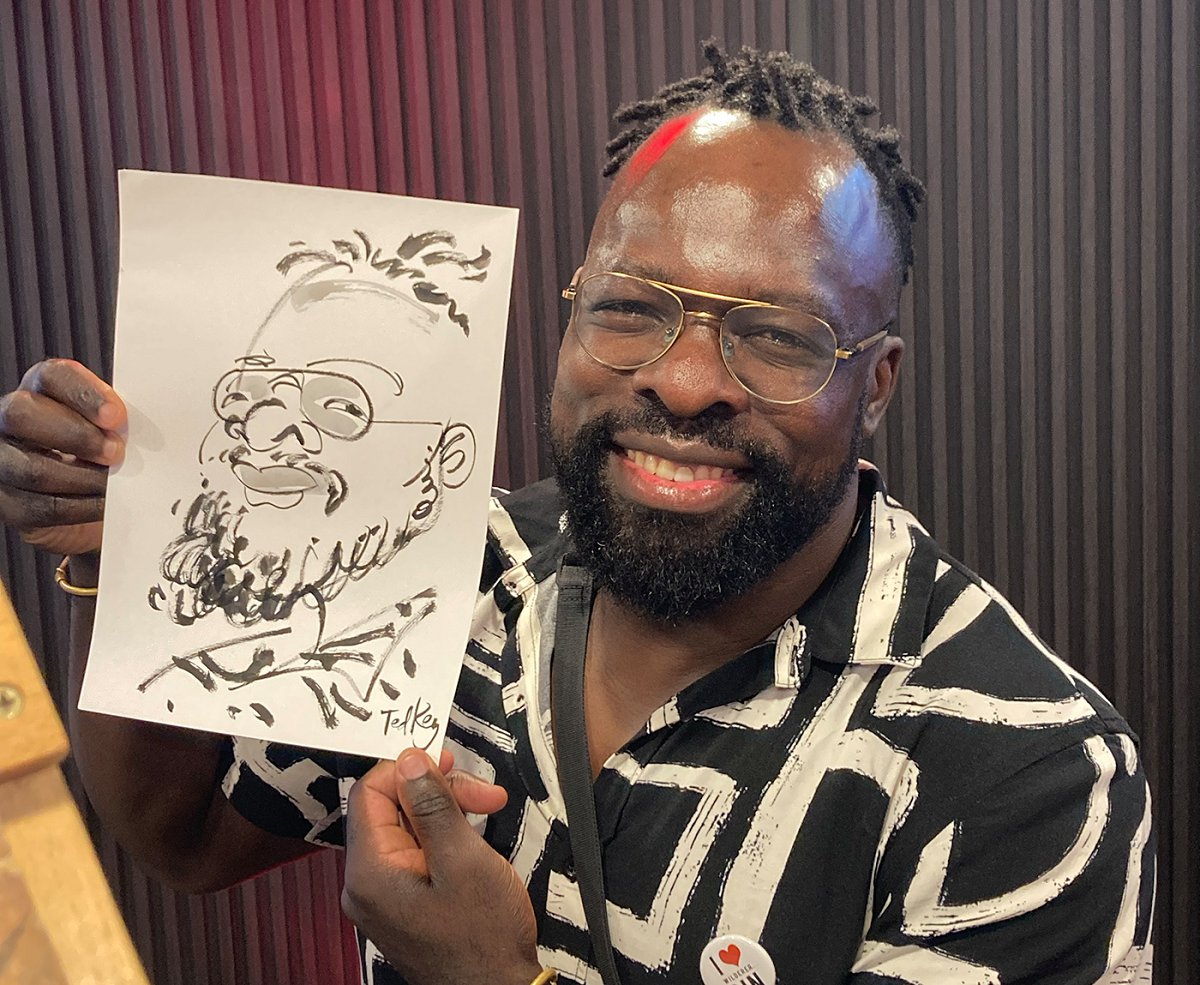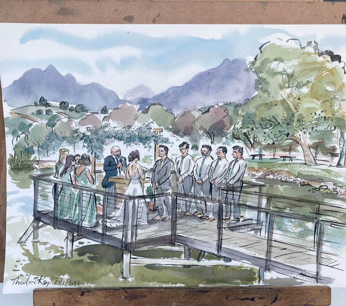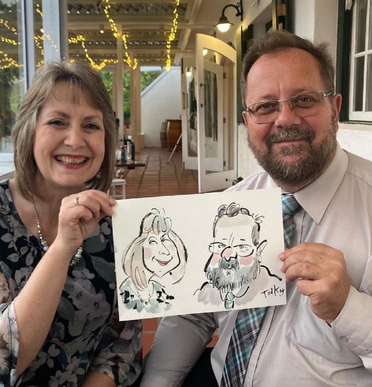 Ted verskaf regstreekse impressionistiese en naturalistiese toneel sketse (seremonies, eerste danse, kanapees uur) wat die spesiale oomblik vasvang, sowel as meer humoristiese portrette tydens die kanapees en onthaal wat dien as beide vermaak en ʼn geskenk aan die trou gas. Hy het by dosyne troues en duisende feestelike gesigte geteken. Jou gaste sal ook nie te lank hoef te sit en die sitplek warm maak nie.