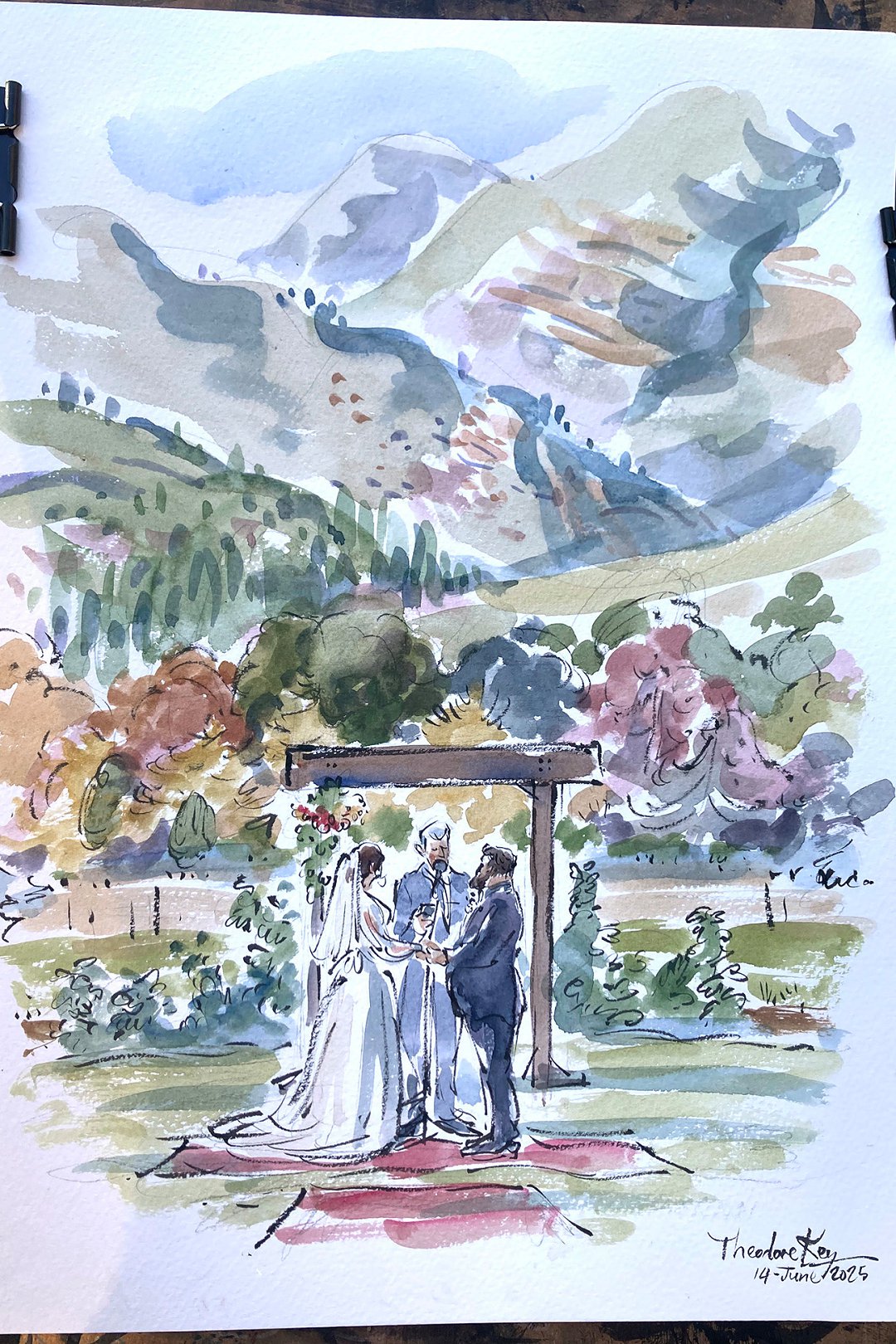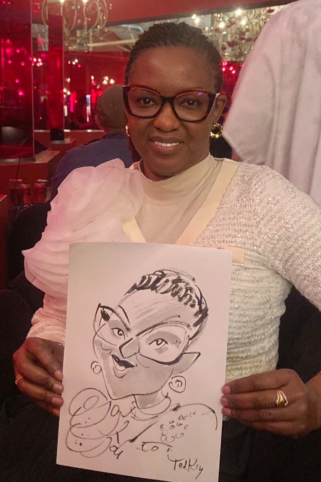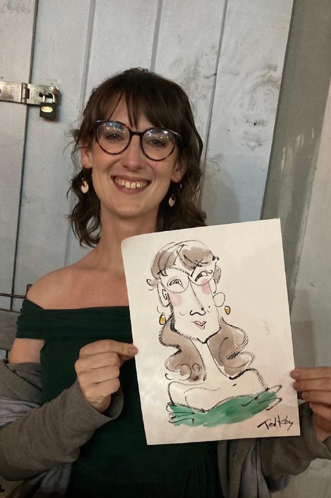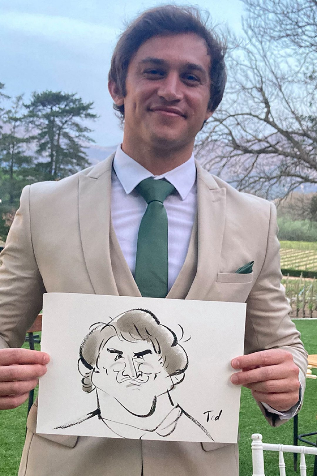 Ted verskaf regstreekse impressionistiese en naturalistiese toneel sketse (seremonies, eerste danse, kanapees uur) wat die spesiale oomblik vasvang, sowel as meer humoristiese portrette tydens die kanapees en onthaal wat dien as beide vermaak en ʼn geskenk aan die trou gas. Hy het by dosyne troues en duisende feestelike gesigte geteken. Jou gaste sal ook nie te lank hoef te sit en die sitplek warm maak nie.