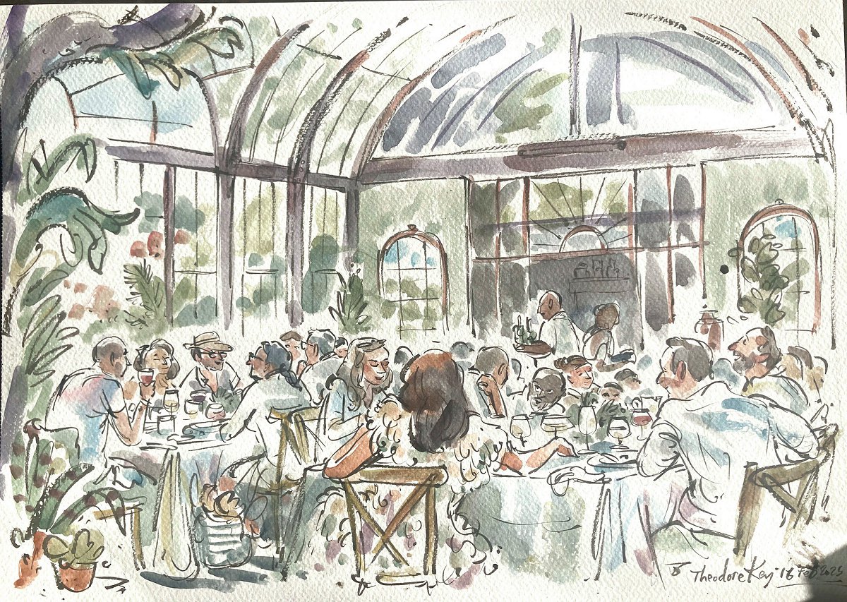 Ted se impressionistiese toneel sketse, wat in ink met waterverf bygevoeg is, neem gewoonlik ʼn uur en hy kan maklik na die kanapees toe beweeg om verder toneel sketse of portrette te voltooi. Ted kan ook meer gedetailleerde seremonie.