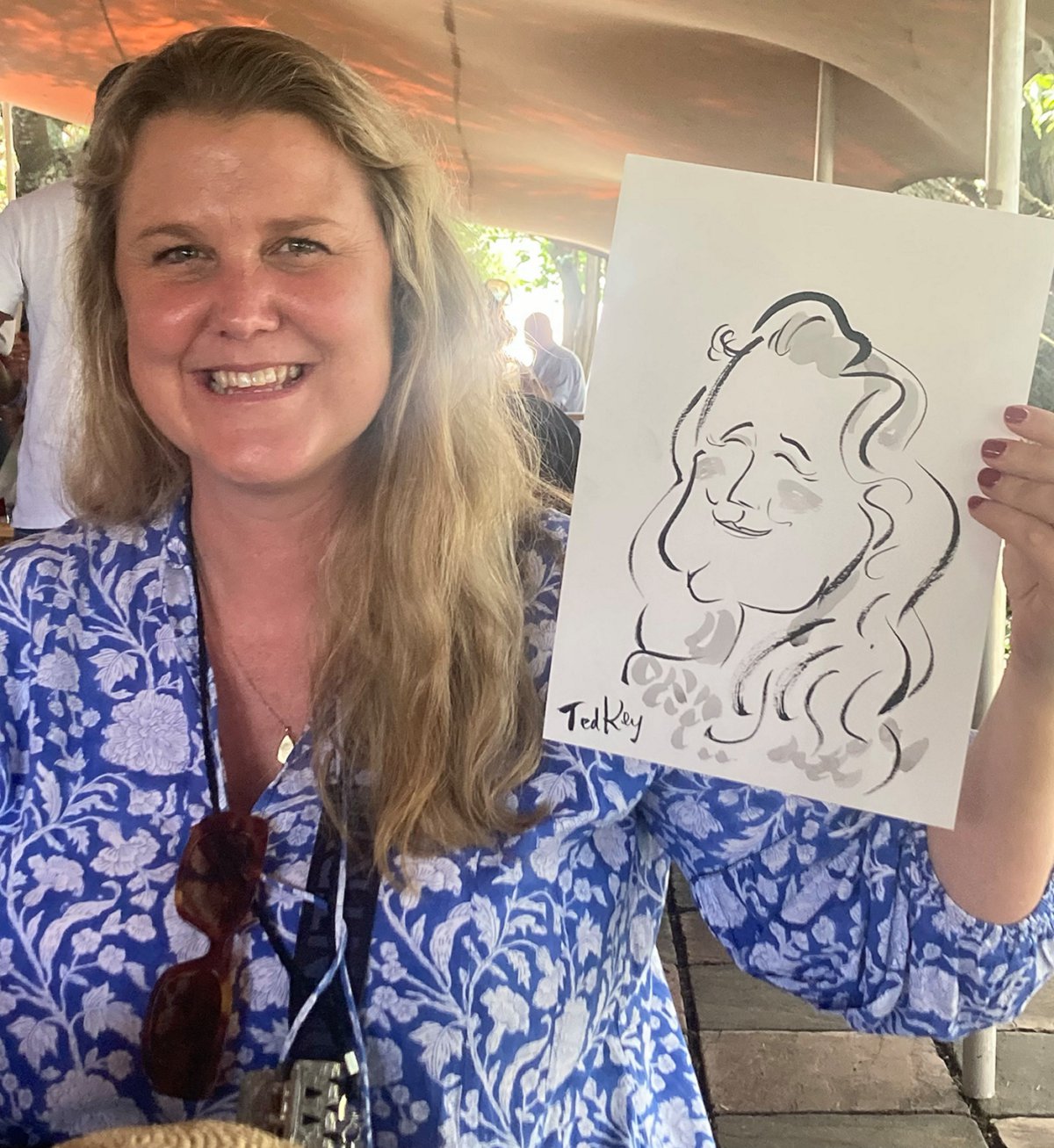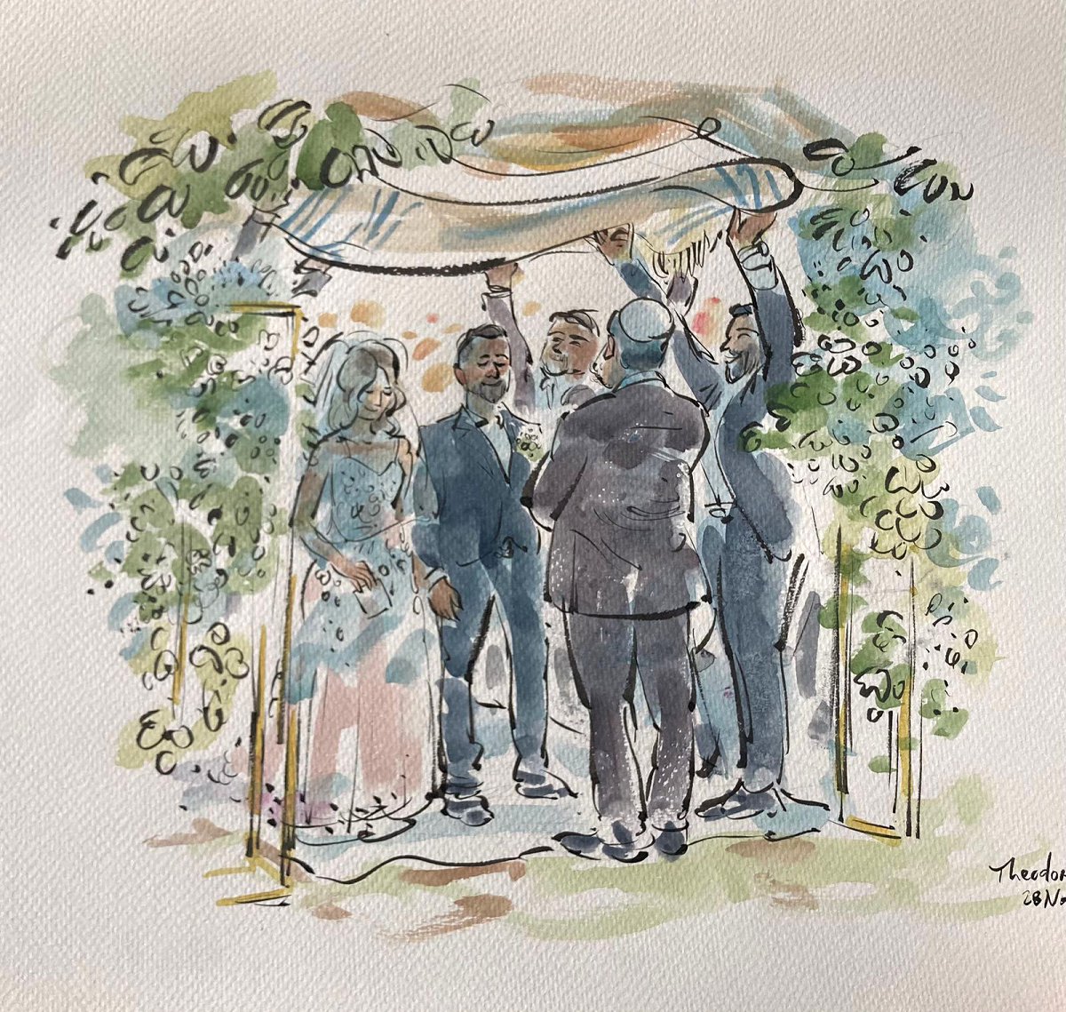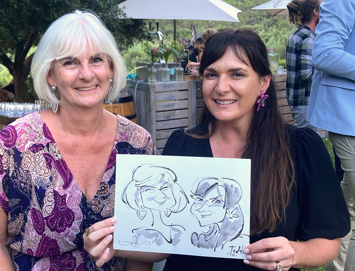 Ted verskaf regstreekse impressionistiese en naturalistiese toneel sketse (seremonies, eerste danse, kanapees uur) wat die spesiale oomblik vasvang, sowel as meer humoristiese portrette tydens die kanapees en onthaal wat dien as beide vermaak en ʼn geskenk aan die trou gas. Hy het by dosyne troues en duisende feestelike gesigte geteken. Jou gaste sal ook nie te lank hoef te sit en die sitplek warm maak nie.